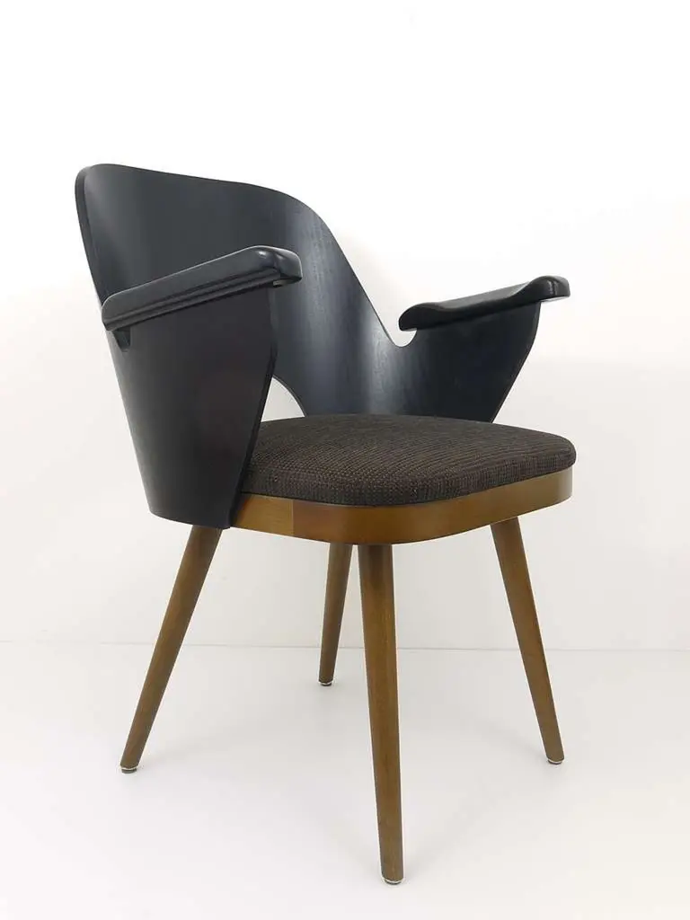 Beautiful armrest chairs, commissioned by Sir Terence Conran for the boutique hotel Guesthouse Vienna. This chair bases on the legendary coffee house chair by the Viennese architect Oswald Haerdtl. For recreational reasons the petite 1950s chairs were updated for a more comfortable seating. From recent production, manufactured by an established traditional Viennese cabinet maker. High-quality craftsmanship, completely handmade, using best materials, the chairs are upholstered with Backhausen Vienna fabric. We are offering identical matching chairs without armrests as well, you can see them on the last picture. Total height: 31", width: 24", seat height: 18". The listed shipping costs are for one piece, please contact us for the costs of more chairs.
