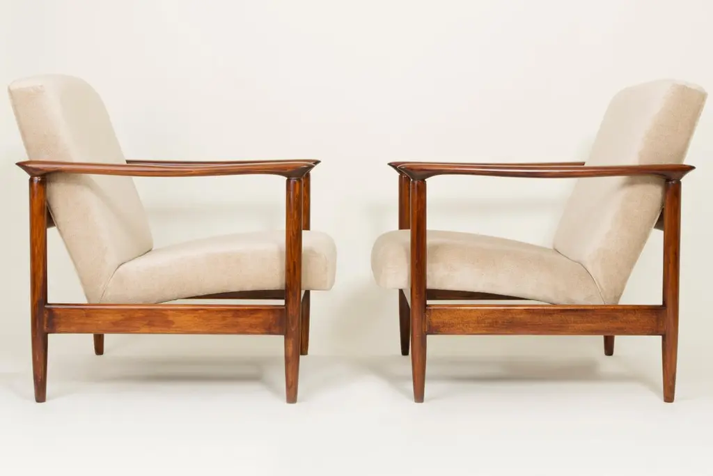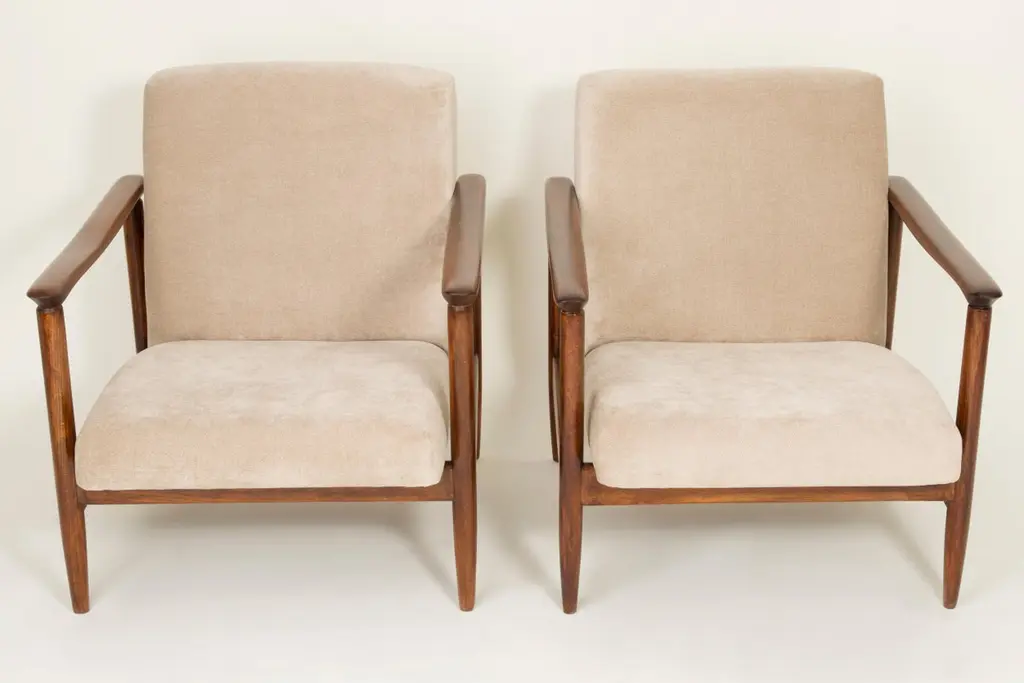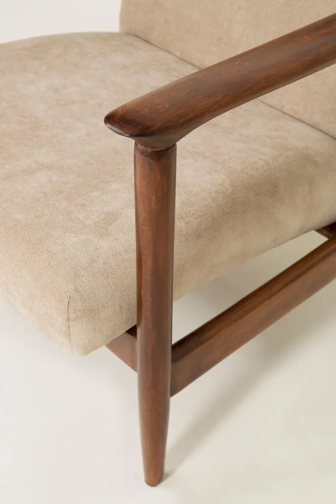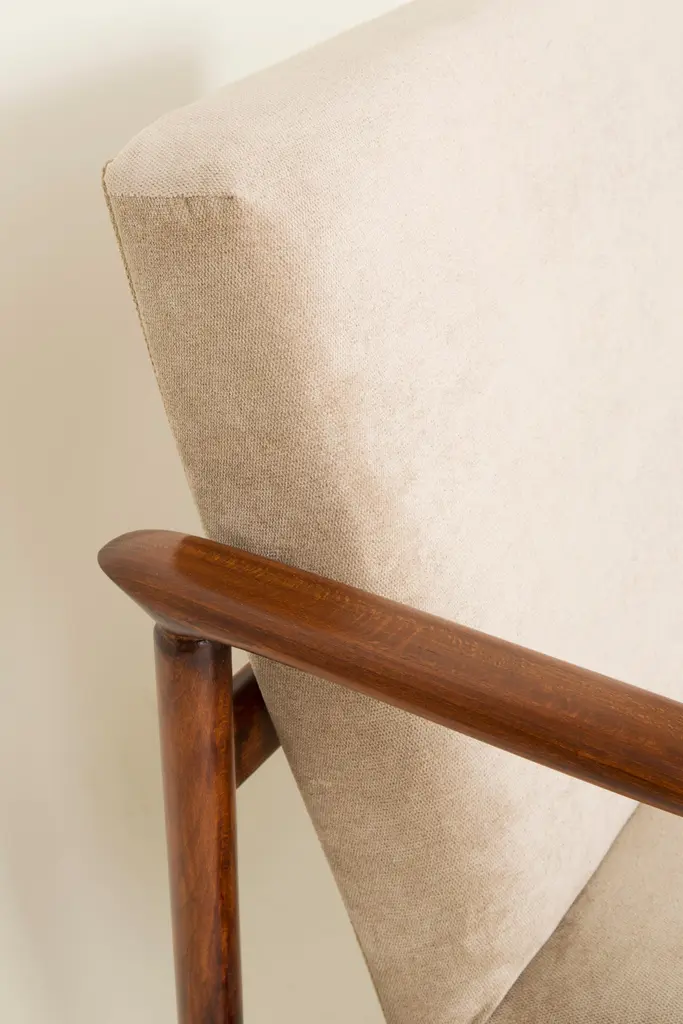 Beautiful armchair GFM-142 type, designed by Edmund Homa. The armchair was made in the 1960s in the Gosciecinska furniture factory. It is made from solid beechwood. The GFM-142 armchair is regarded one of the best polish armchair design from the previous age. The armchair has been thoroughly renovated. The tension belts have been changed, new upholstery foams, beige upholstery is fabric of the highest quality.