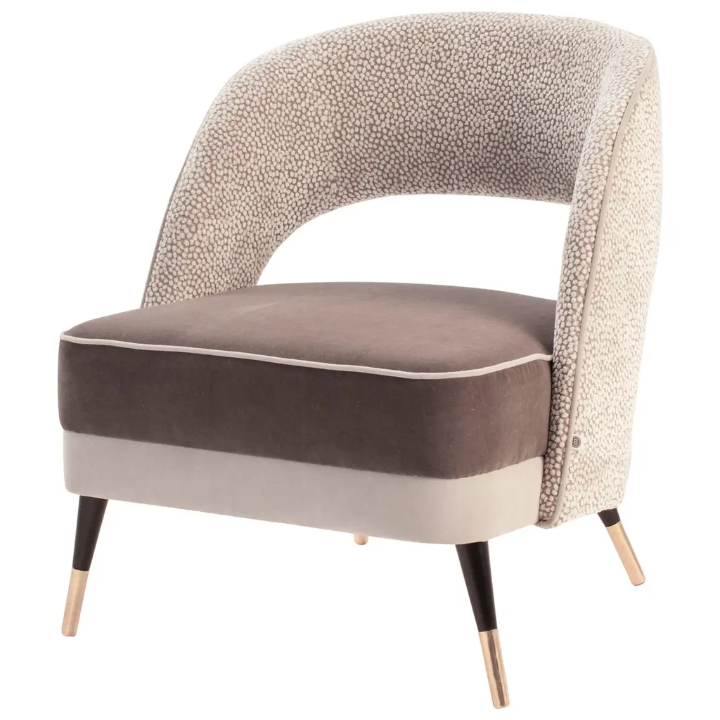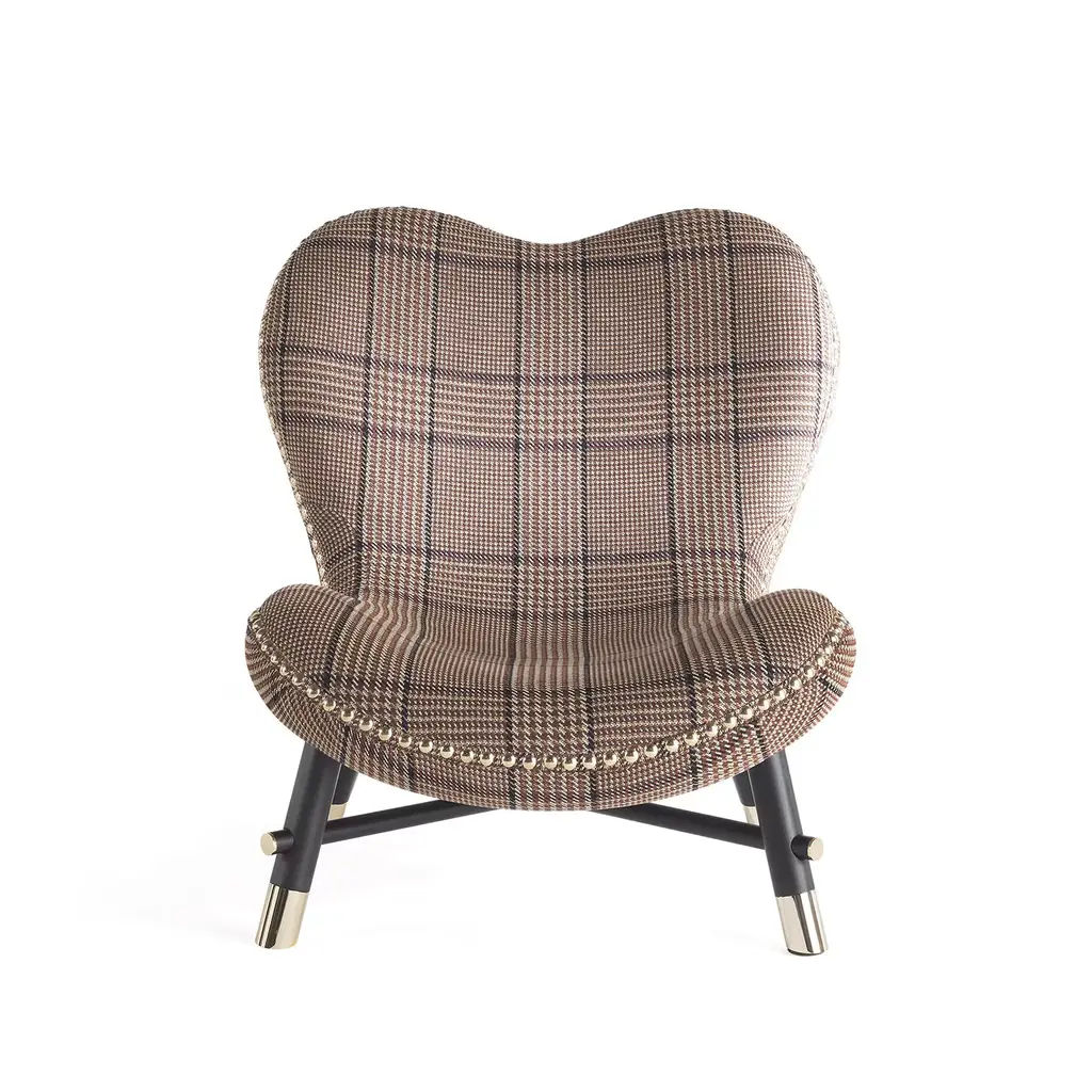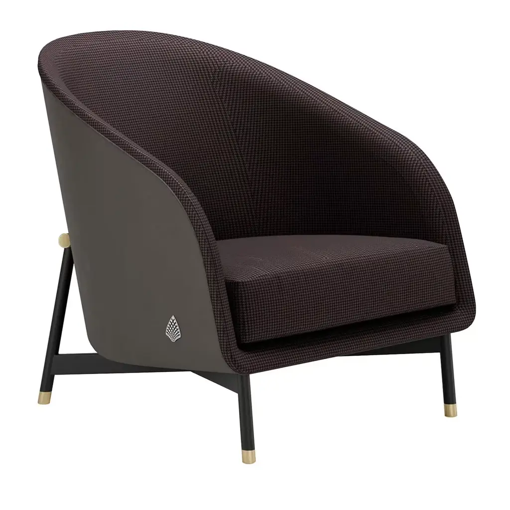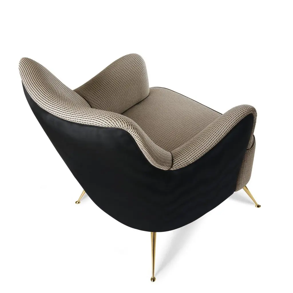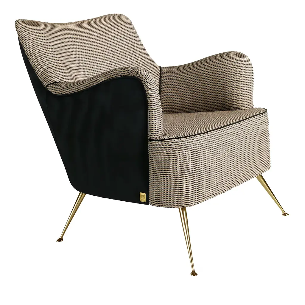 The effortless elegance of midcentury furniture is reinterpreted in this sophisticated armchair that will enrich the look of a modern or vintage-inspired interior. The solid wood structure, with its comfortably tilted backrests and curved armrests, is cushioned in hypoallergenic polyurethane and rests on four slanted feet in brass. The fabric cover is beige inside, with black pipings and black outside, for a striking color-block combination.
