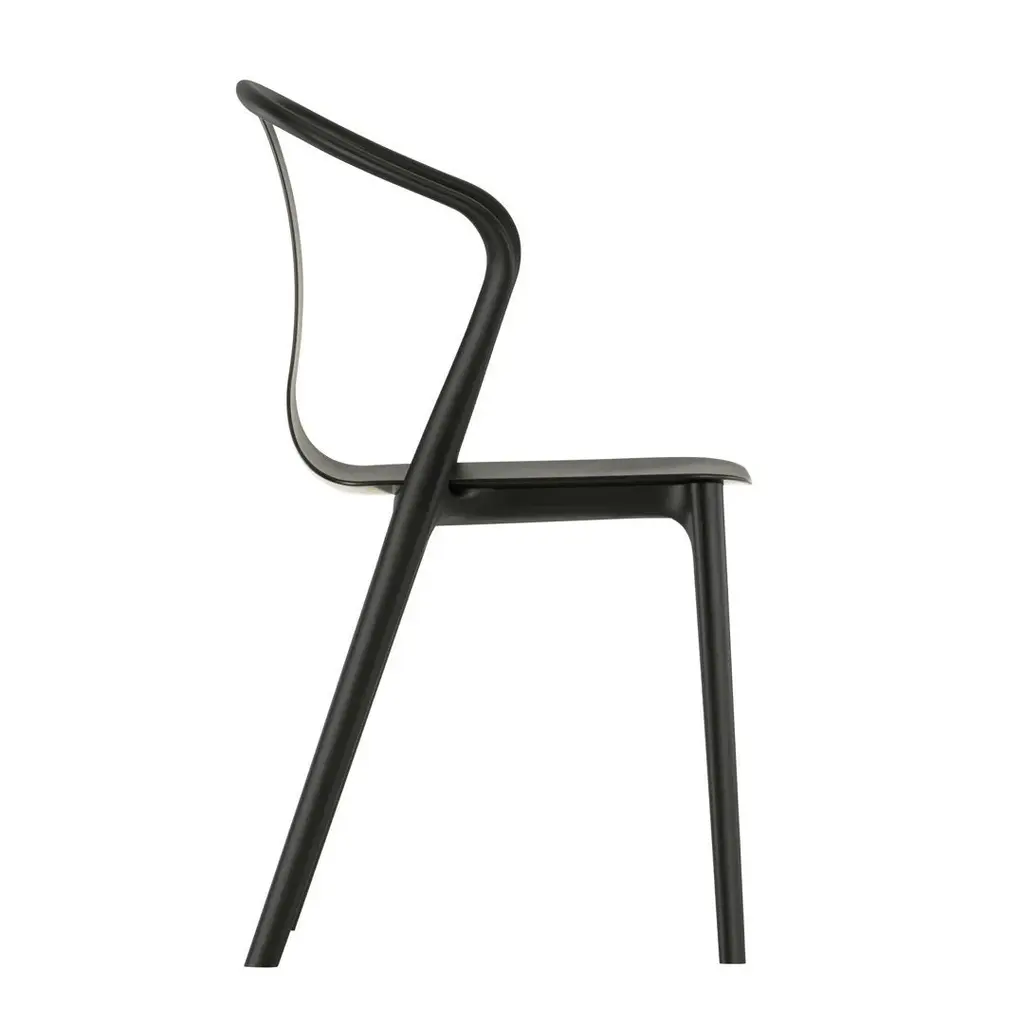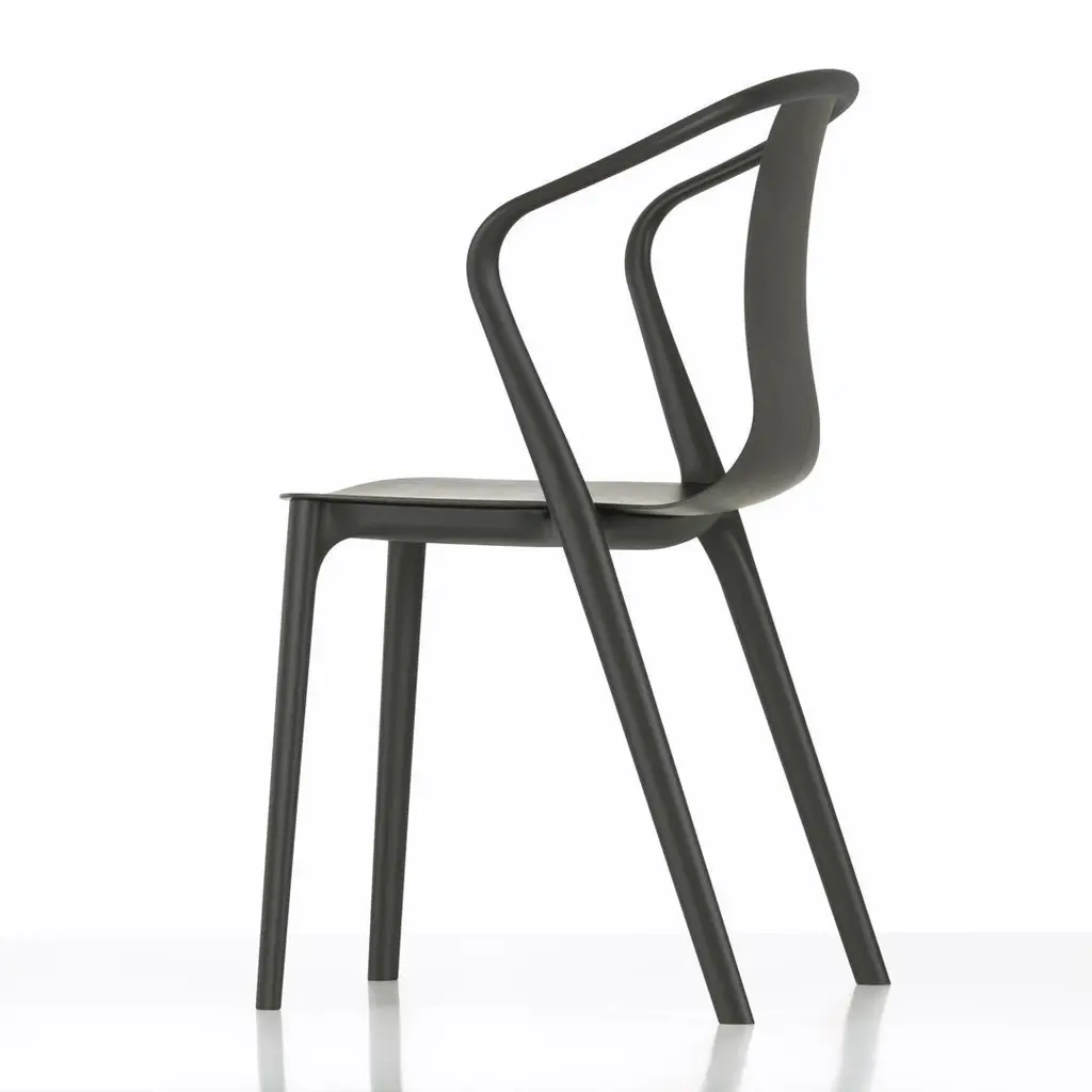 The Belleville Armchair is a hybrid chair, whose seat shell is available in plastic, wood or with a cover in leather or fabric. Each version lends the elegant chair a distinctive identity. The characteristic, forward curving armrests offer relaxing comfort and the model with the plastic seat shell is also suitable for outdoor use. Base in deep black with a seat in a range of colors.