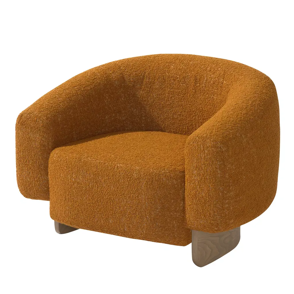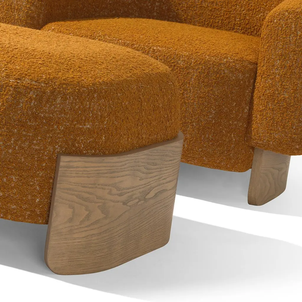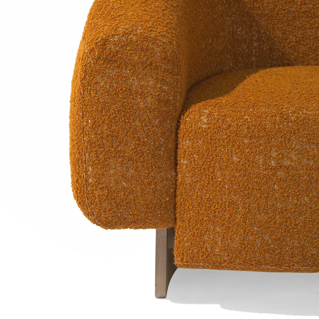 An enveloping comfort characterizes this armchair which has sinuous lines and is supported by a curved ash wood base. The peculiarity is undoubtedly found in the new bouclé fabric with which it is upholstered. Fango finishing. The upholstery is Fabric, Orange color. Other finishings, fabrics, and leathers are available.