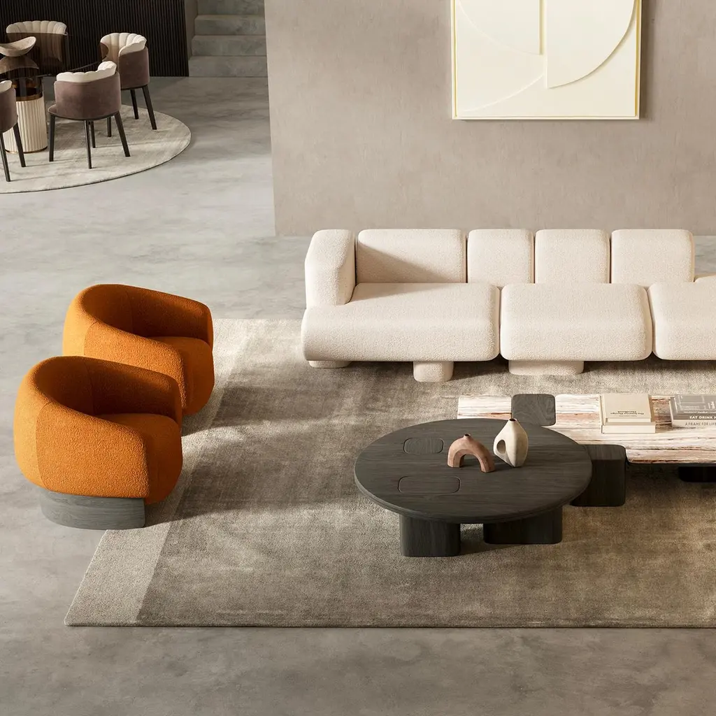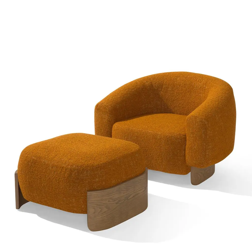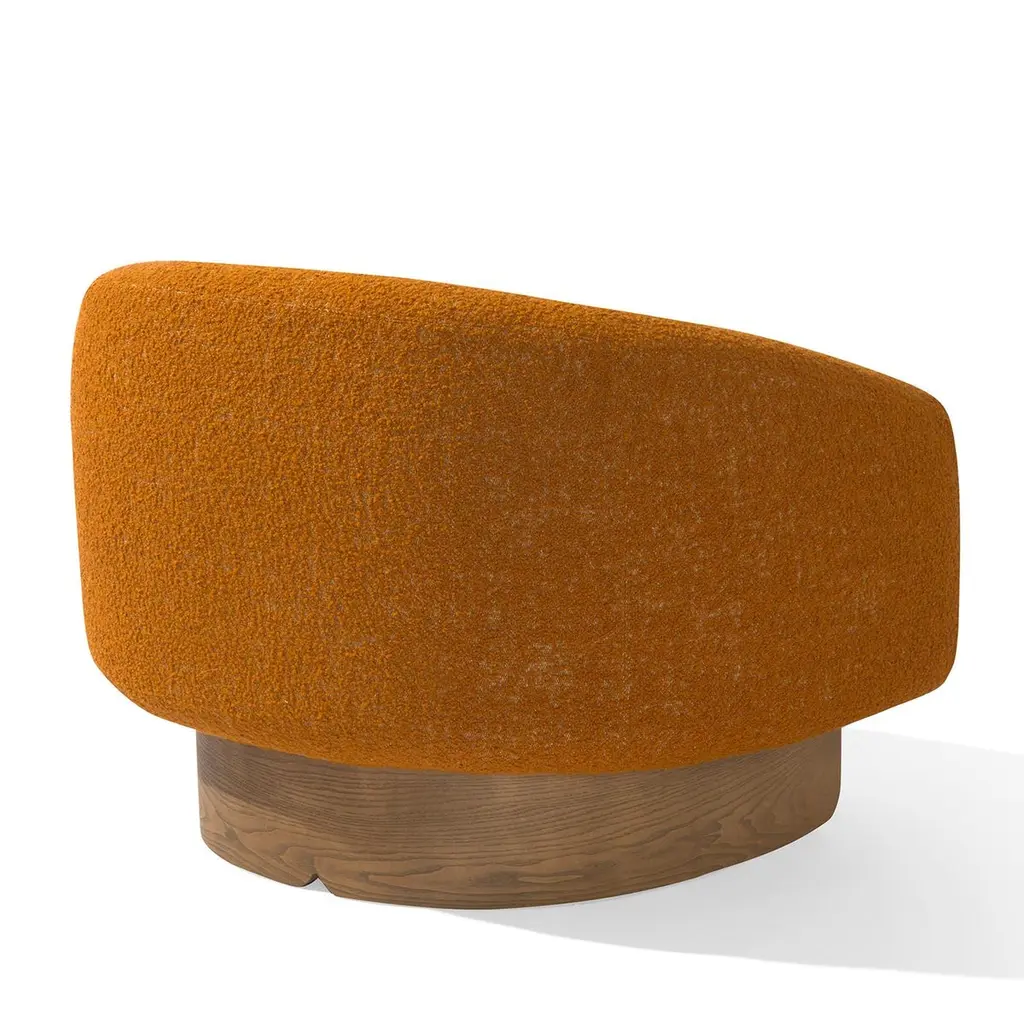 An enveloping comfort characterizes this armchair which has sinuous lines and is supported by a curved ash wood base. The peculiarity is undoubtedly found in the new bouclé fabric with which it is upholstered. Fango finishing. The upholstery is Fabric, Orange color. Other finishings, fabrics, and leathers are available.