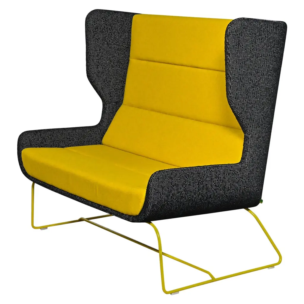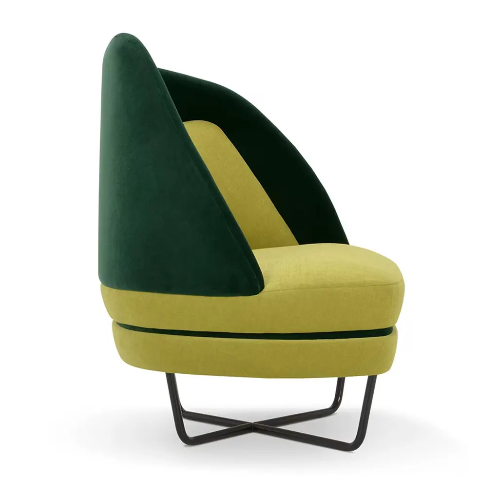 A captivating asymmetrical silhouette outlined by dynamic lines and distinguished by rich chromatic contrasts characterizes this eye-catching armchair. Part of the Bixib Collection designed by Luca Alessandrini, its structure is generously padded and raised on an airy base consisting of intersecting cylindrical elements. Light and deep-green hues alternate in the polyester velvet upholstery.