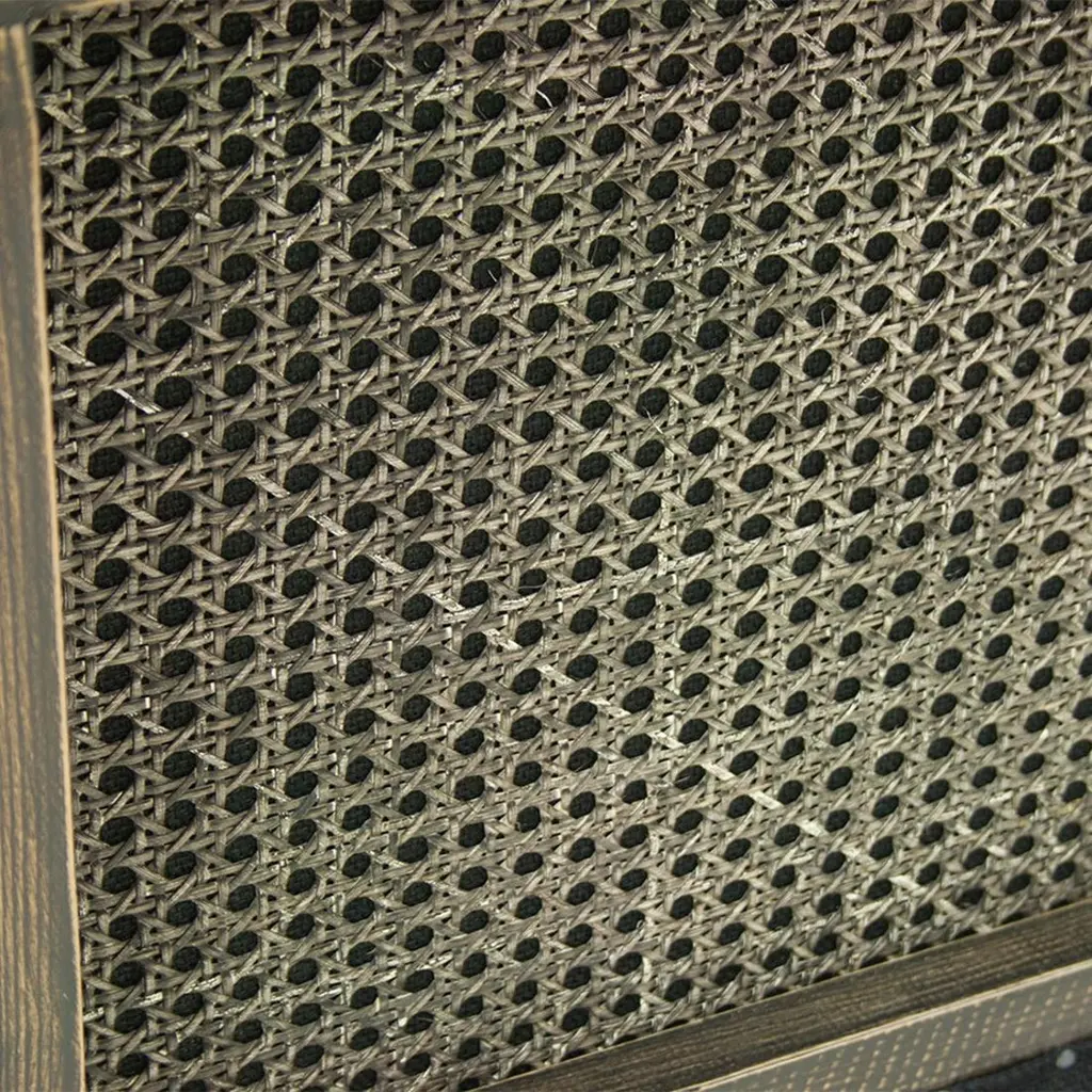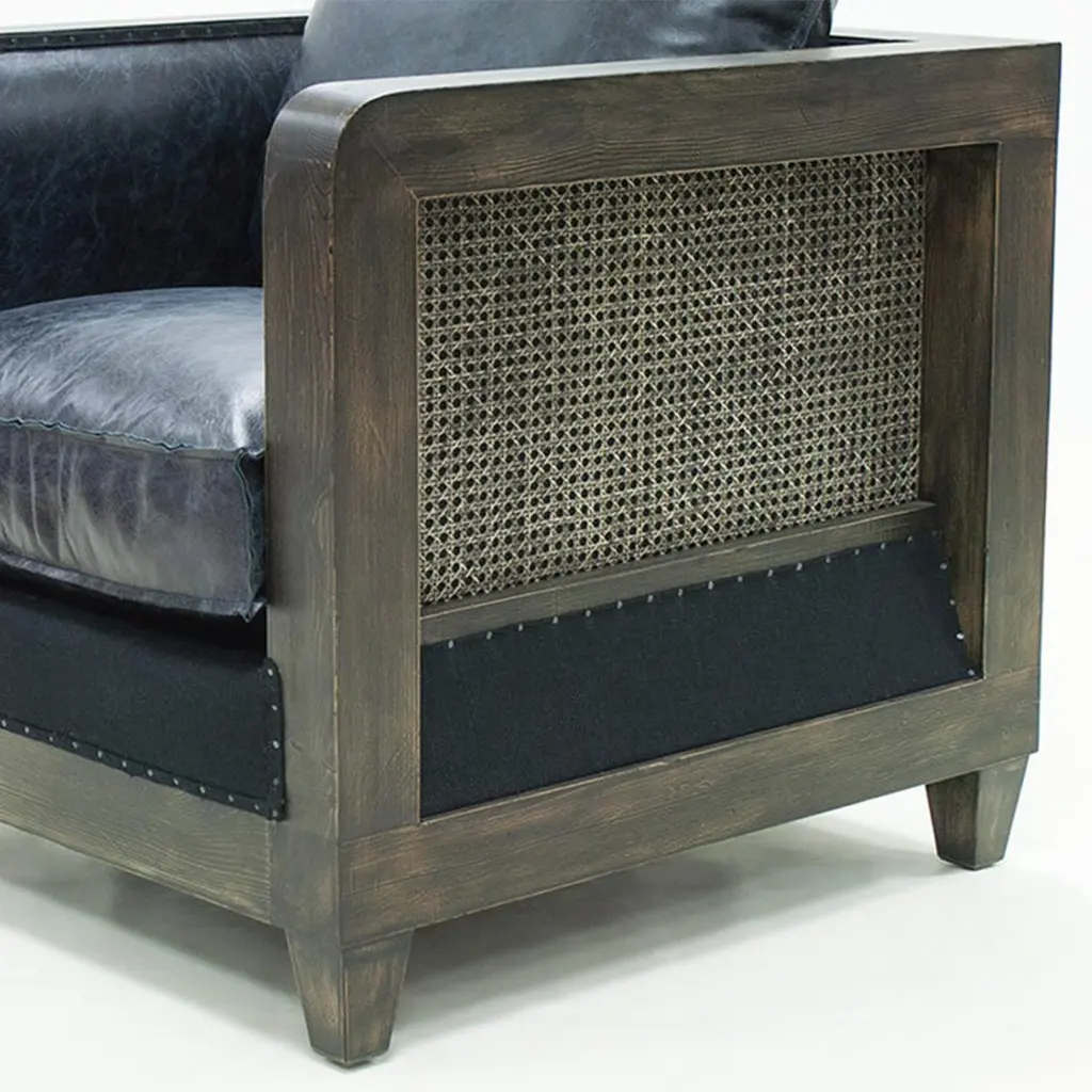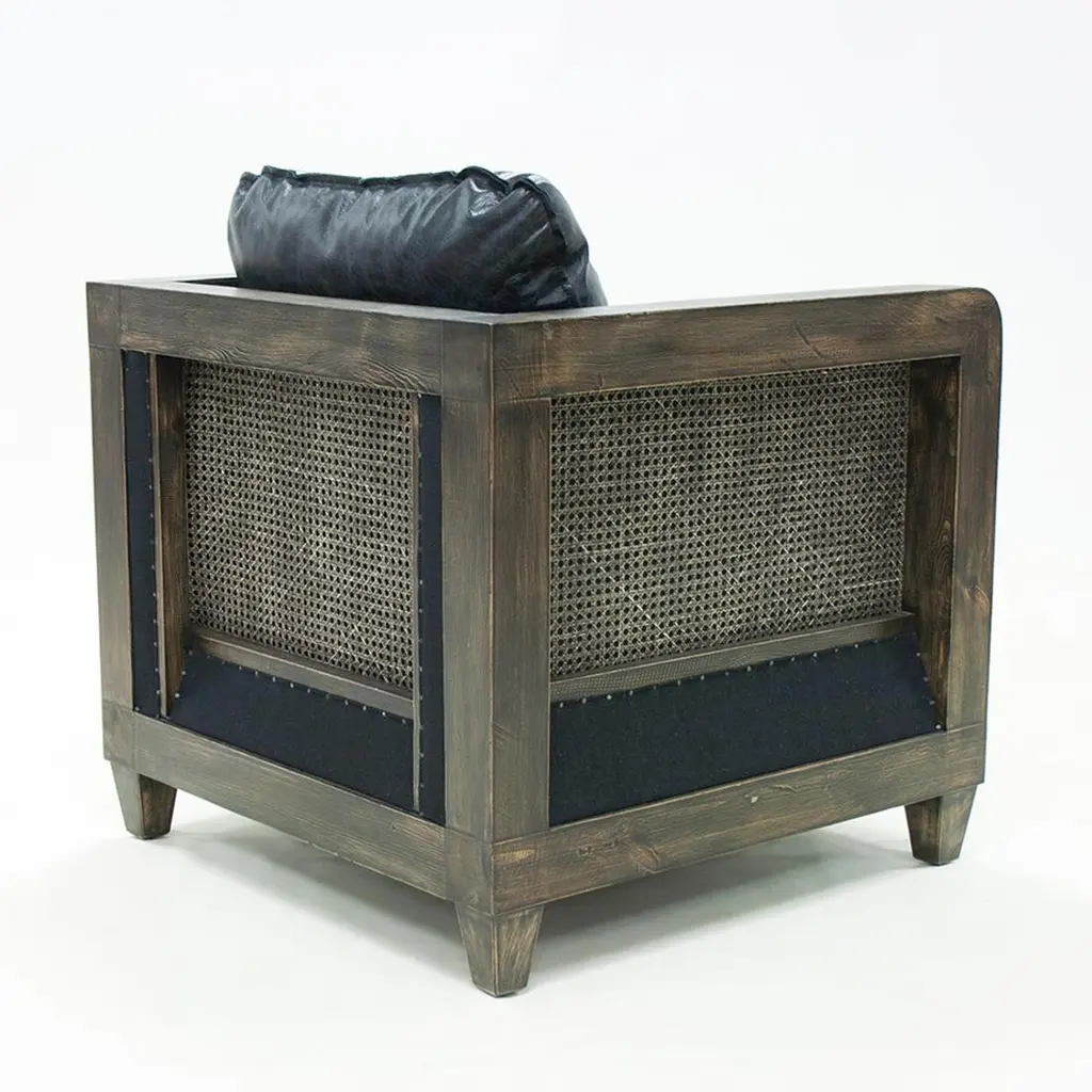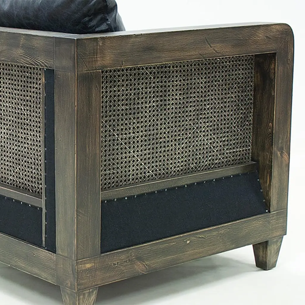 Armchair black cannage with structure in solidvintage patinated wood. With natural cannage in vintage finish.Upholstered and covered with natural black leather in vintage finish.Also available with other leather color on request with15% up-charge.