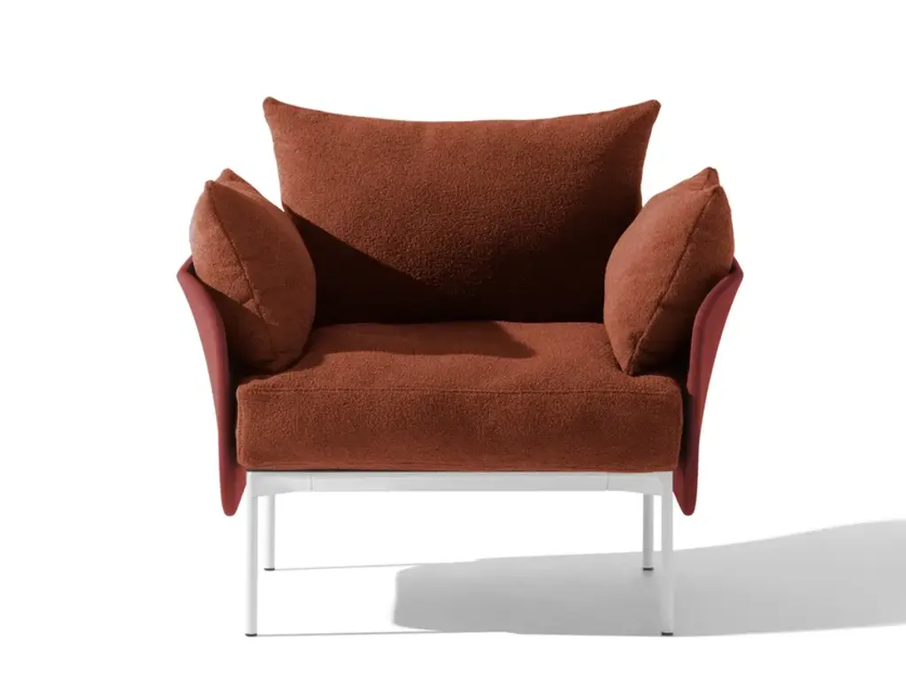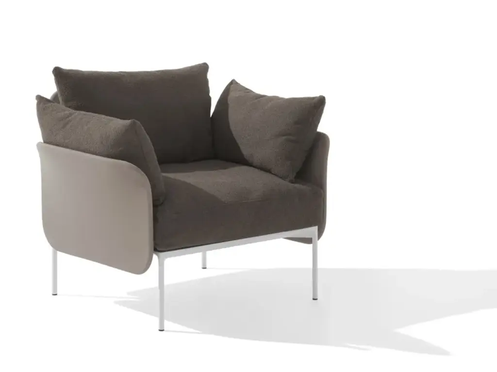 Bloom is an armchair with armrests, characterized by an aluminium frame and covered fabric. The collection includes poufs, sofas, small sofas and different armchairs, designed to create a seating system.