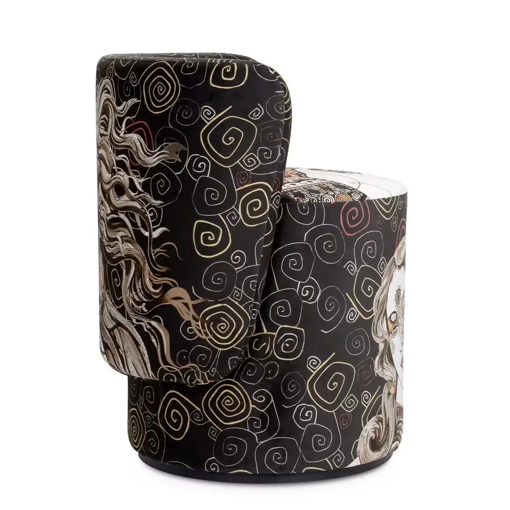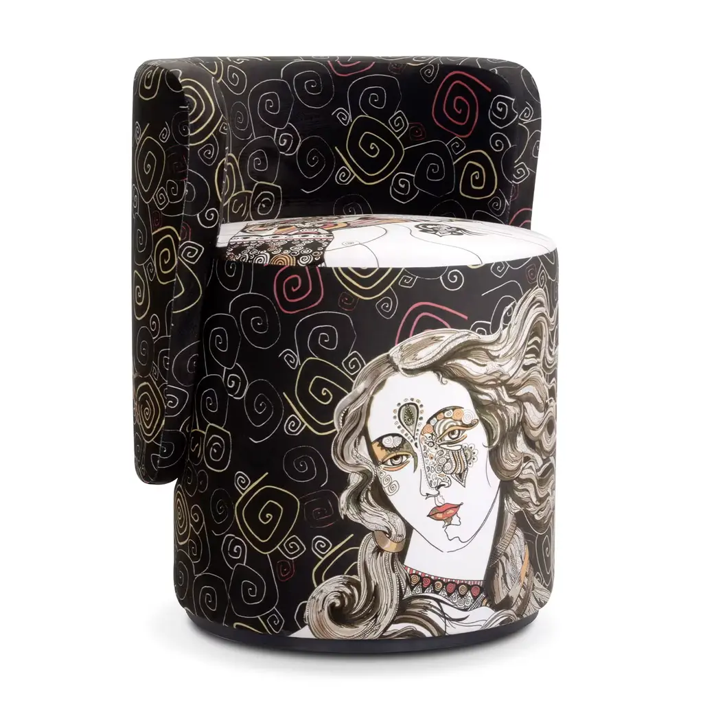 The Boll Multicolor Armchair, crafted in luxurious velvet, features a distinctive cylindrical design with a striking semicircular wrap-around backrest. Its eye-catching multicolor pattern adds vibrancy and charm, while the open, enveloping backrest offers both comfort and style. Combining simplicity with a functional pouf design, this armchair stands out as a unique and modern piece that enhances any interior with its bold aesthetic and sophisticated texture.