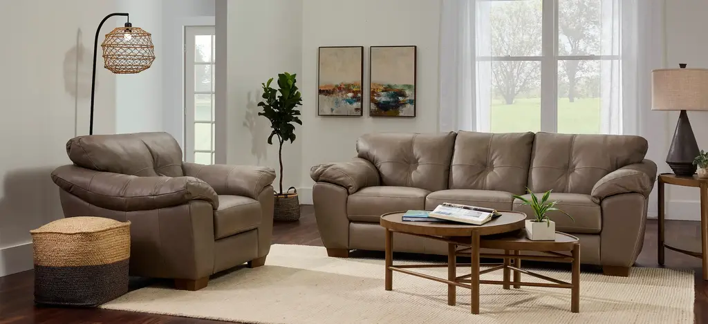 Beyond tasteful in beautiful taupe, the Bosco chair offers indulgent comfort and easygoing elegance to complement any casual lifestyle and decor. Streamlined sloped track arms are extra wide and topped with pillow caps, and the double plush back seat cushion is fixed and tufted with a double top stitch for a refined touch.