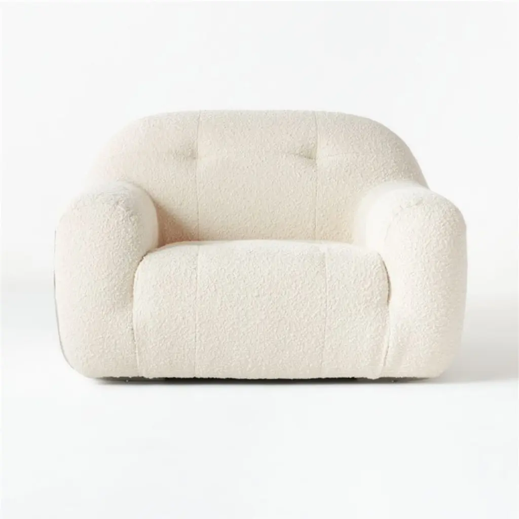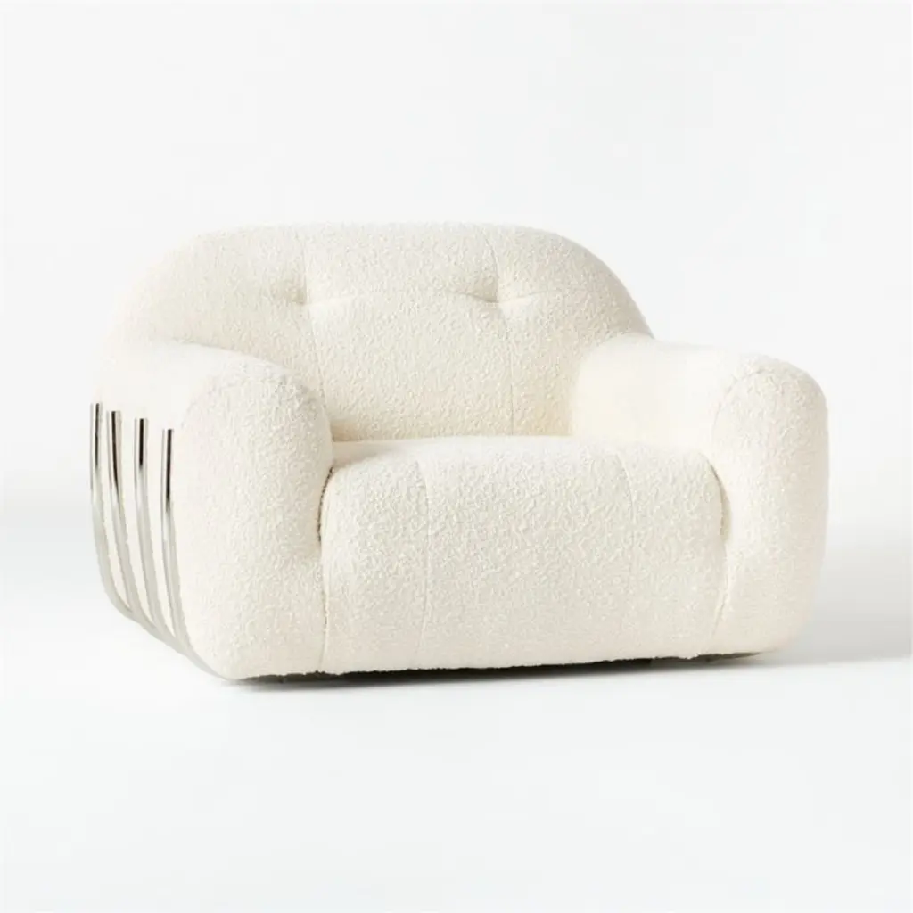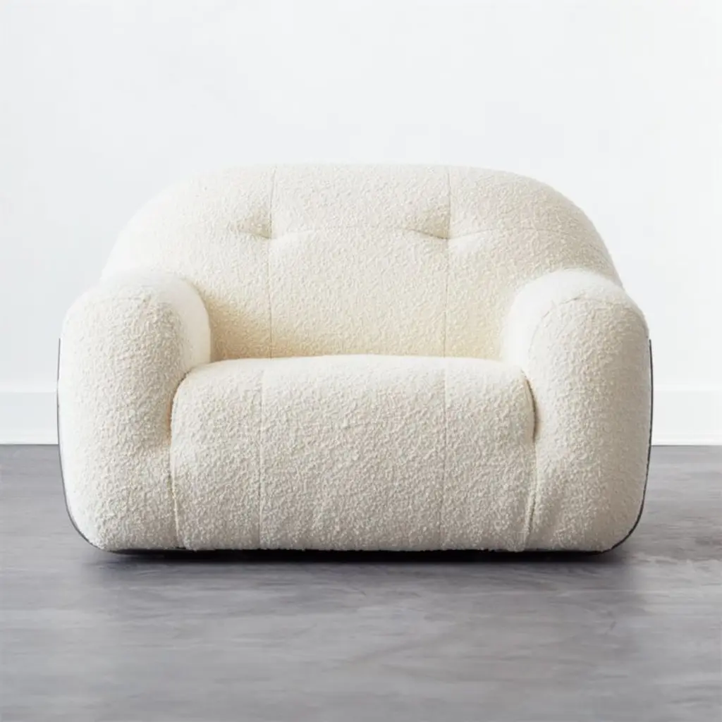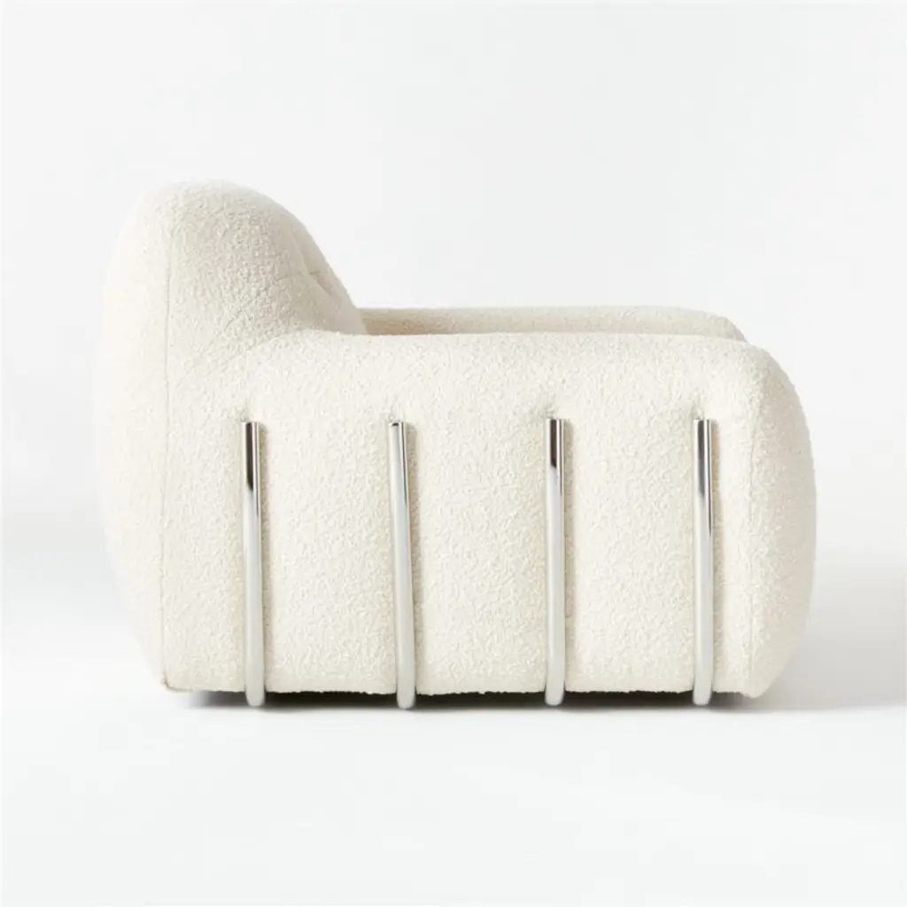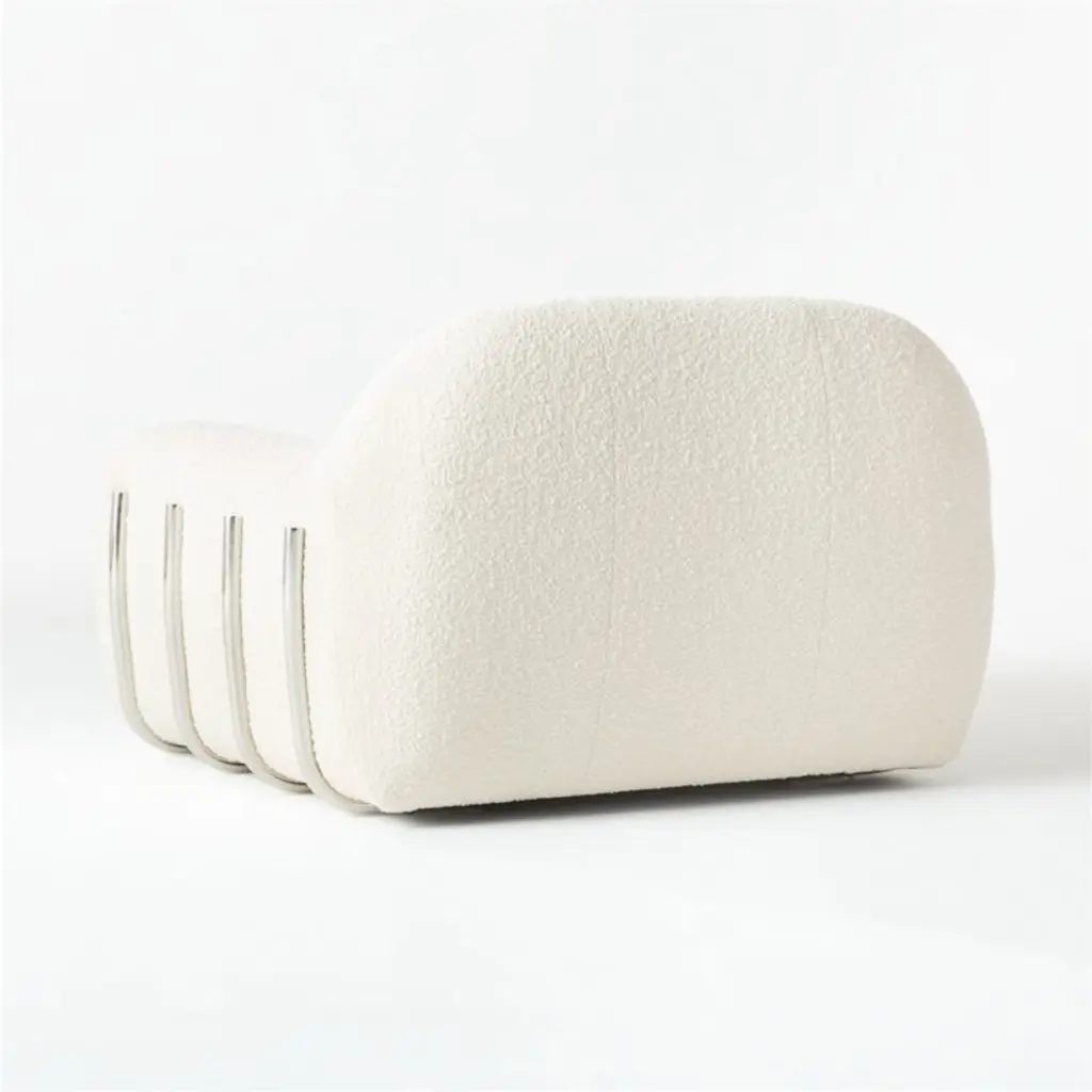 1970s Italian-inspired chair designed by Jannis Ellenberger makes lounging look vintage. Curvaceous design is wrapped in a creamy ivory boucle that brings soft texture and dimension to the piece. Four metal braces add structural detail to each end. Luxe seat is low, deep and so easy to sink into. Learn more about Jannis Ellenberger on our blog. CB2 exclusive.