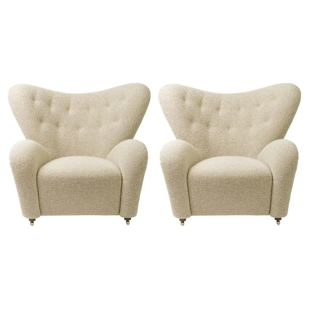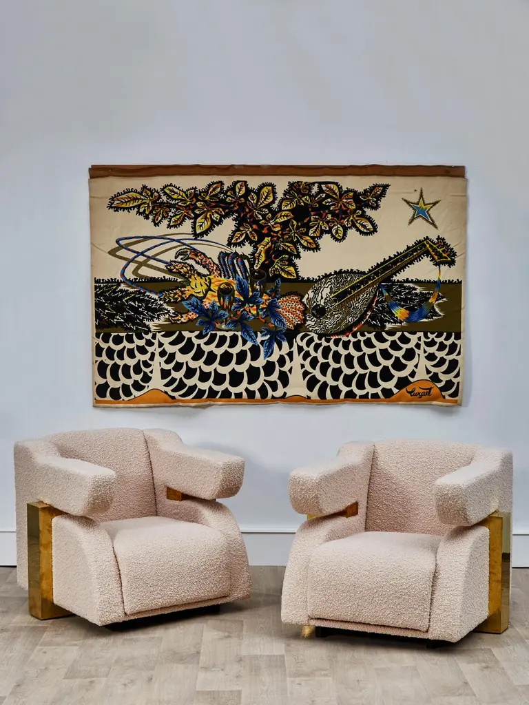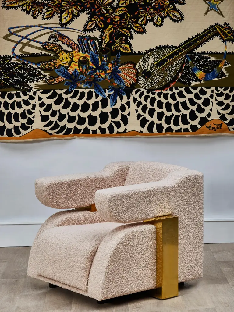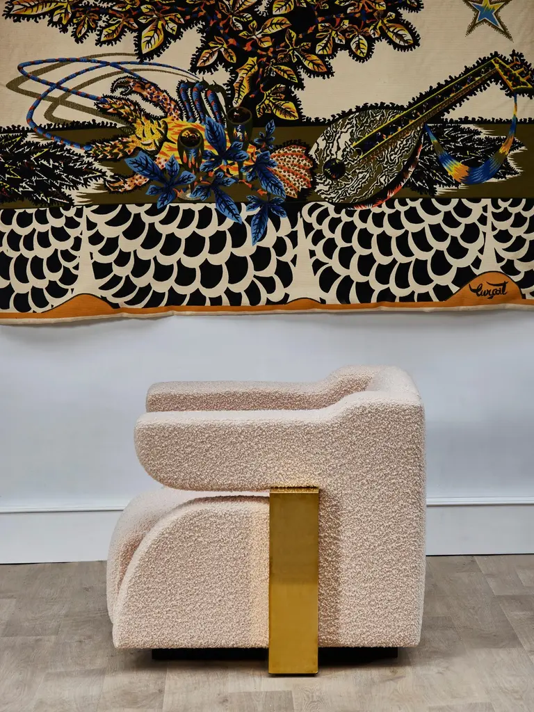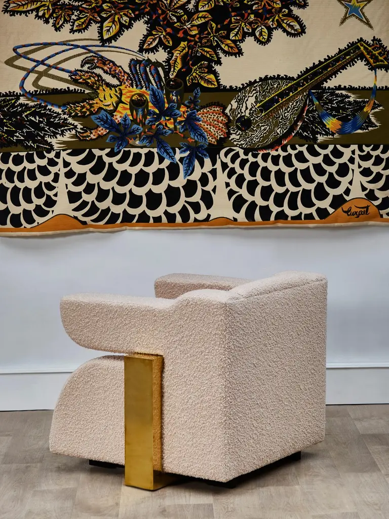 Stunning pair of armchairs with brass structure upholstered with a bouclette fabric by Pierre Frey.Creation by Studio Glustin.France, 2025