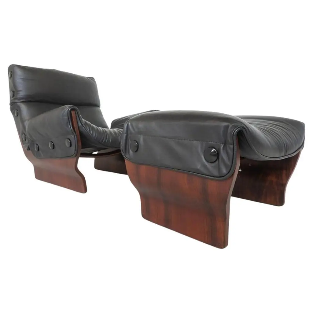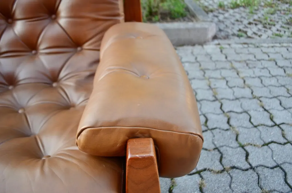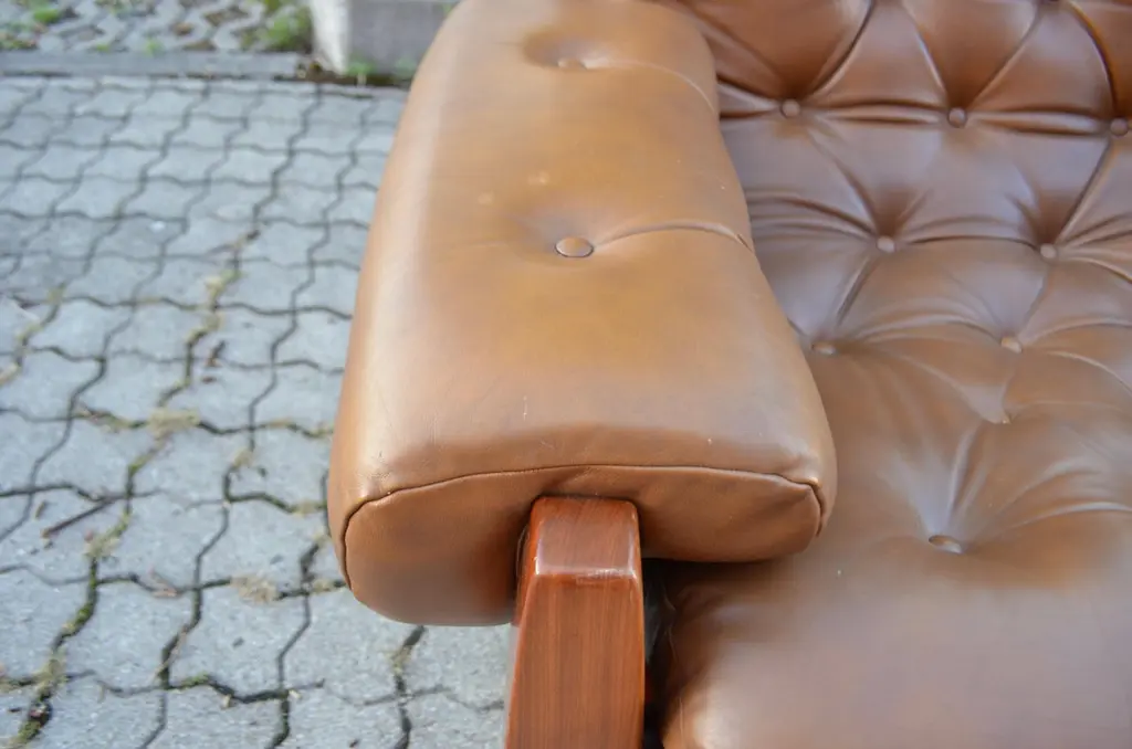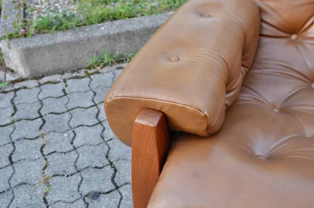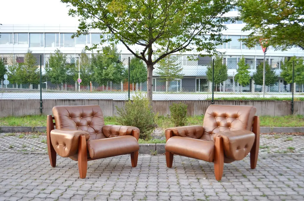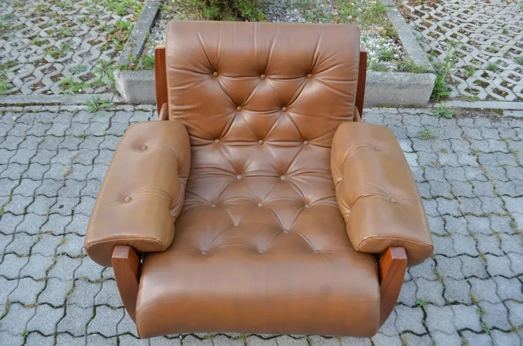 This big Lounge Armchair is from the 1970.It is made of Pau Ferro wood and aniline cognac leather.Underneath the cushion are saddle leather straps.The design has references to Jean Gillon work but the manufacture and designer is yet unknown.We have 2 chairs in Stock.