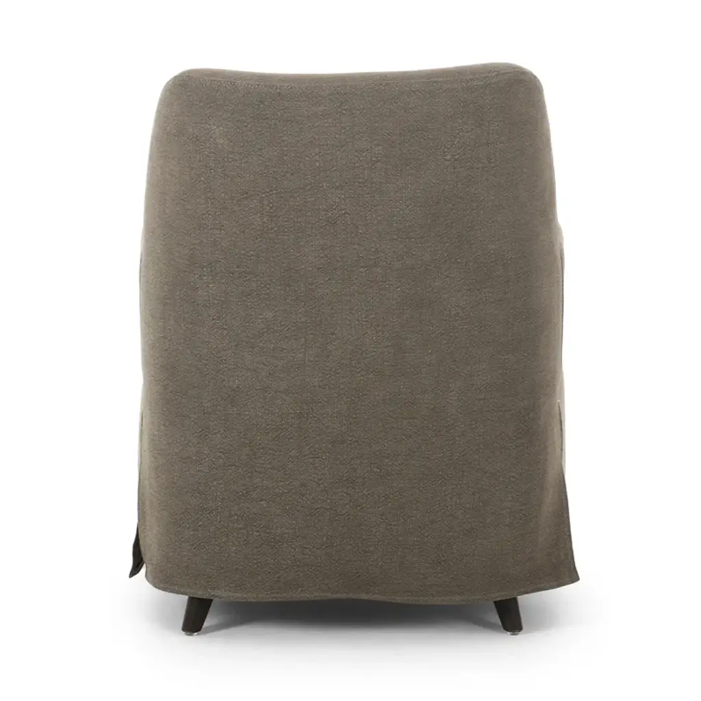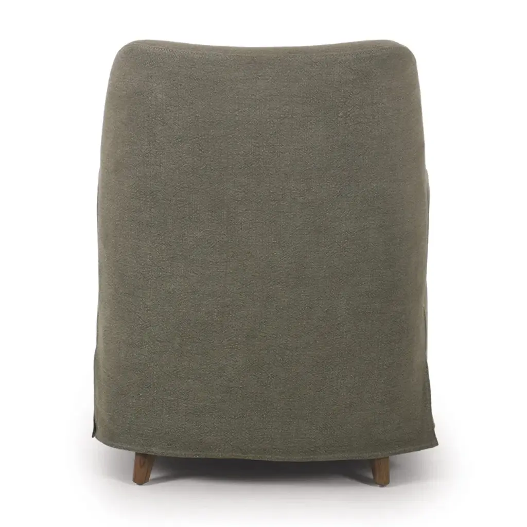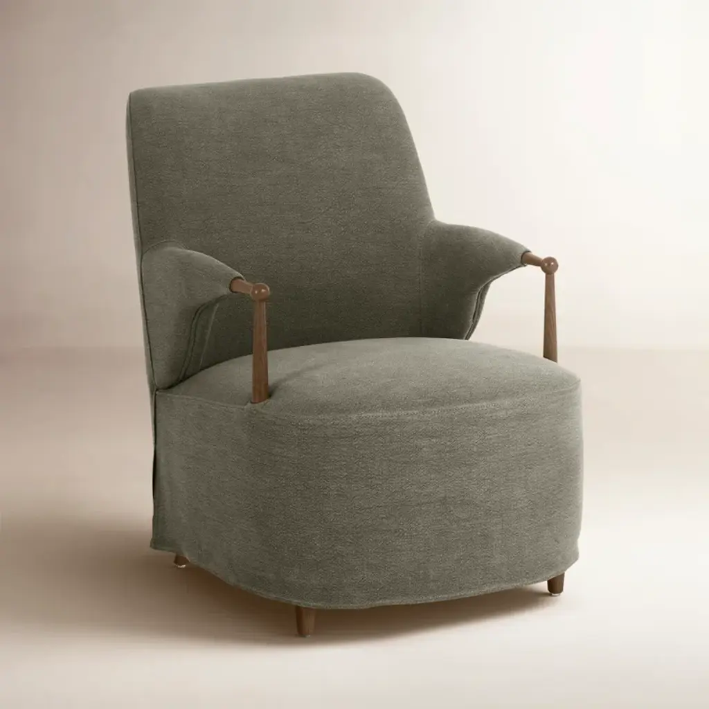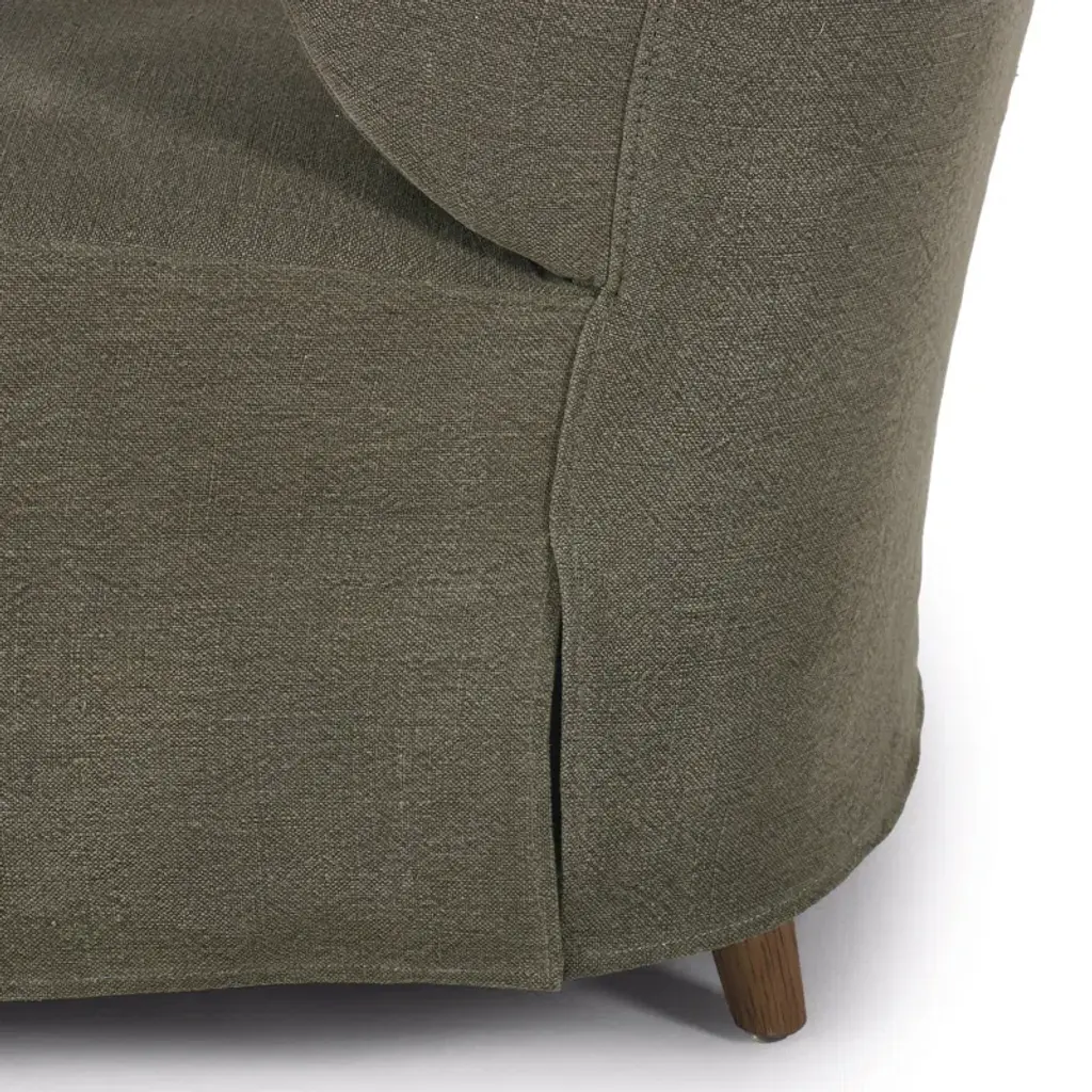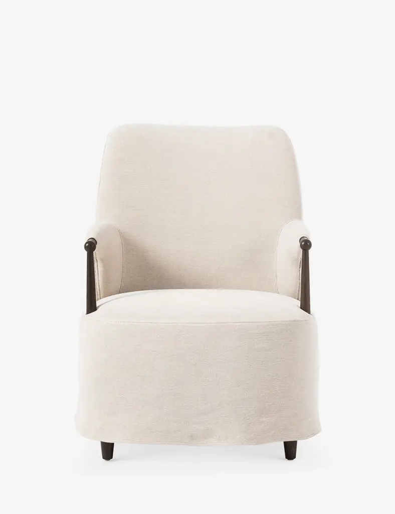 A new take on the classic slipcovered chair, featuring a fixed linen blend slipcover that comes together seamlessly with distressed oak wood arms and feet. The sloping silhouette allows for the slipcover to drape into a skirt at the base, and with a comfortable S-spring seat design, invites you to settle in. A design collaboration by Amber Lewis and Four Hands.