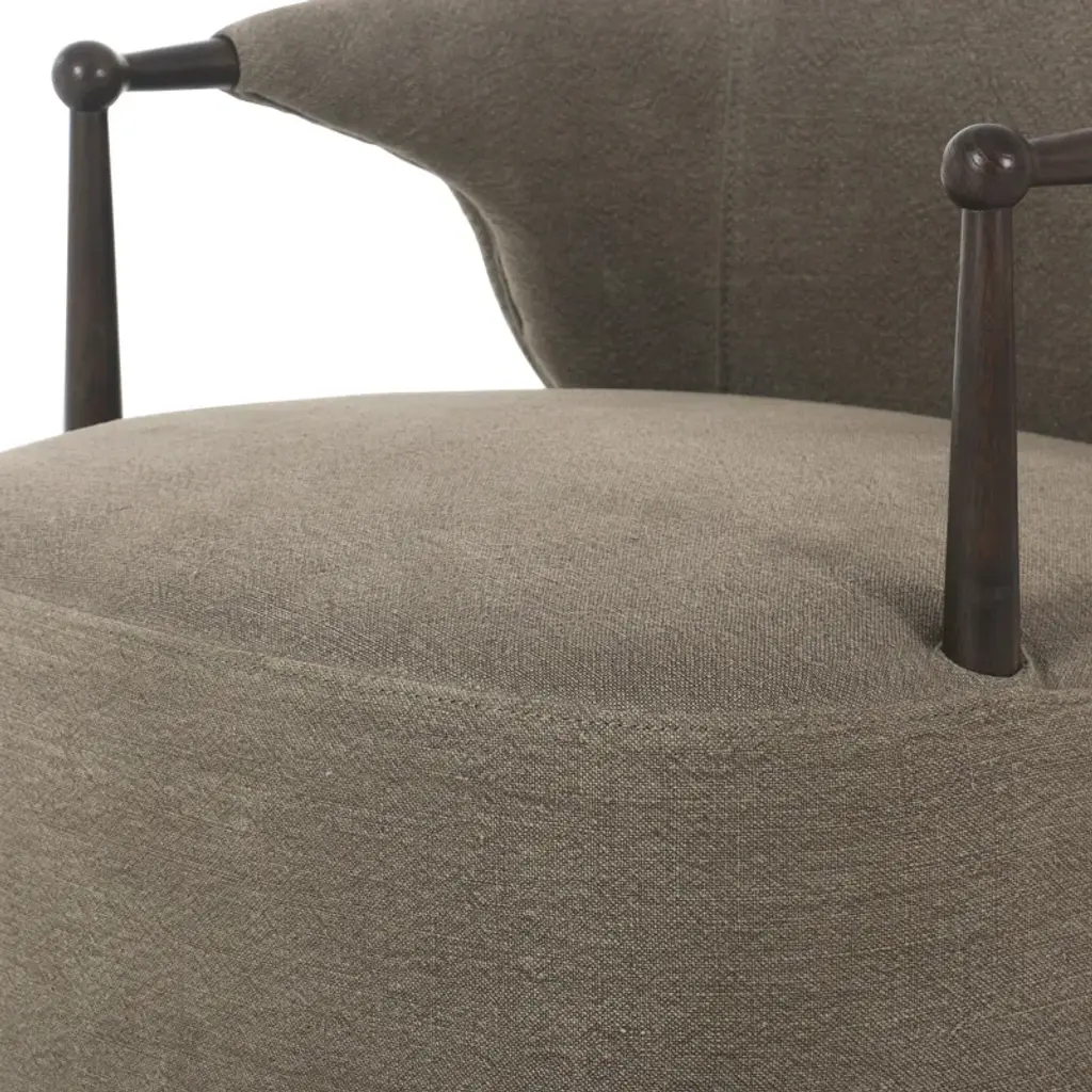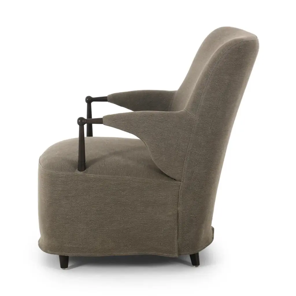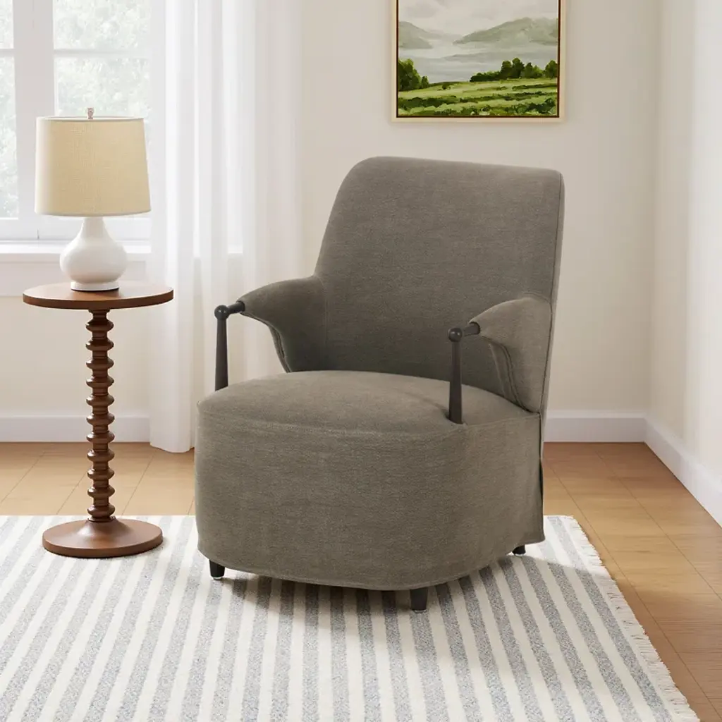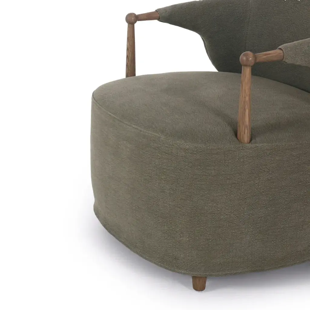 A new take on the classic slipcovered chair, featuring a fixed linen blend slipcover that comes together seamlessly with distressed oak wood arms and feet. The sloping silhouette allows for the slipcover to drape into a skirt at the base, and with a comfortable S-spring seat design, invites you to settle in. A design collaboration by Amber Lewis and Four Hands.