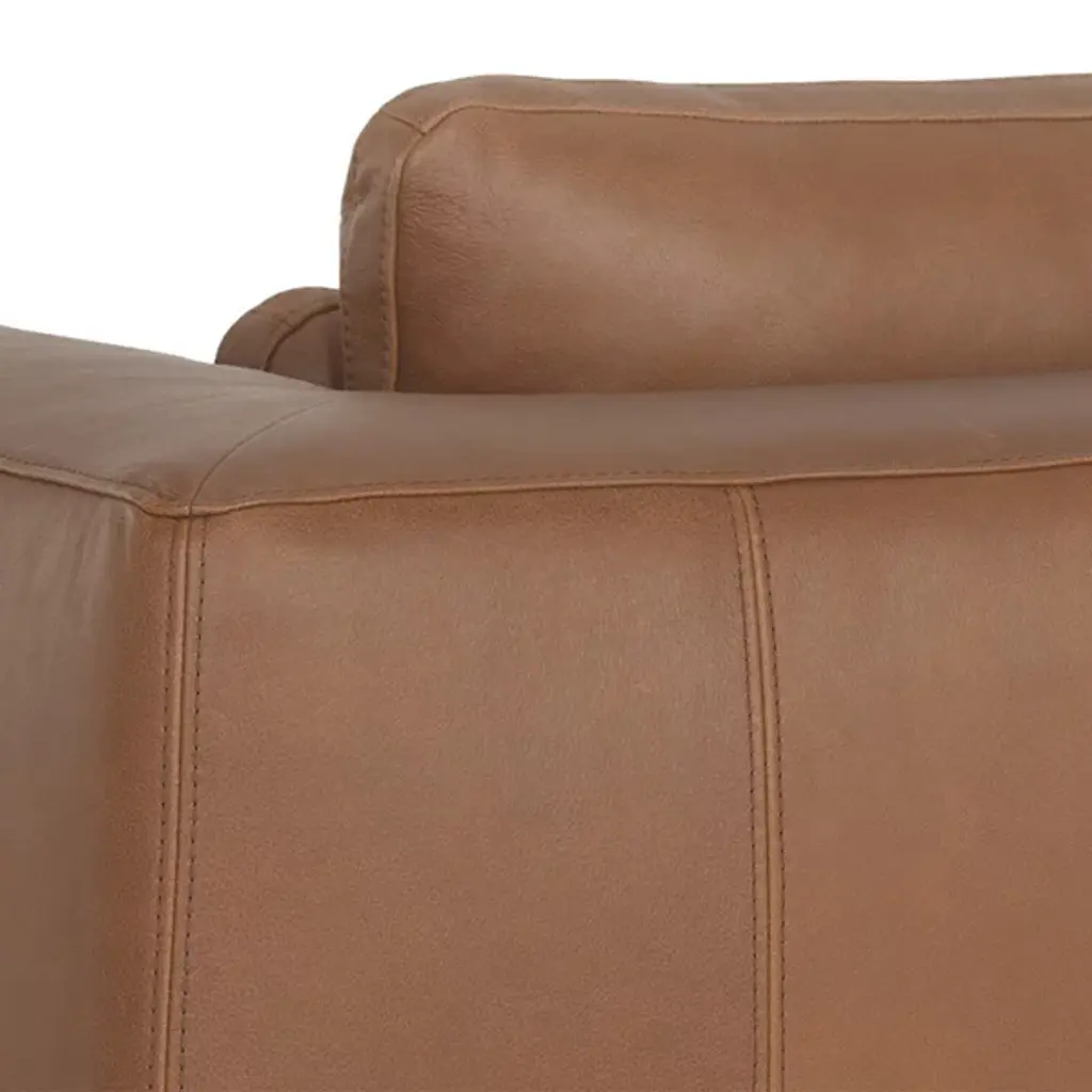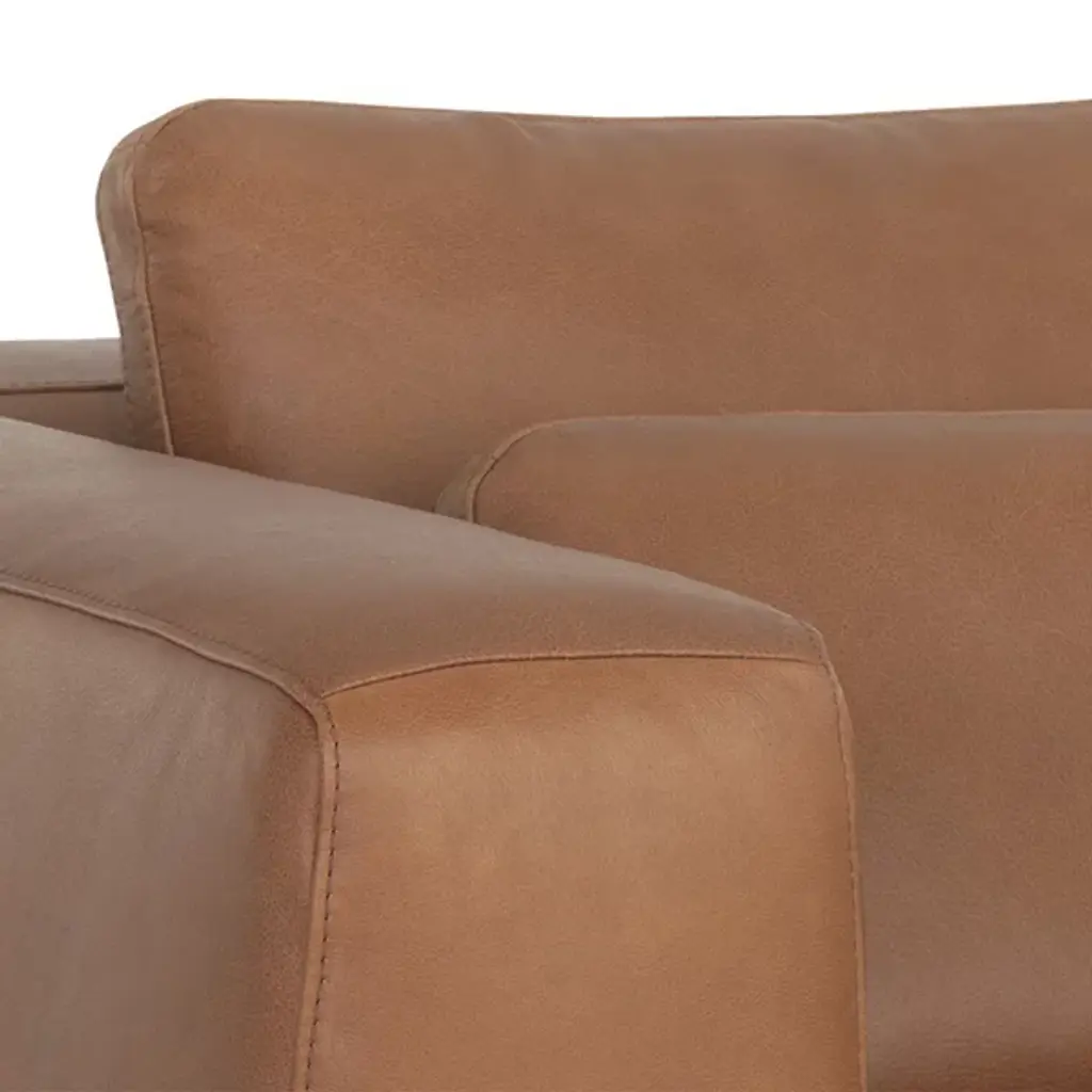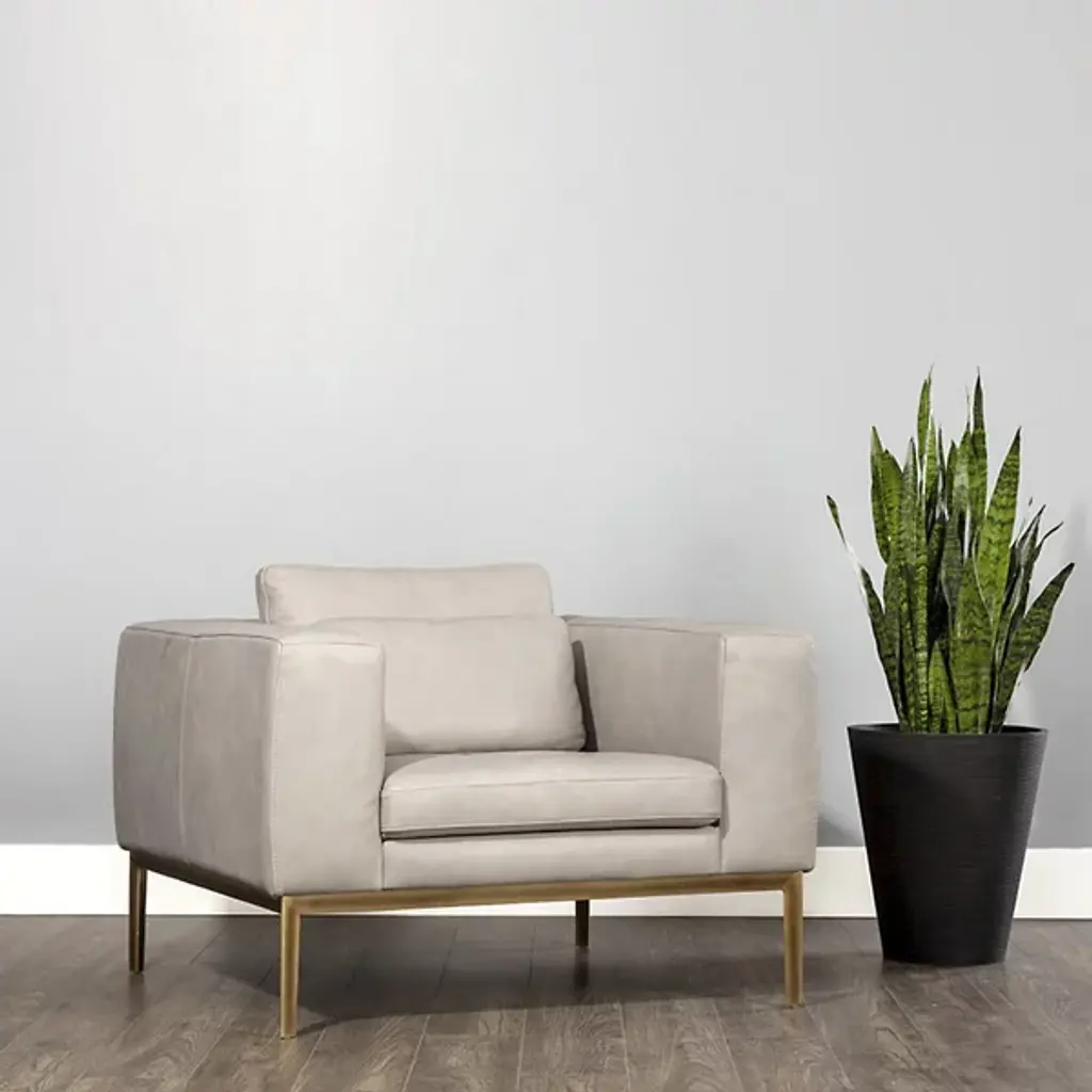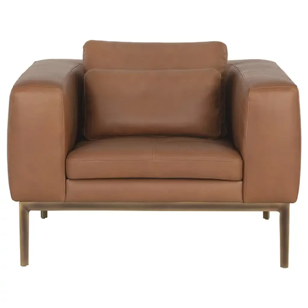The Burr Armchair from Sunpan makes a bold statement with its direct design and plentiful proportions. Upholstered in a rich leather surface, this chair features broad armrests and a deep seat for unmatched comfort. Rustic bronze-finished steel feet add modern refinement and a robust industrial touch, while the natural beauty of bovine leather ensures unique character with subtle markings and textures. It's a striking addition to contemporary, mid-century modern spaces, perfect when pairing with the coordinating sofa or articulate when standing alone.