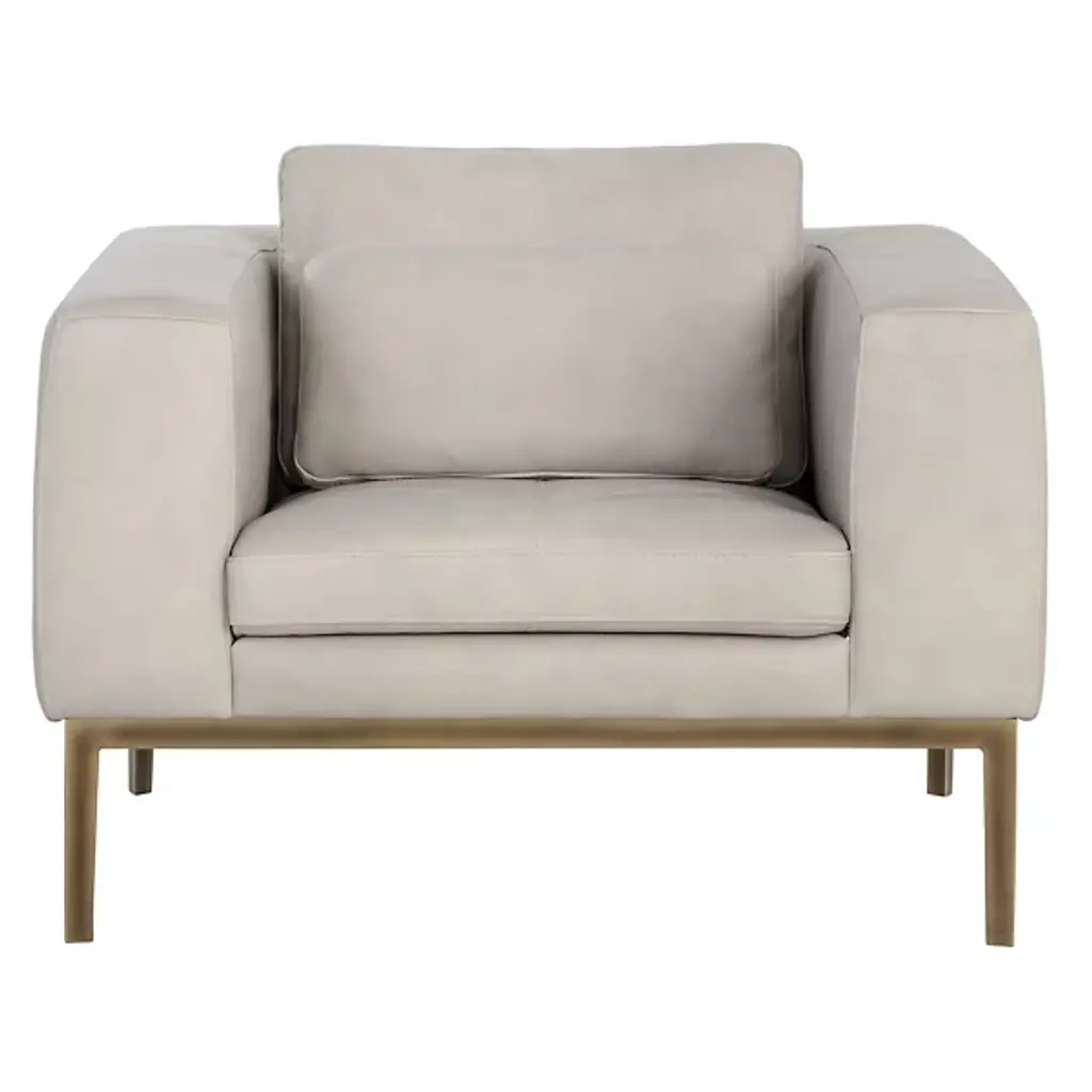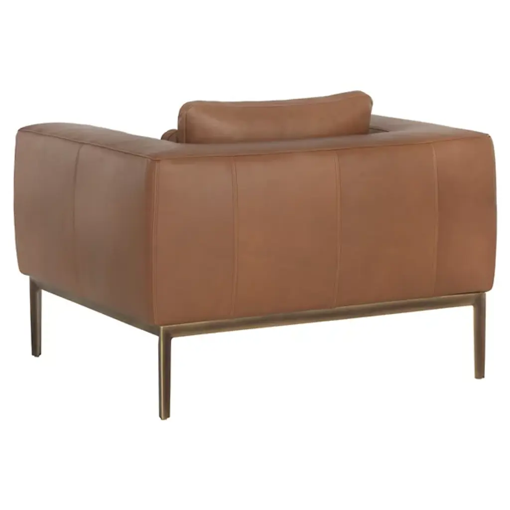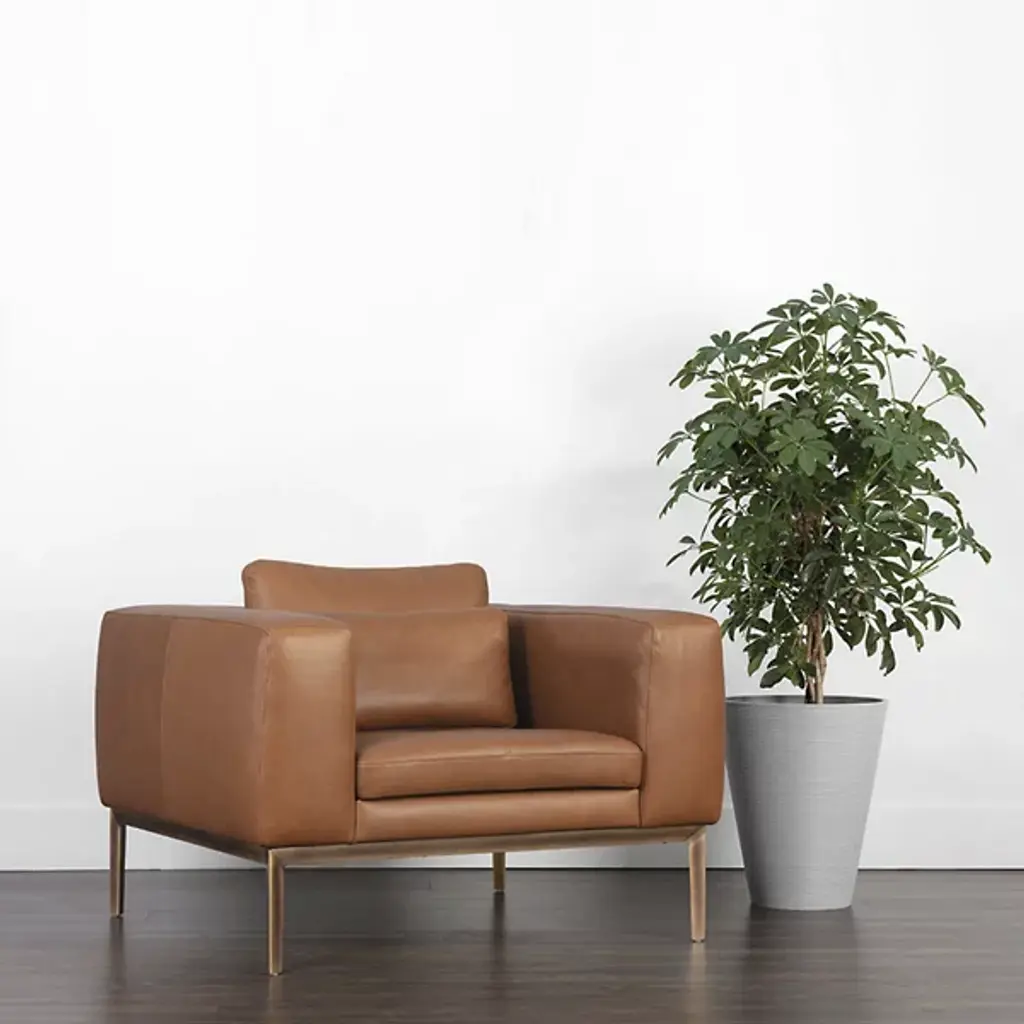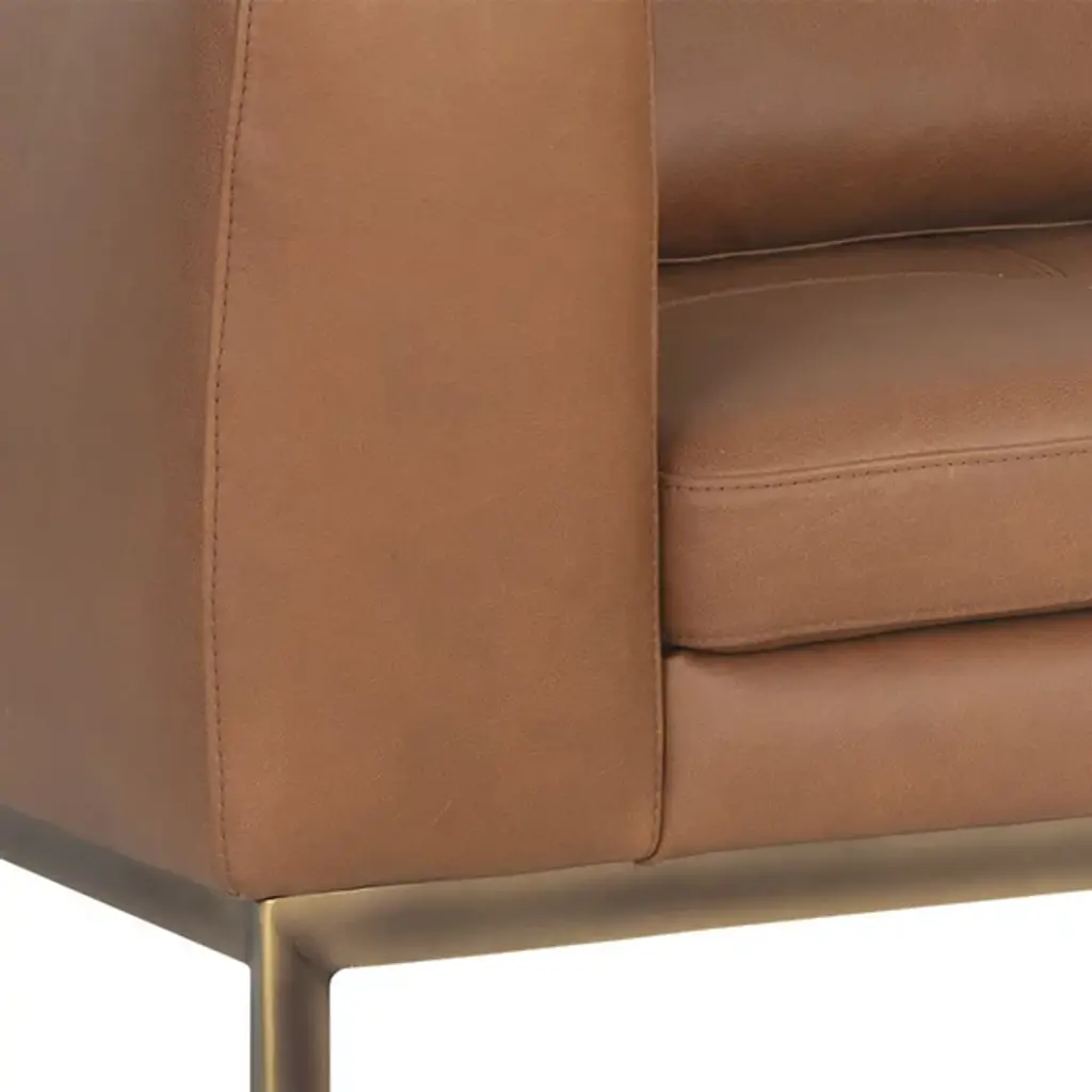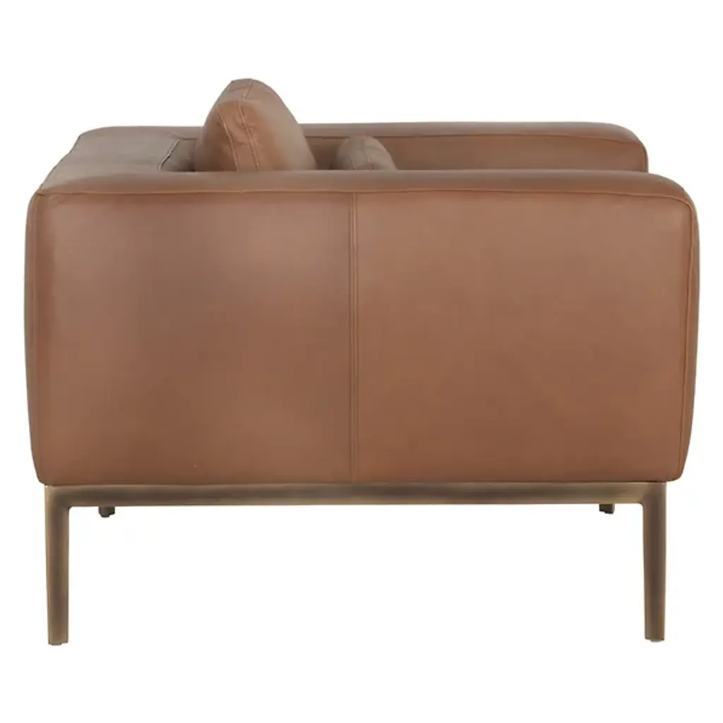 The Burr Armchair from Sunpan makes a bold statement with its direct design and plentiful proportions. Upholstered in a rich leather surface, this chair features broad armrests and a deep seat for unmatched comfort. Rustic bronze-finished steel feet add modern refinement and a robust industrial touch, while the natural beauty of bovine leather ensures unique character with subtle markings and textures. It's a striking addition to contemporary, mid-century modern spaces, perfect when pairing with the coordinating sofa or articulate when standing alone.
