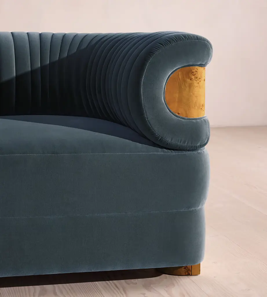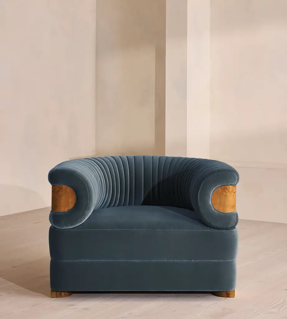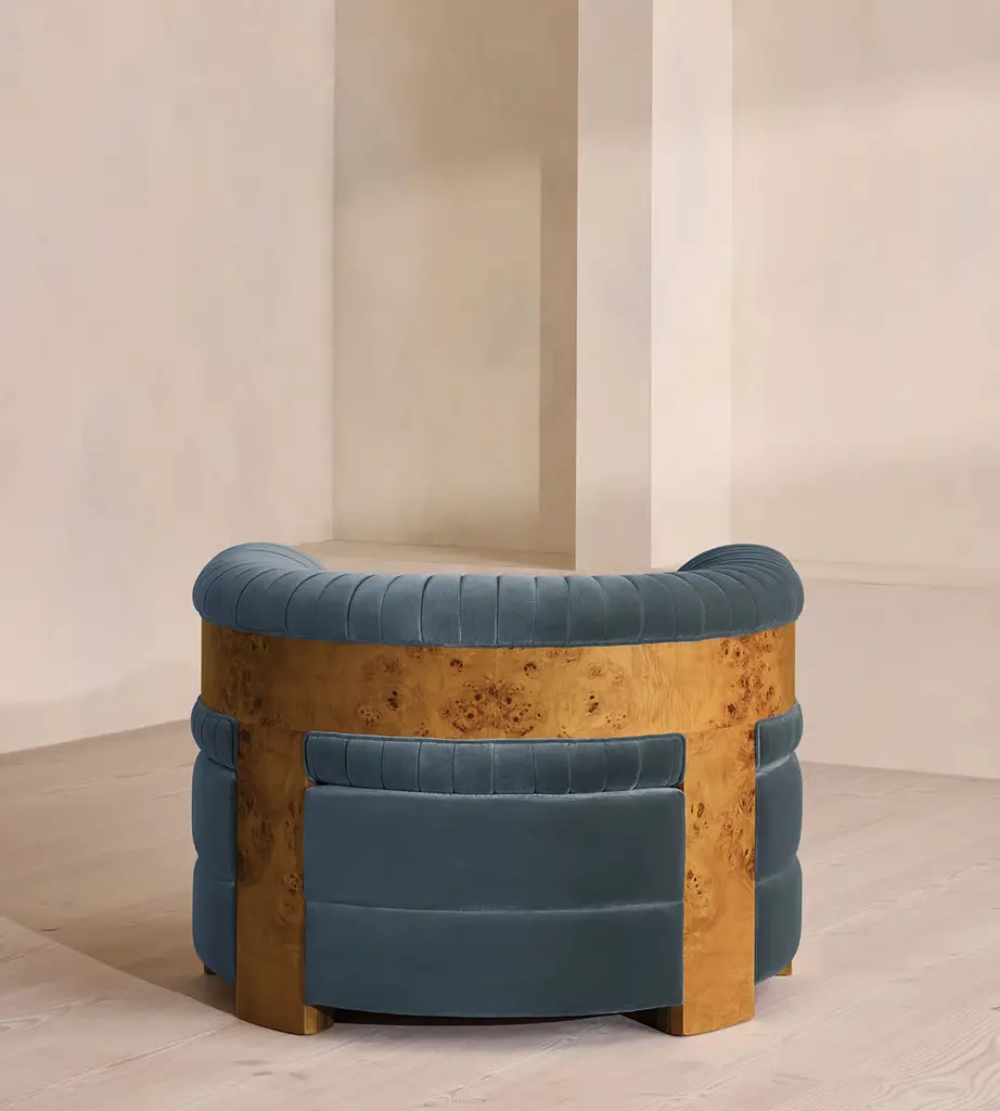 The tubular backrest is distinguished by a fluted design, fully upholstered in cotton velvet. A tubular, fluted backrest and fixed cushions contrast with mid-tone mappa burl veneer. The wood wraps around the backrest and legs of the Caleb armchair, which is fully upholstered in cotton velvet and available in our made-to-order velvet color palette.