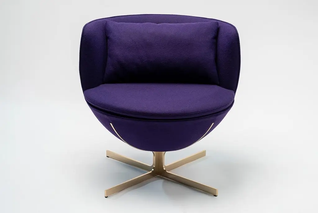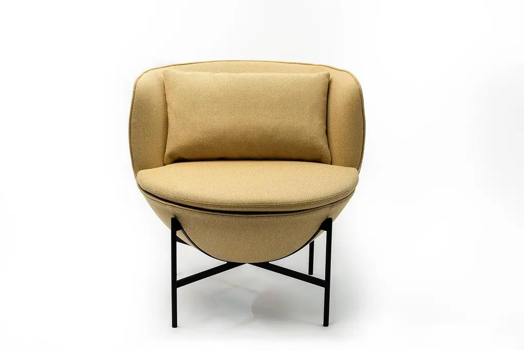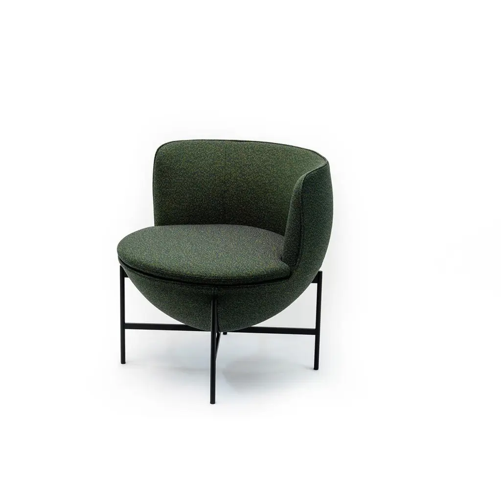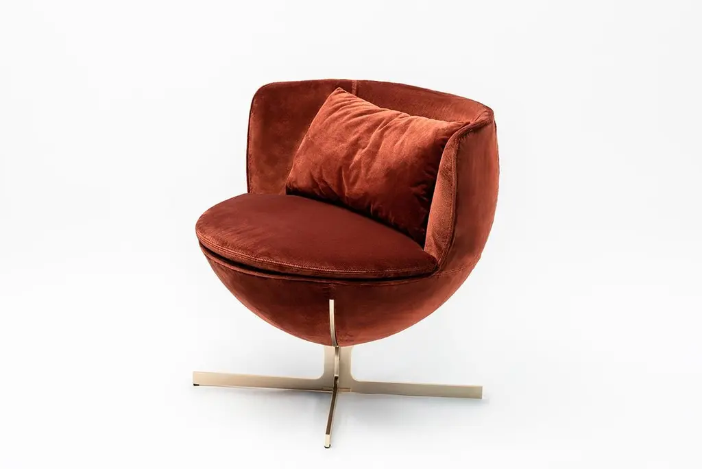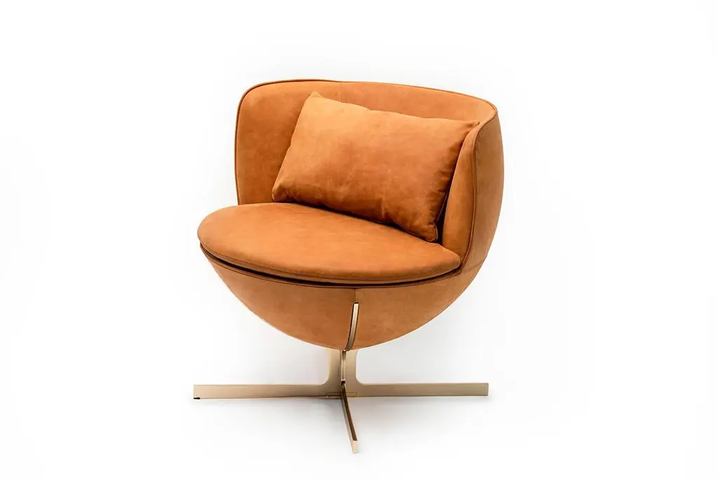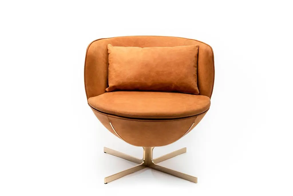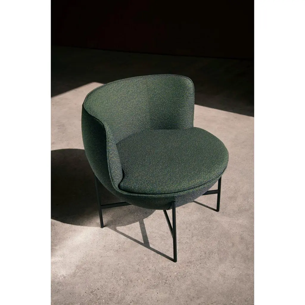 Calice armchair four-leg base by Patrick NorguetMaterials: Upholstery: Fabric or leather Structure: Black powder-coated metal or matte champagne and black chrome Dimensions: W 72.8 x D70.7 x H 71.6 cm HS 43.7 cmThe Calice armchair owes its name and shape to the ancient sacred cups revered as objects of desire and the subject of many tales of knighthood.The result of designer Patrick Norguet’s high-minded work on simplicity, this armchair is a pure expression ofgeometry: a sphere resting on a single leg, like a chalice, both sacred and precious. Made elegant and comfortable by the interlocking effect and the many details incorporated at the juncture between the seat and the leg, this design makes for an elegant addition to any room and a celebration of all types of settings, from private residences to hotel interiors.Base available with a cross-shaped structure or with four legs, in black metal or champagne color.Patrick Norguet approaches objects and design from a graphical perspective. Since childhood,he has preferred sketchbooks to textbooks, filling them up with sketches and drawings. A “handson” approach of industry and design studies in Paris (ESDI) mark the unusual profile of thisconstructive rebel. His career underwent a dramatic change in 2000 when Giulio Cappellini spotted hisnow famous Rainbow Chair.He joined the circle of designers that matter and created his Parisian studio. Since that time, he has been designing for major producers and renownedbrands. Drawing inspiration from everything that surrounds him, Patrick Norguet does not followtrends but seeks to give shape to products whose relevance and modernity would withstand the testof time.