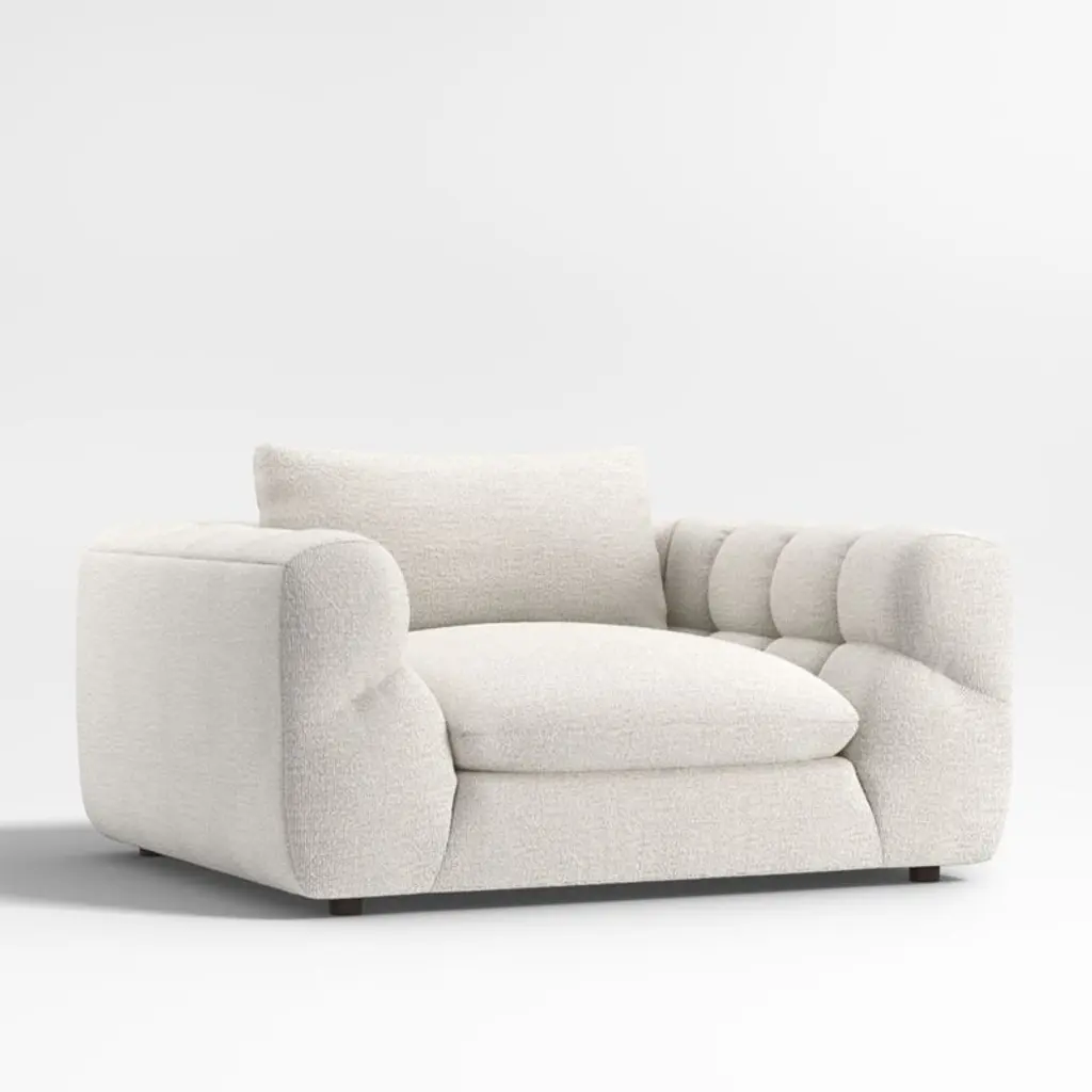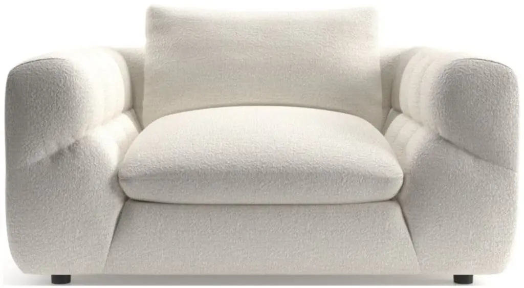 Cambria brings the forward-looking lines of Italian design to the effortless style that defines Crate & Barrel. Sitting deep, low and modern, the roomy chair and a half curves a deeply cushioned frame topped with a plush bench seat and back cushions. White boucle covers the oversized chair with inviting texture, while deep tufting on the arms and back enhances its pillowy appeal.By choosing FSC ®-certified furniture, you are supporting responsible management of the world's forests.
