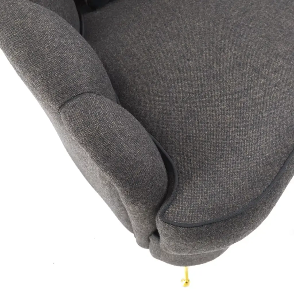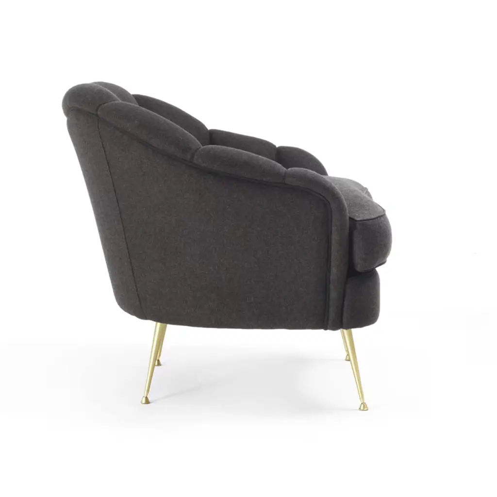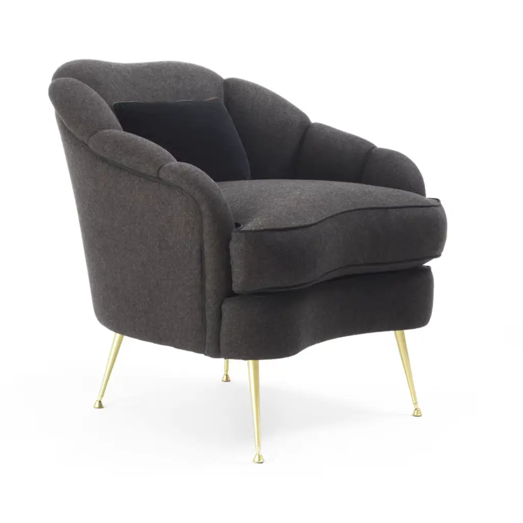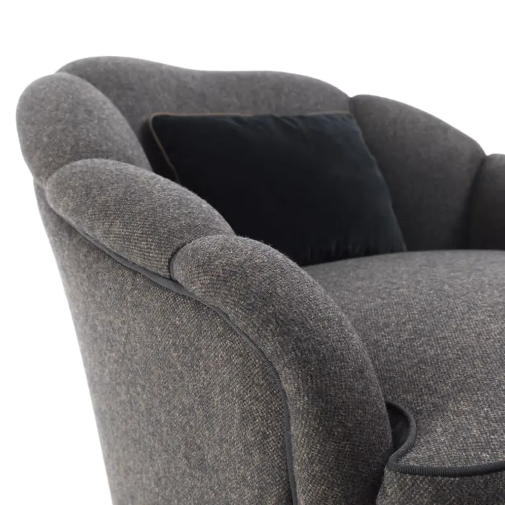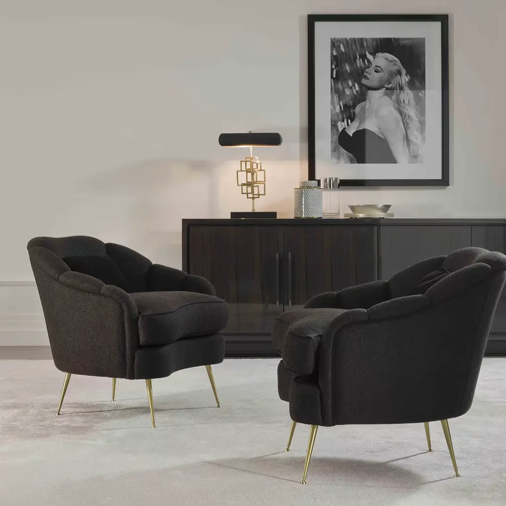Part of the Camelia collection, and ideally paired with one of the coffee tables in the same series for a complete look, this elegant armchair mixes indulgent comfort with sleek design. The structure is in solid wood and plywood and supports a padded frame in polyurethane with lining in polyester fiber and supported by elastic belts. The seat is in goose dawn with a central insert of polyurethane and a removable fabric cover, which matches the cover of the rest of the enveloping structure (non-removable). The feet are in satin-finished brass.
