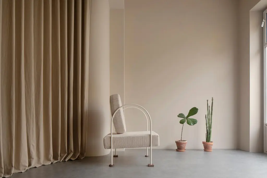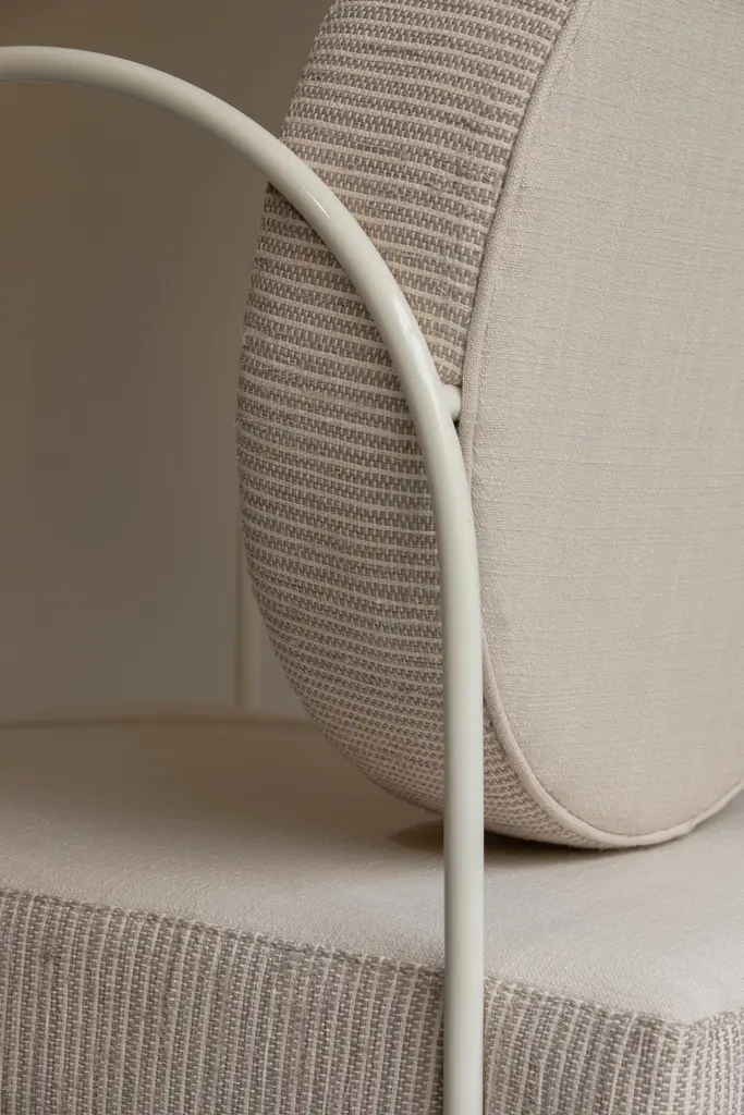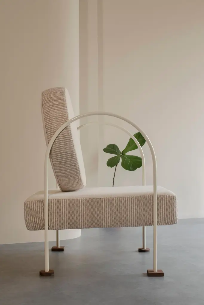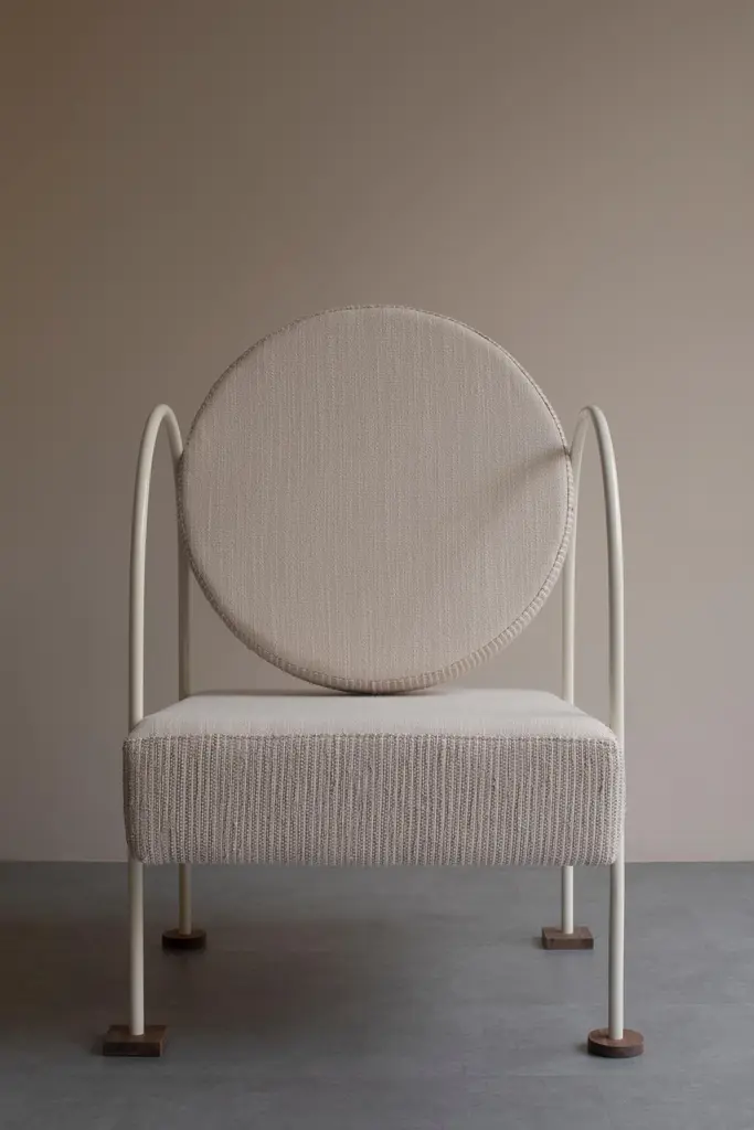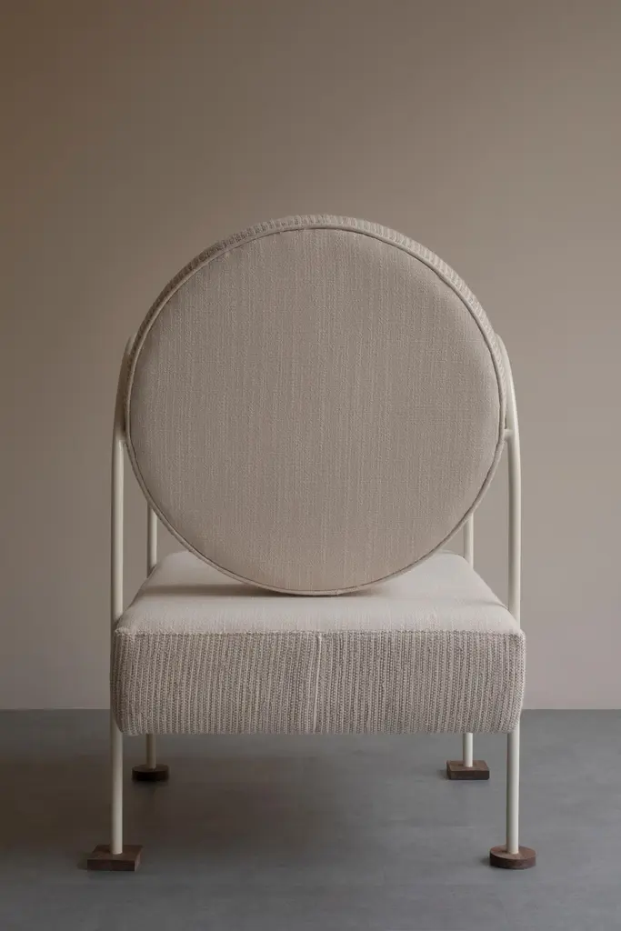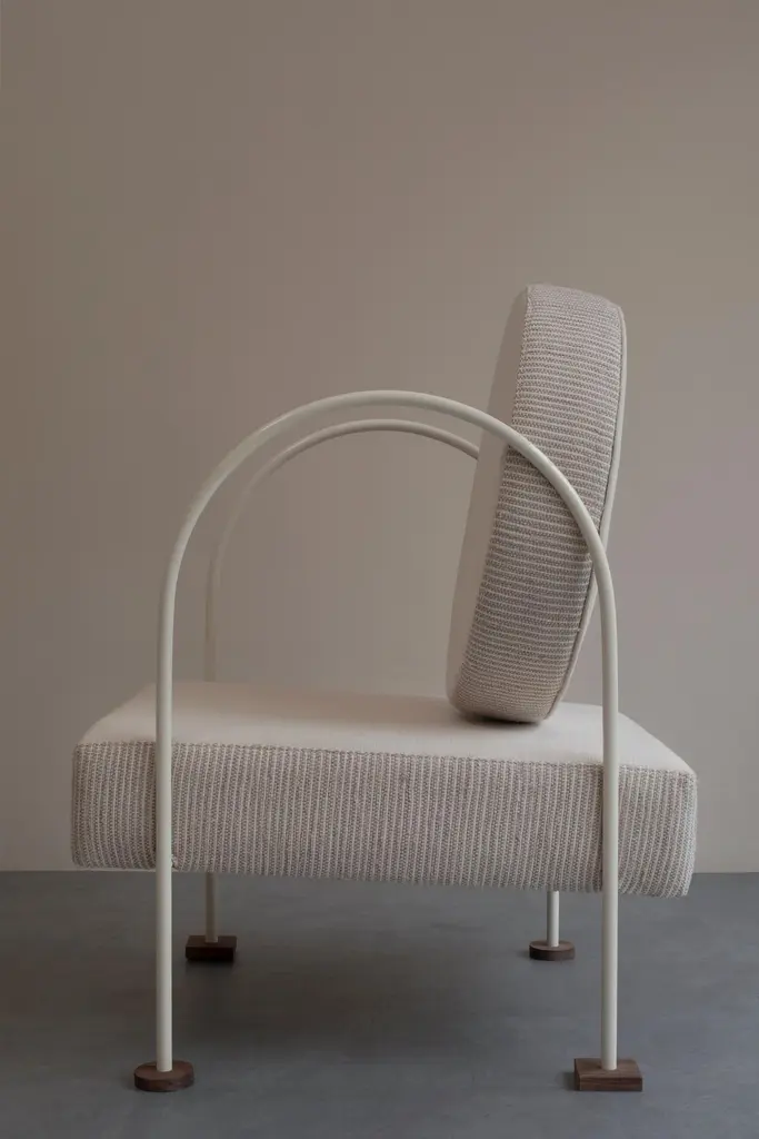 Capsule Armchair by Studio GameiroDimensions: D 70 x W 90 x H 100 cm.Materials: Recycled cotton, lacquered steel, and wood.Studio Gameiro is an innovative, multidisciplinary, and design-focused agency that specializes in exploring relationships between traditional artisanship, sustainable design, and bespoke solutions for interiors, lighting design, furniture design, and architecture. We are passionate about promoting local artistry, designing with context, and finding solutions to complex briefs, and spatial and structural challenges.We experiment and establish concepts using tone, materiality, and warmth, and have a strong belief in rooting our designs in a contextual analysis of place. We believe that the future of architecture is about balancing contemporary, functional design with sustainably sourced materials and preserving, protecting, and celebrating local craft and culture. From our base in Lisbon, we have projects across Western Europe, and we search for clients and projects with the transformative potential to create new spaces and territories that fit within our ethos, celebrating local craft, bridging disciplines, and exploring contemporary notions of design.