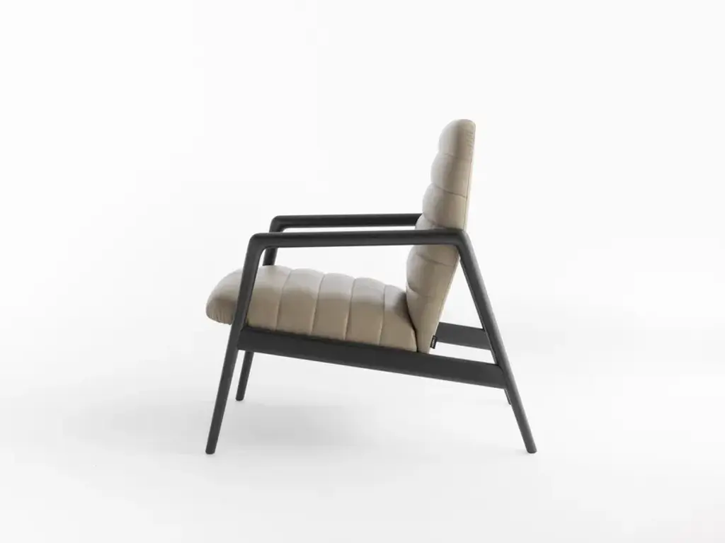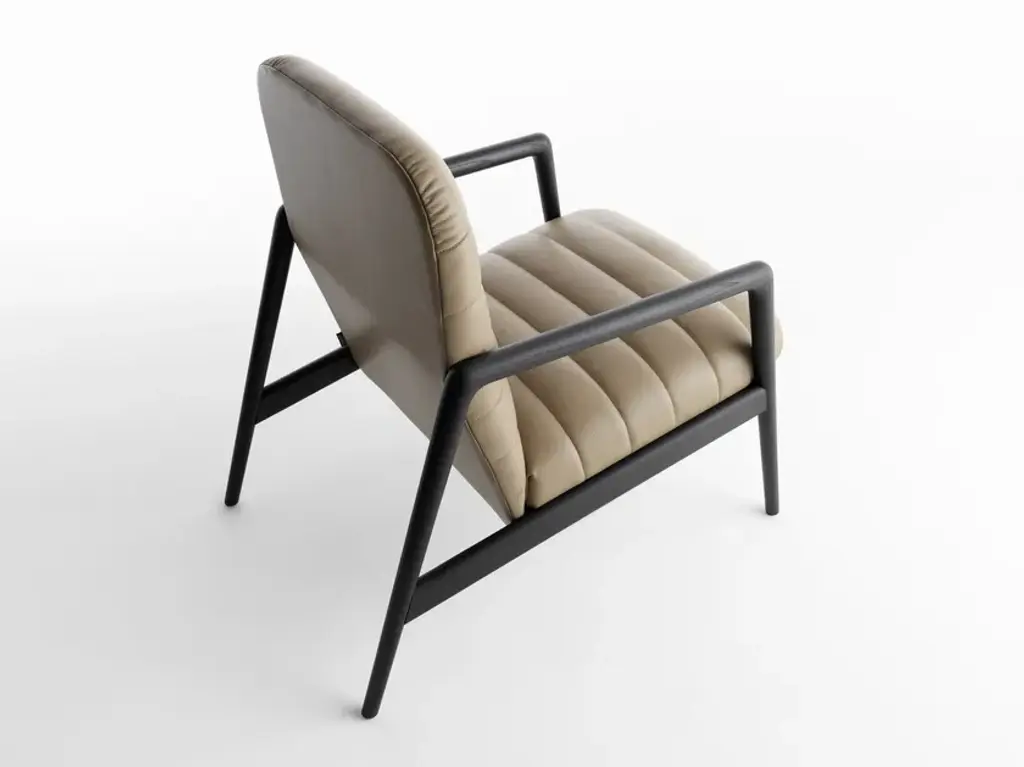 Ergonomic chair for relaxation and waiting areas. Convenient, comfortable and innovative in its timelessness. The wooden base supports the ergonomic structure and has a strong Scandinavian appearance. Essential and timely design: the body is thickly padded. Base: black ash. Covering: fabric | leather.