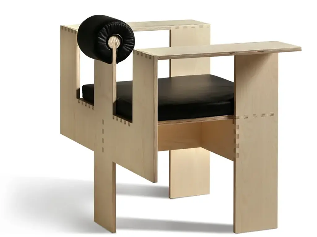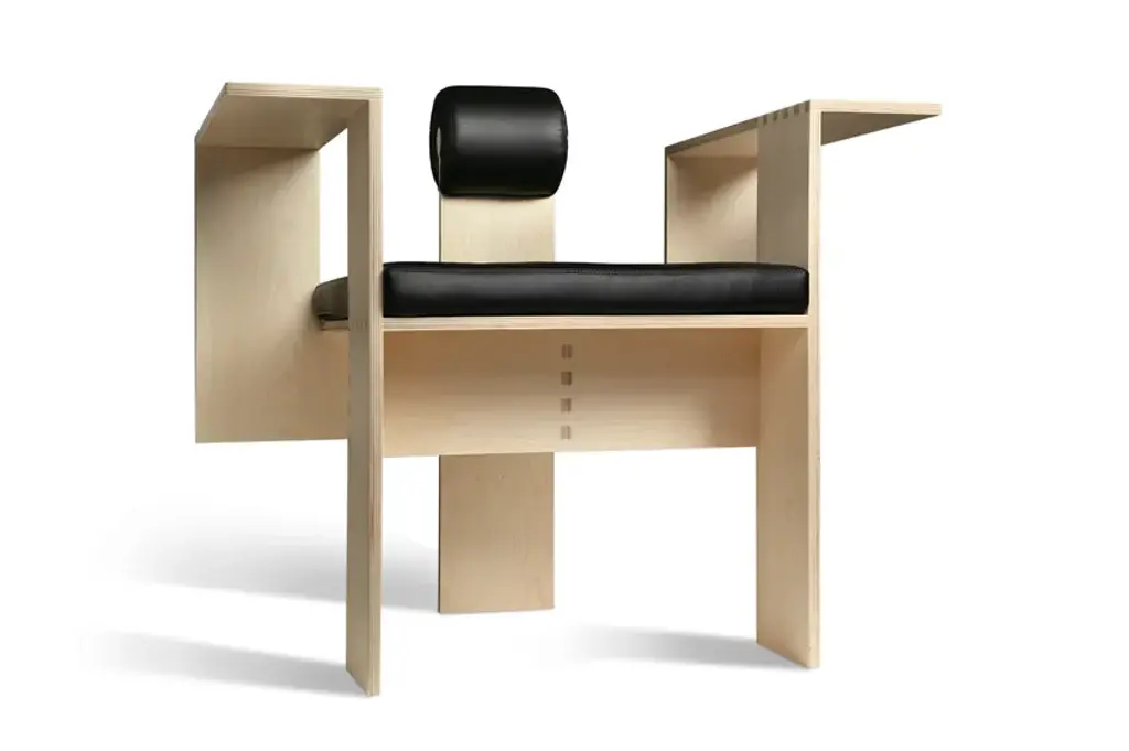 Chaise Morelato- This armchair has initially been donated by the famous Architect Mario Botta to the Aldo Morelato Foundation during the activities of the year 2013. After several exhibitions and the success obtained, Morelato has decided to put this piece on catalogue. The armchair is made of 16 mm beech plywood, with maple veneer and joint assembly. The armchair has a leather upholstered seat and back.