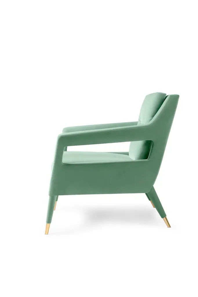 Chantal Armchair by MunnaDimensions: D 88 x W 78 x H 85 cm. SH: 46 cm.Materials: Wood, foam, brass, and upholstery.Finish: Cotton Velvet Green Duck Egg, CV19, and polished brass.Available in all Munna fabrics except Wild Silk. Available in client’s ownmaterial. Available upholstered, Rosewood or Ebony veneer, solid Walnut, Wengé stain, or lacquer in all RAL colors, in matt or gloss. Fire retardant interlining is available on request. Handmade in Porto. Please contact us.Established in Porto in 2008, Munna is a furniture design brand renowned for creating handmade upholstery with unmatched craftsmanship, seamlessly blending noble materials and timeless design, for both commercial and residential projects.Made by hand in Porto, Munna’s pieces honor the profound heritage of craftsmanship, while drawing inspiration from history’s most influential artistic periods. Munna’s pieces are made of the finest fabrics such as cotton velvet, twill, leather, and silk; the finest wood veneers, such as ebony, walnut, and rosewood; sumptuous gold, silver, and copper leaves, metal details in brass, nickel, and copper, and superior lacquers.