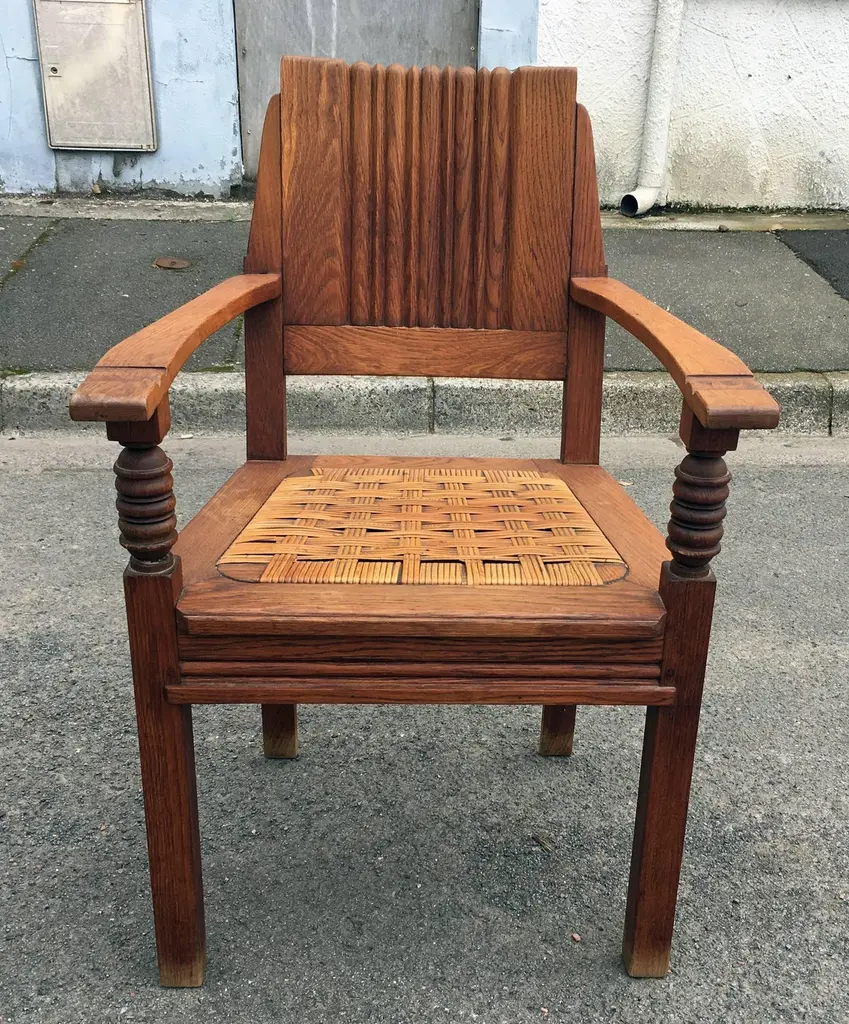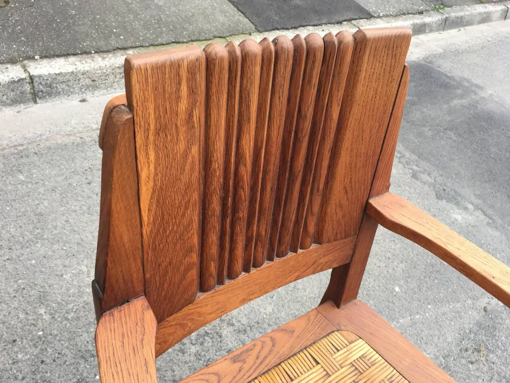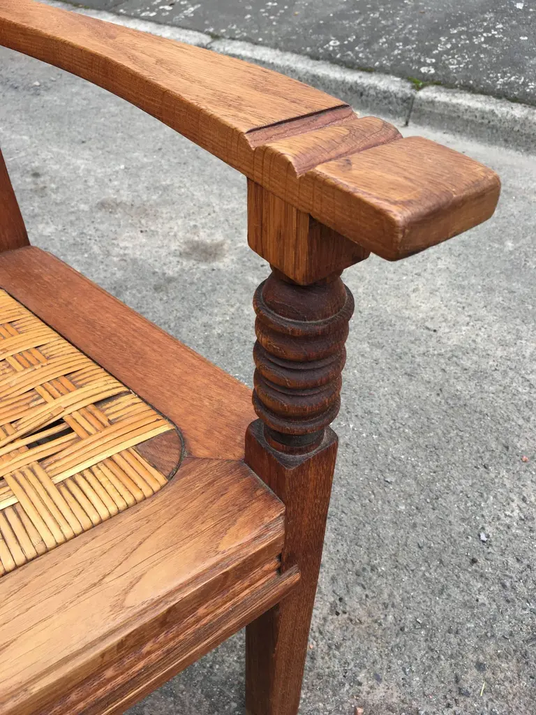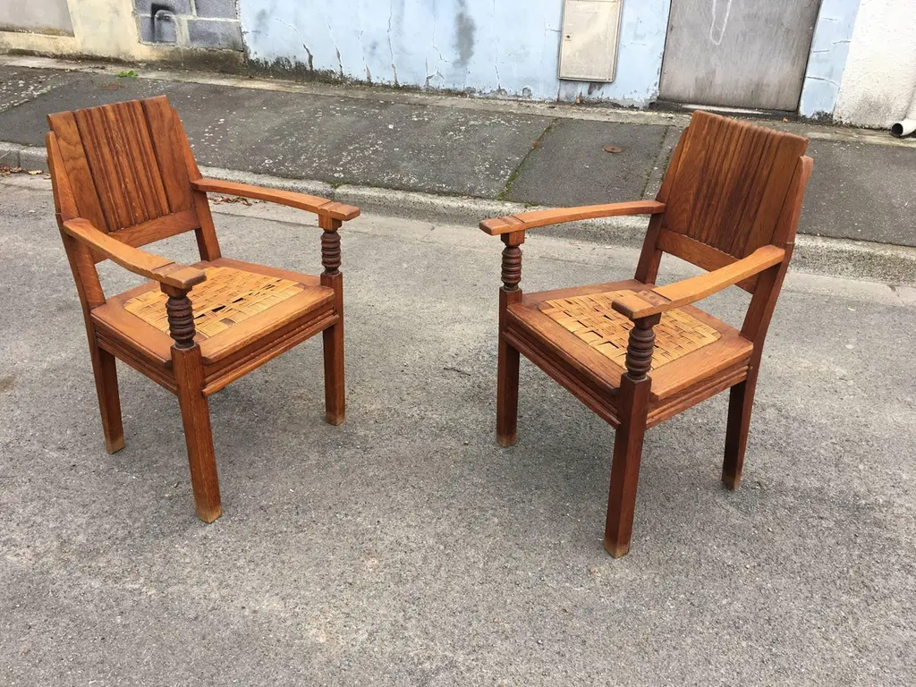 Charles Dudouyt, two armchairs in solid oak and wicker. circa 1940cane damaged.Possibility to redo the caning if necessary.
