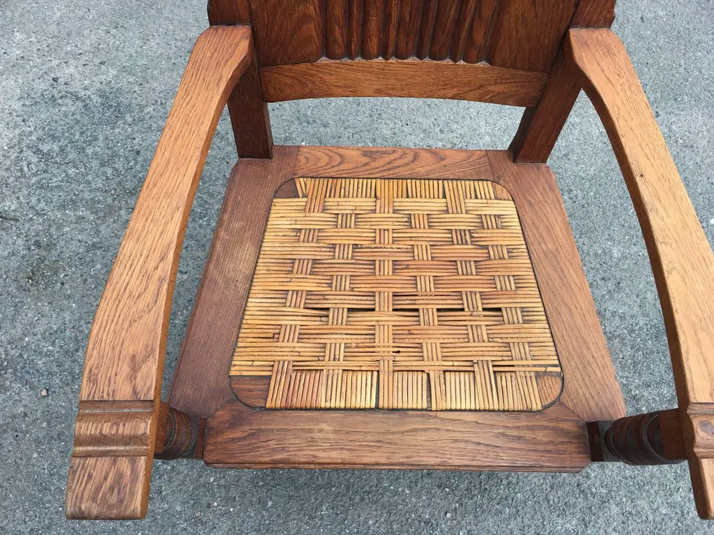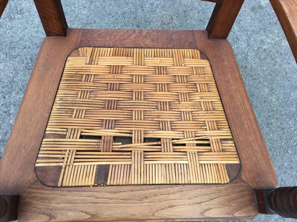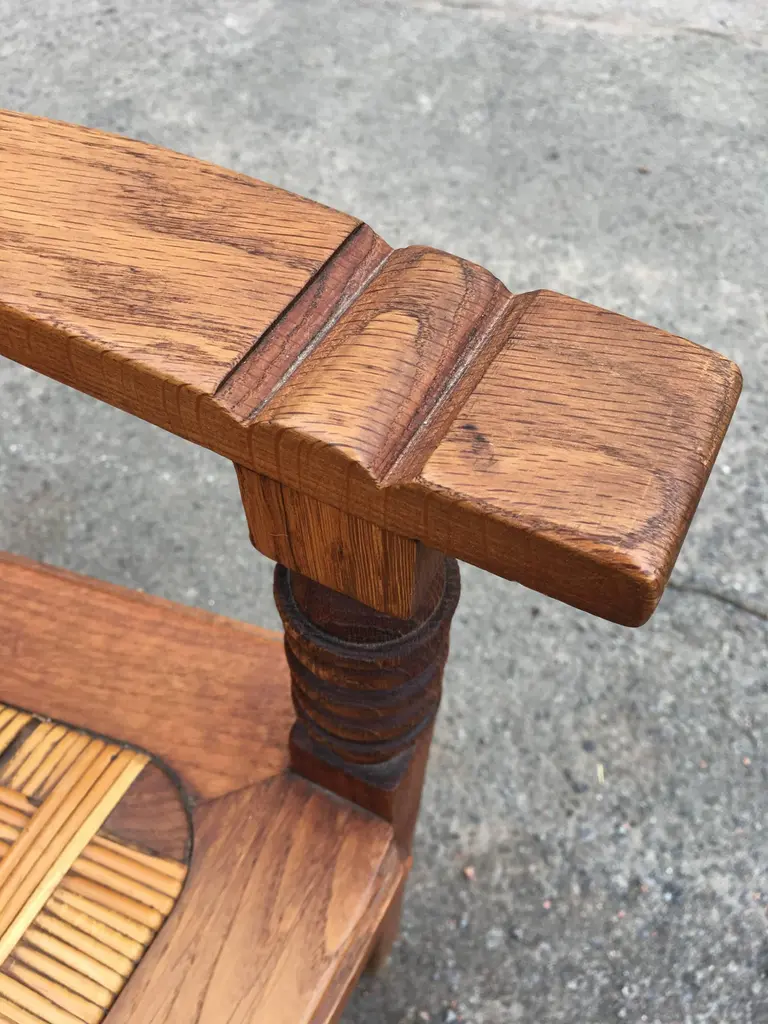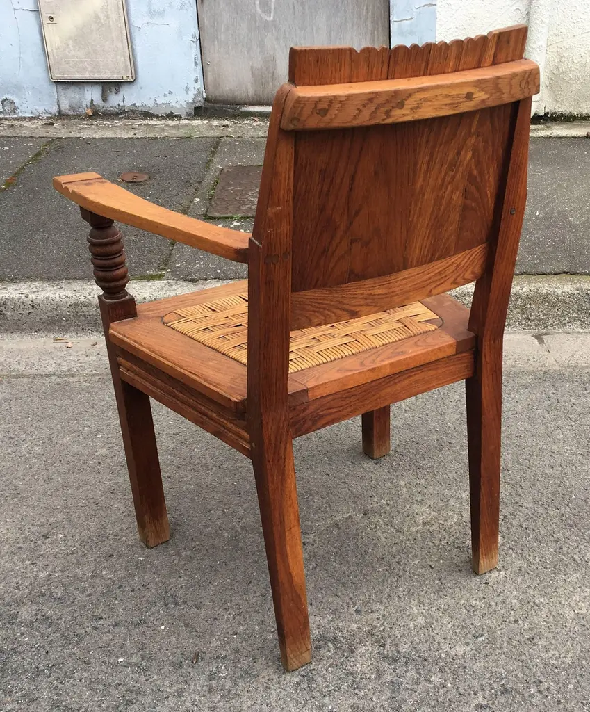 Charles Dudouyt, two armchairs in solid oak and wicker. circa 1940cane damaged.Possibility to redo the caning if necessary.