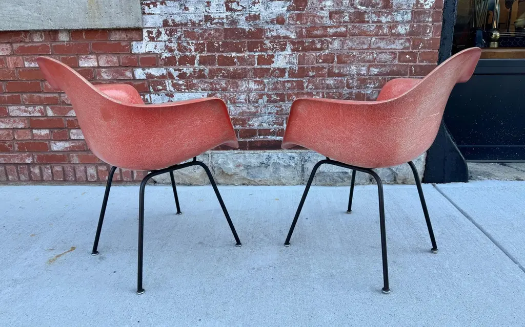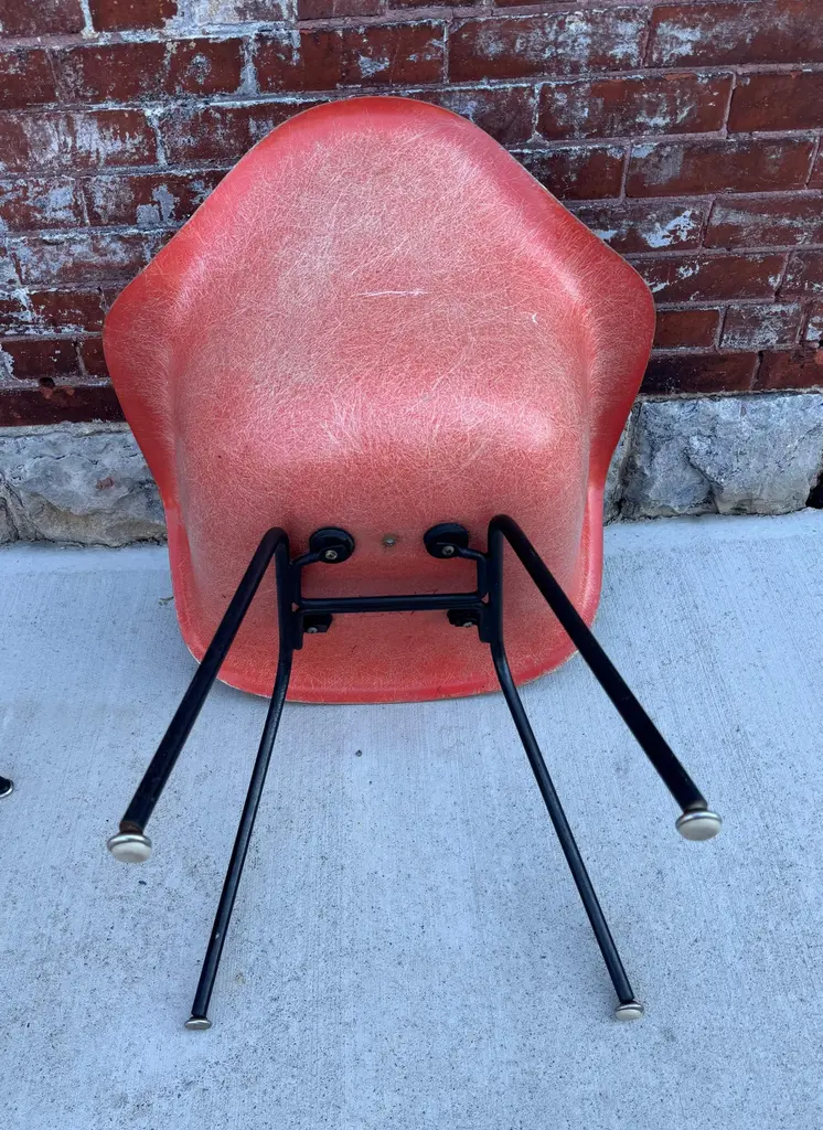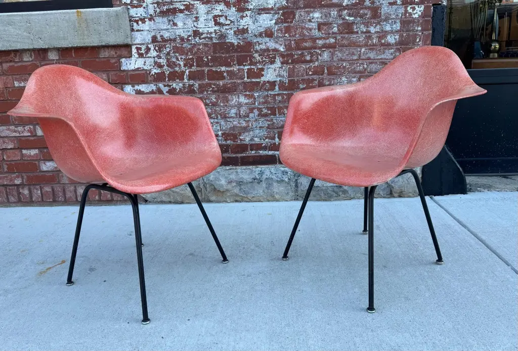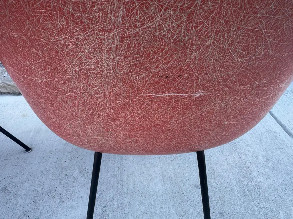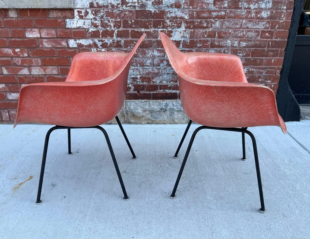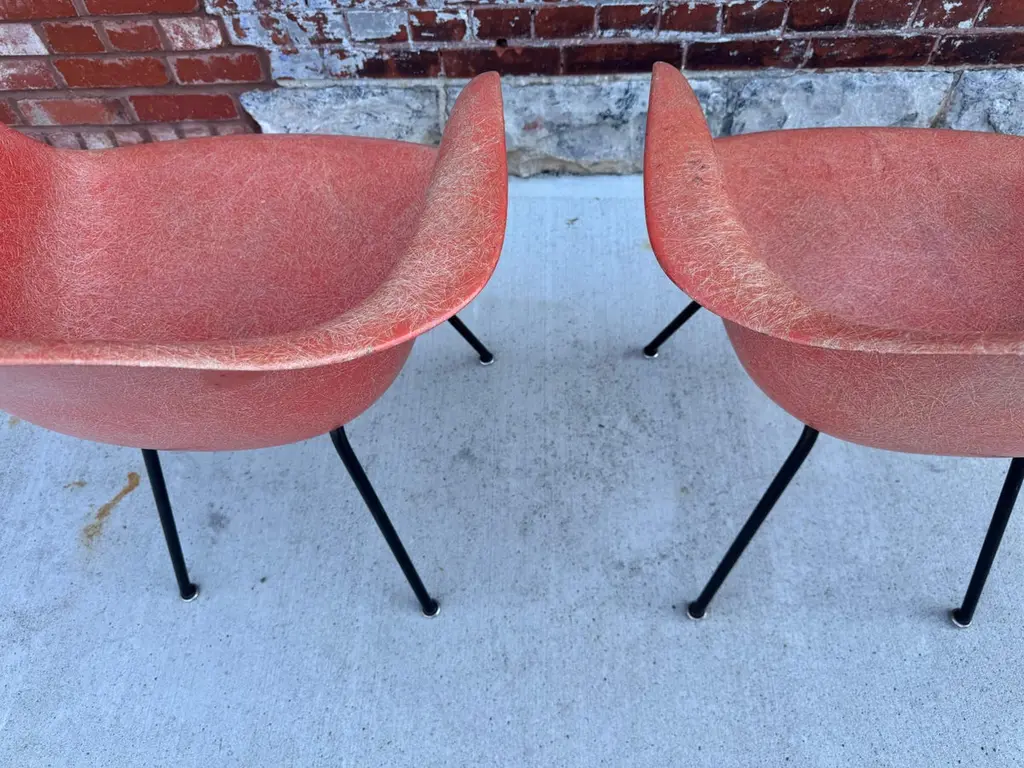 Matched pair of Early 1950's Charles & Ray Eames 2nd Generation DAX Fiberglass Armchair unusual color... Wonderful crimson / pink shell.. Exposed fibers,, Early iron steel "H" base..retain original feet (glides) Hand written D A X marker. Small factory hole in seat for water drainage.Great examples becoming increasingly harder to find,, Priced per chair.. but would be a shame to break up the pair.