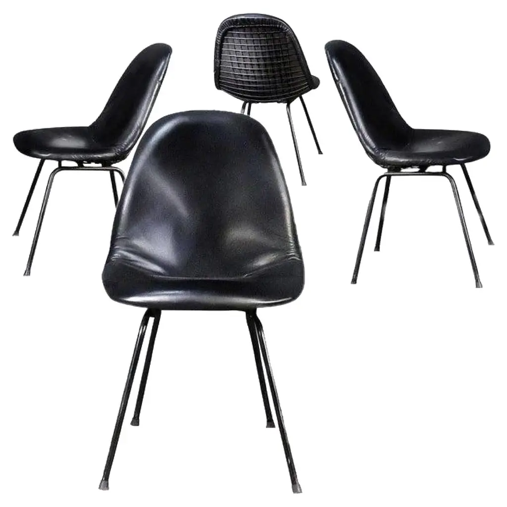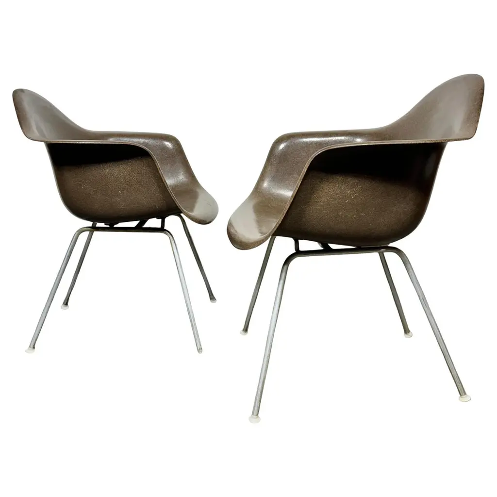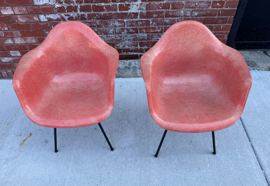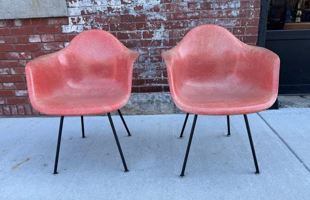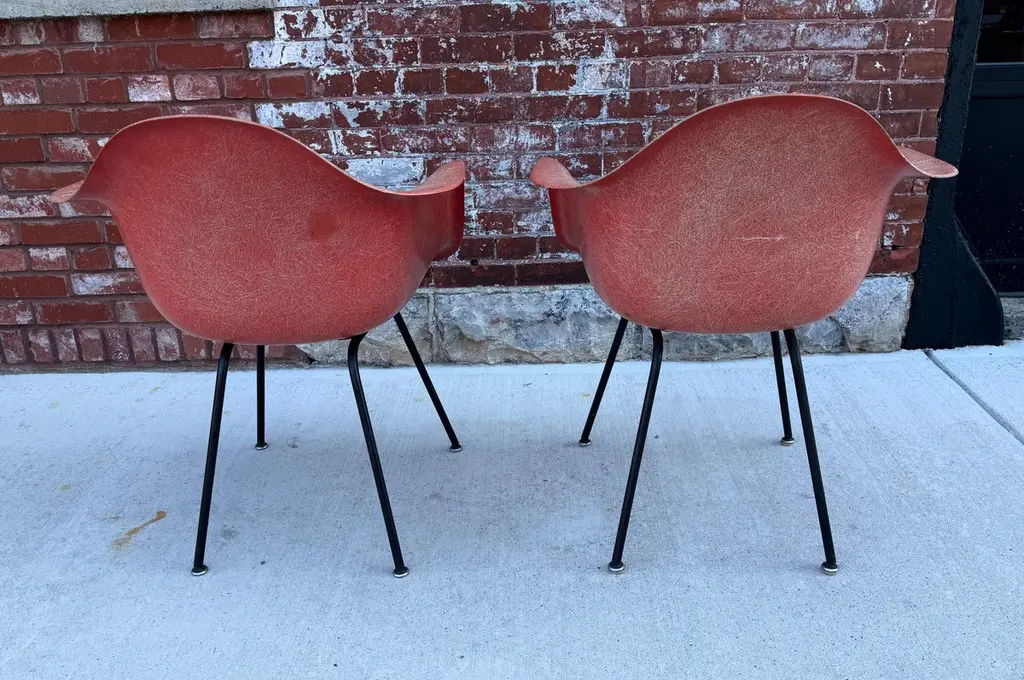 Matched pair of Early 1950's Charles & Ray Eames 2nd Generation DAX Fiberglass Armchair unusual color... Wonderful crimson / pink shell.. Exposed fibers,, Early iron steel "H" base..retain original feet (glides) Hand written D A X marker. Small factory hole in seat for water drainage.Great examples becoming increasingly harder to find,, Priced per chair.. but would be a shame to break up the pair.