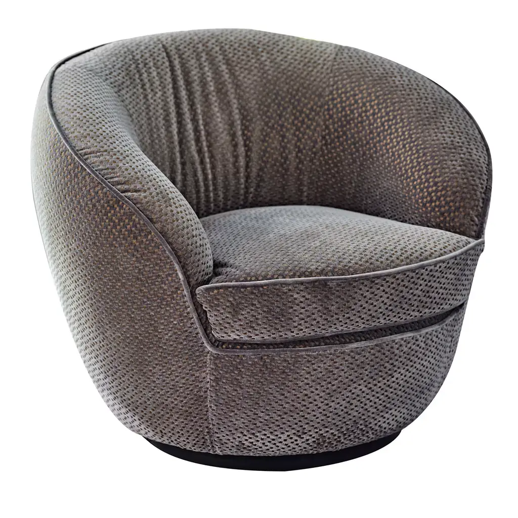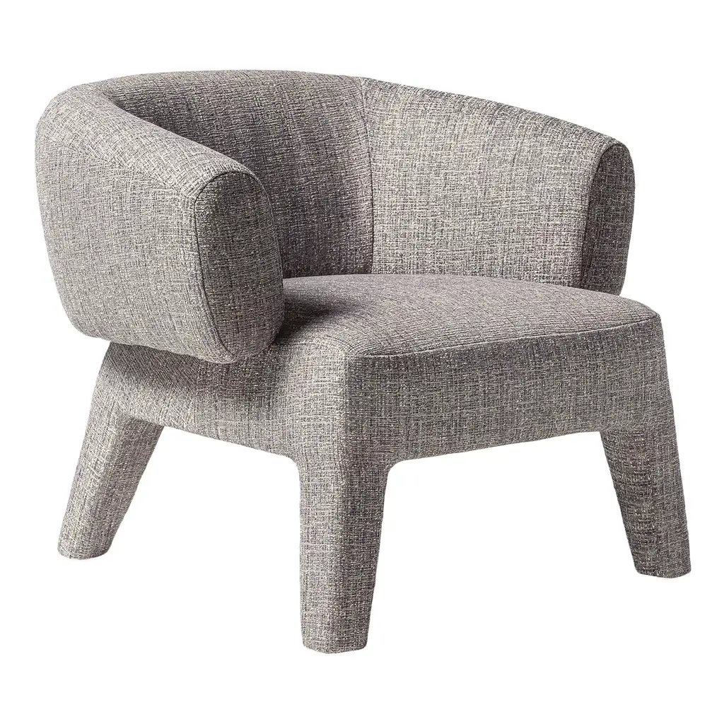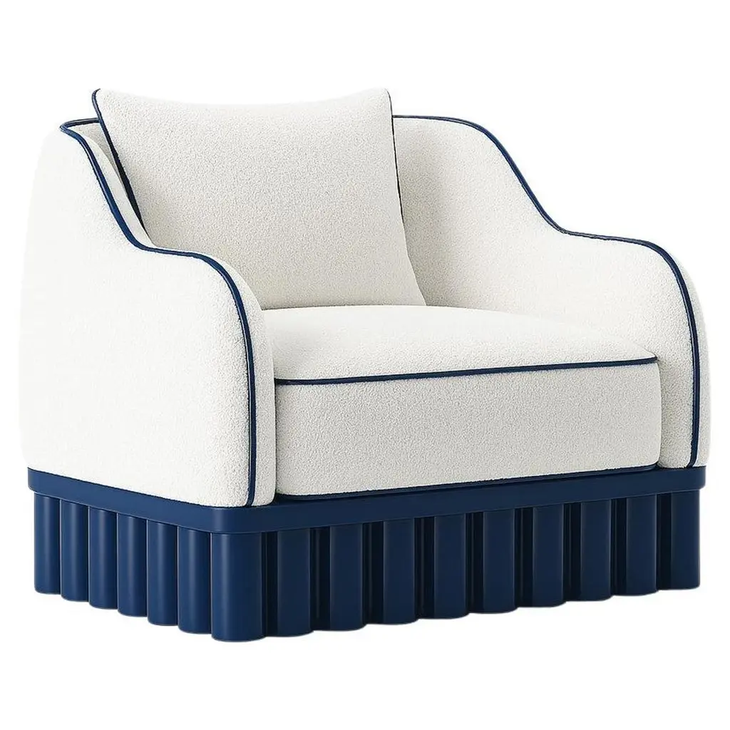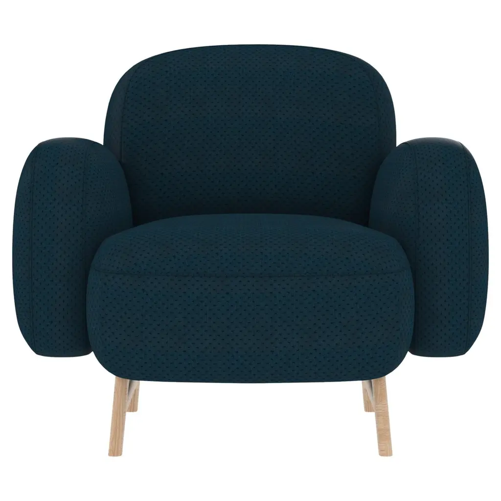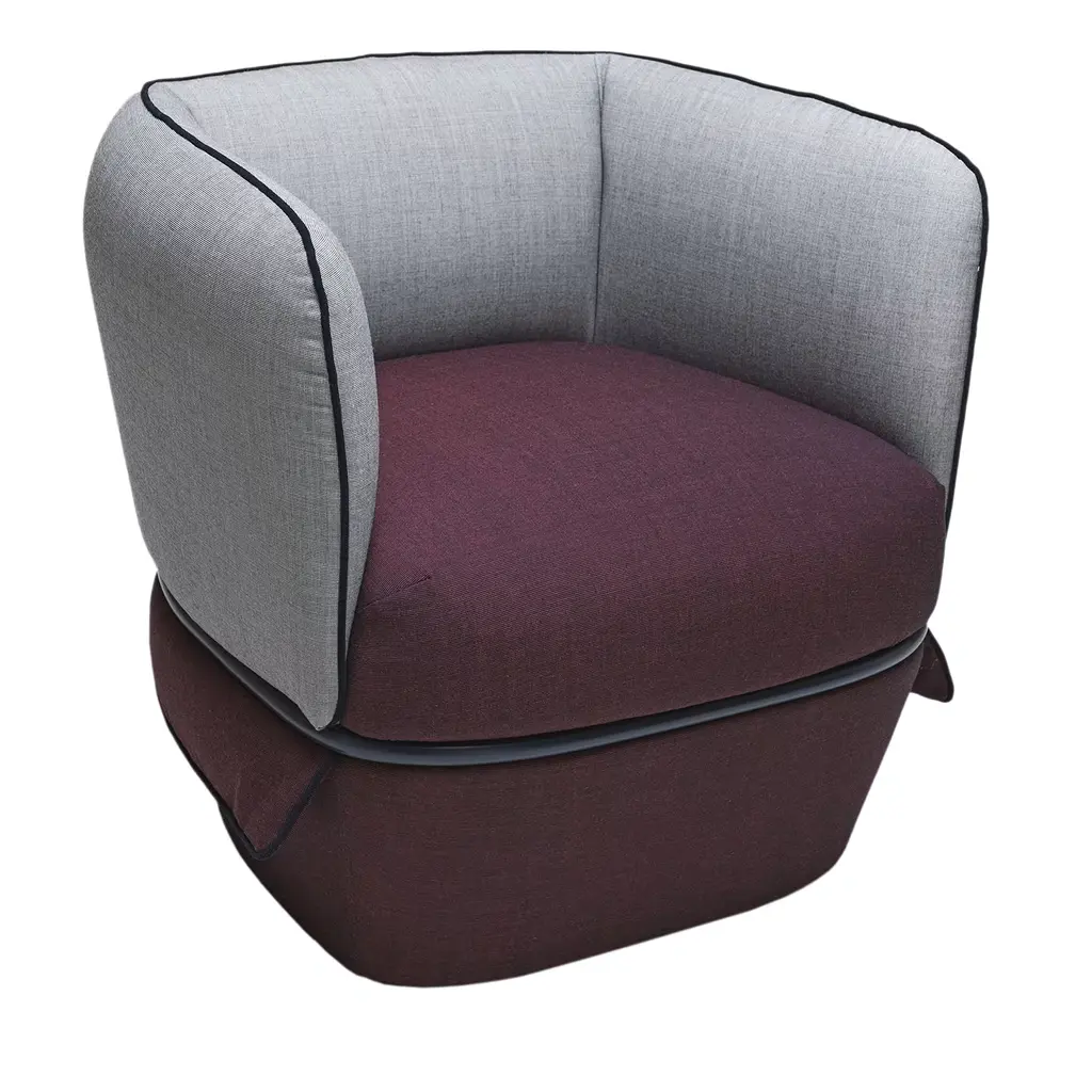 This vivacious, eclectic design by Studio LI_DO will make a singular statement in a contemporary interior. With a structure made of wood held together with a red-lacquered steel ring, the piece is softly padded with polyurethane foam and polyester fiber and features a thick base with a tall, embracing backrest. The seat is upholstered in blue velvet and the back in a gray-and-blue embroidered fabric.