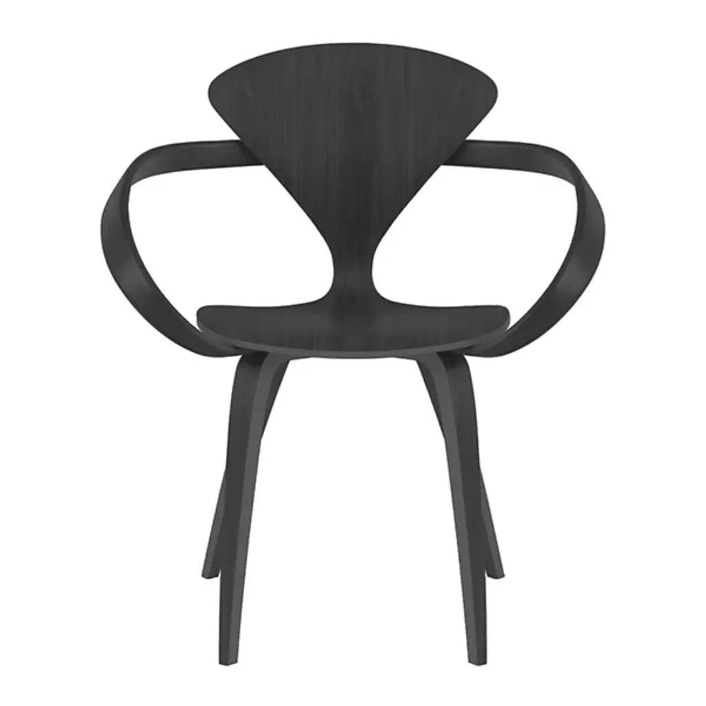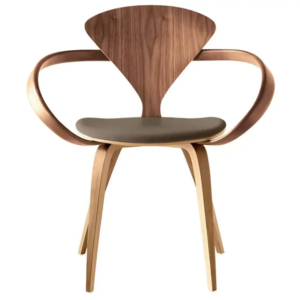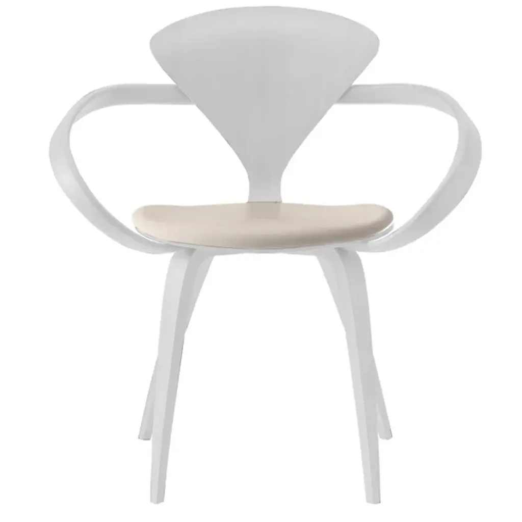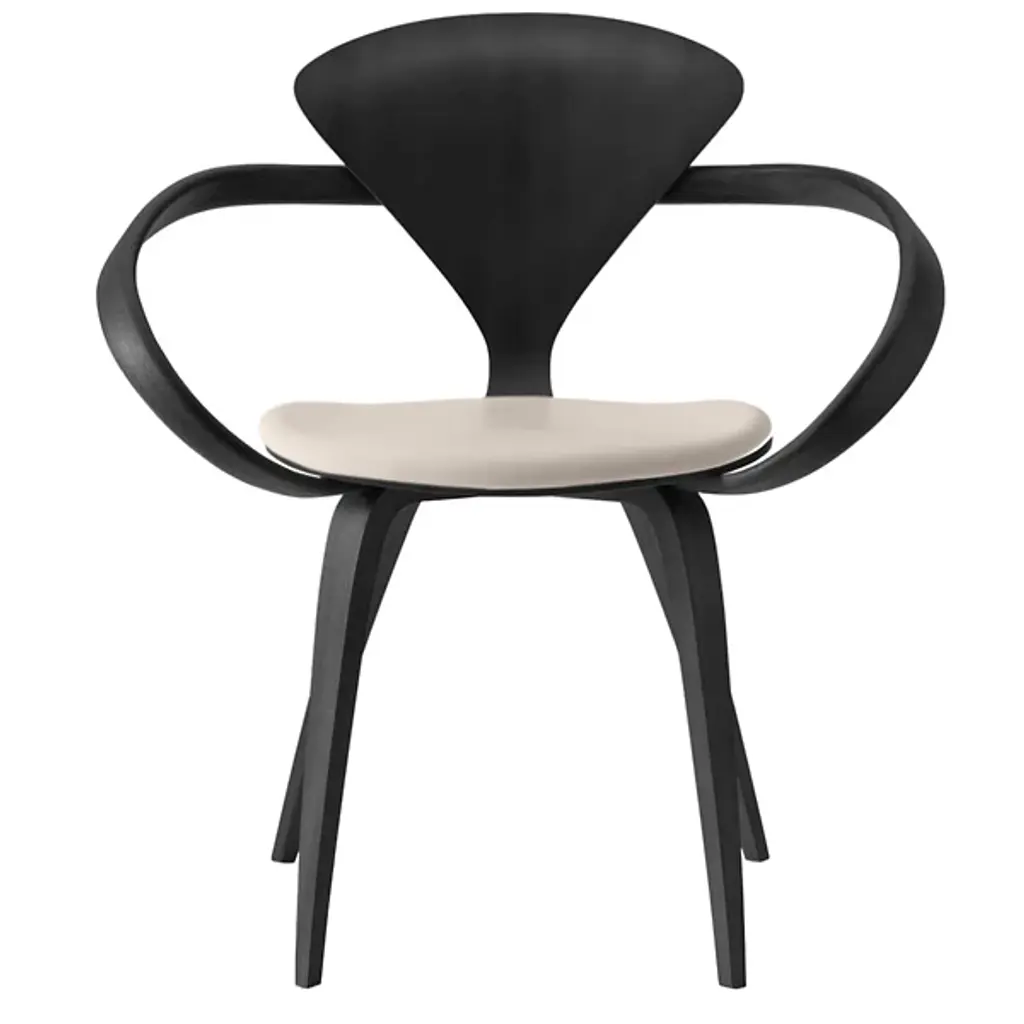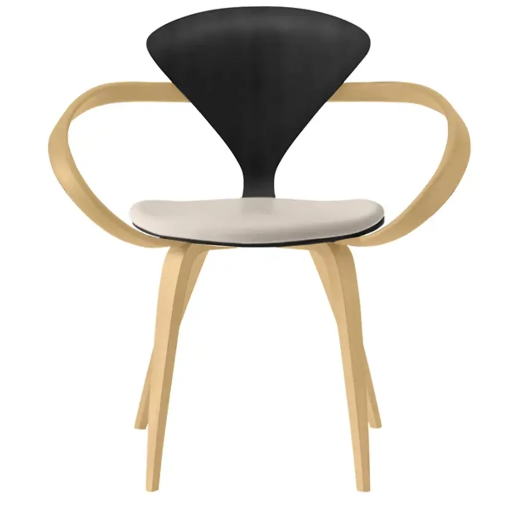 Ionic mid-century modern style designed in 1958. Highlighted by gentle curves, the Cherner Armchair with Seat Pad by Cherner Chair Company is complete with style, comfort, and durability. The structure of the chair is a combination of molded plywood shell of tapering thickness, solid bent wood arm, and a laminated wood base. The upholstered seat pad offers comfortable seating, while the curved arms made of solid bent wood provide a convenient spot to rest your hands.