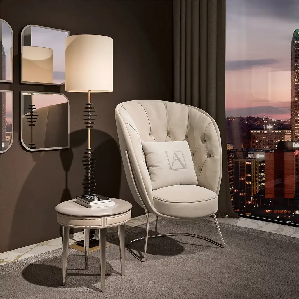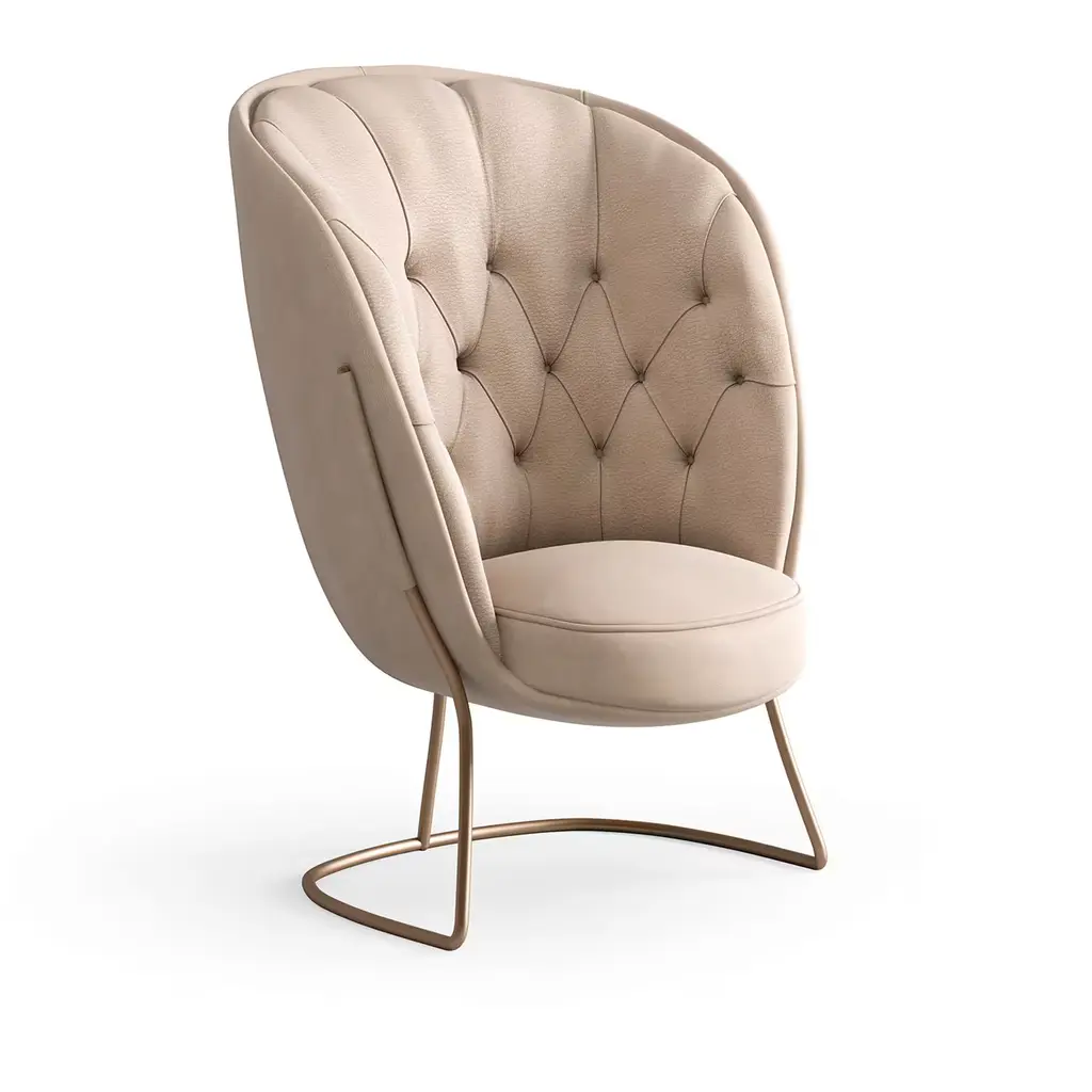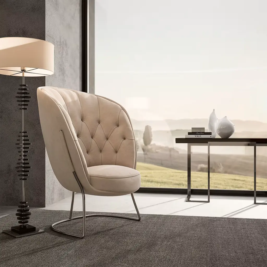 An example of masterful craftsmanship, the Chiffon Armchair merges contemporary and classic elements to assure absolute elegance in a curated interior. Boasting a slender cylindrical cantilever metal base with a satin finish, the rounded, generous silhouette channels the iconic Art Deco style, with a metal frame padded with multi-density polyurethane and upholstered in soft beige velvet. The over-sized back is reinforced with memory foam and embellished with diamond-quilted, button-tufted details for added opulence. Upholstery is available also in leather upon request to the Concierge.
