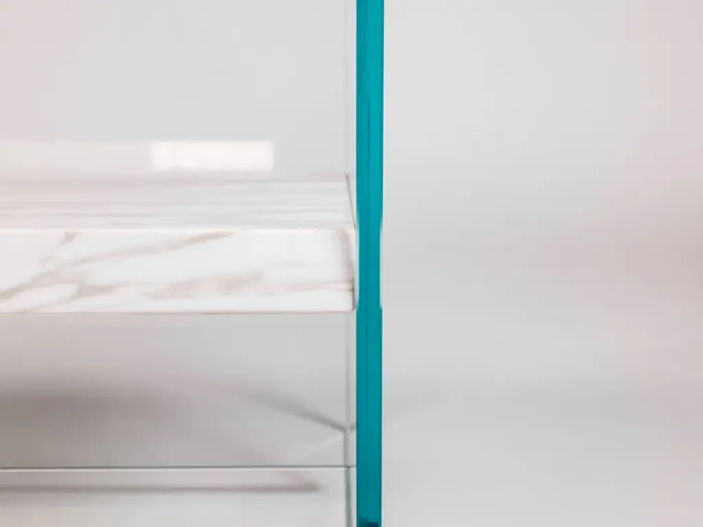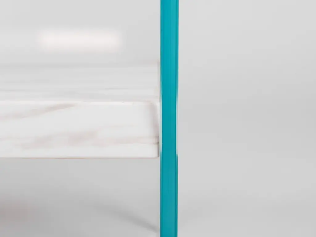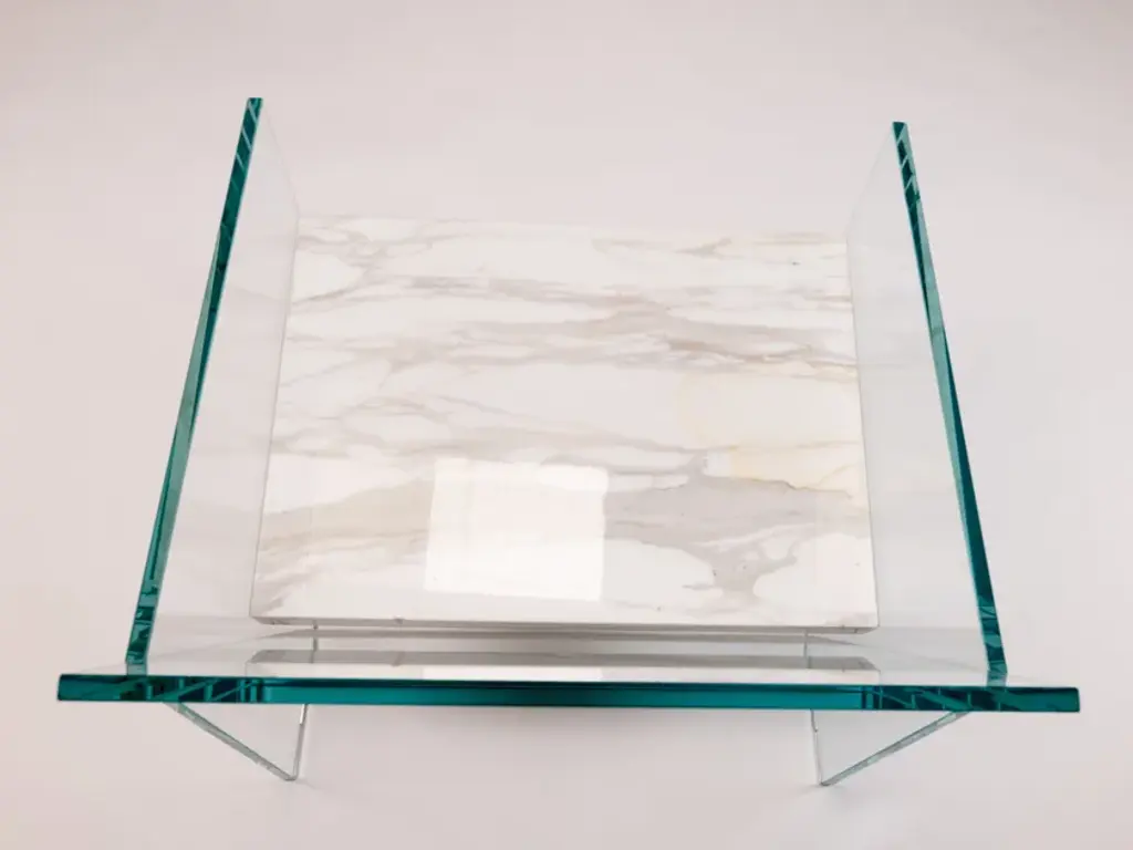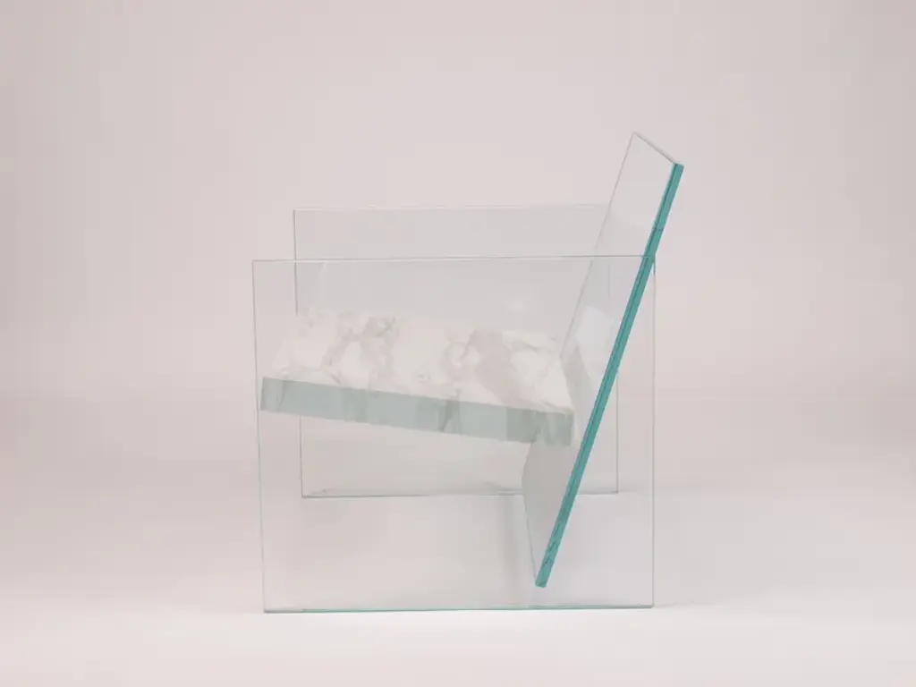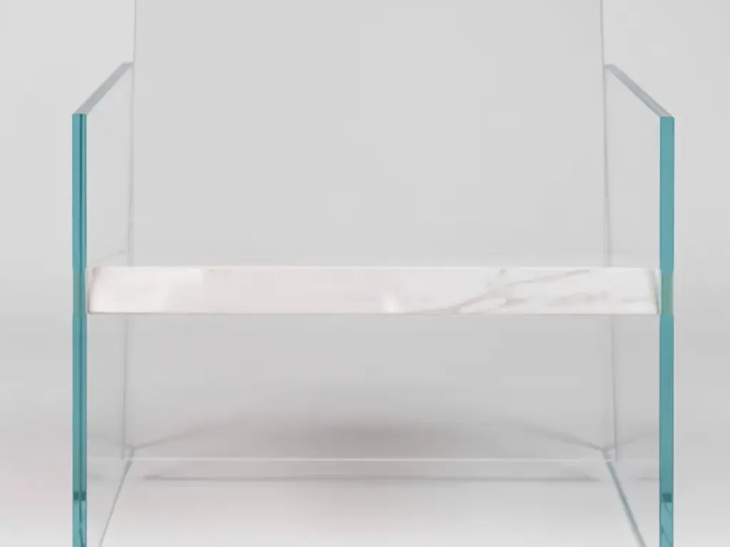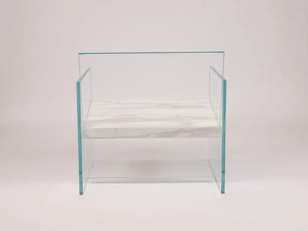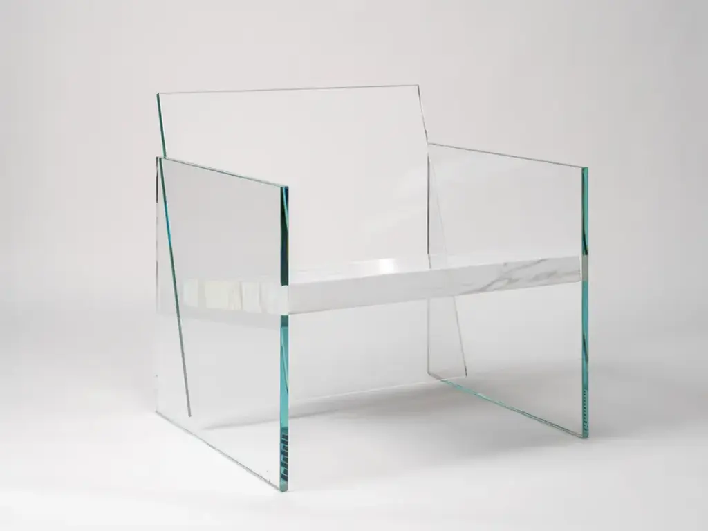 Lounge chair in 3/4" ultra clear tempered glass with 2"1/4 laminated onyx slab. The chair uses no hardware or mechanical fasteners and is assembled using only UV bonding. Each piece has been stamped and numbered and comes with a certificate of authenticity. The weight of each chair is approximately 330 pounds and has been laboratory tested to withstand over 1500lbs of pressure. The overall dimensions are 30.5" W x 30" H x 26.5" D and is available in the following finishes: pink onyx, white quartzite, nero absolute granite or custom stone.Product exhibited at Archiproducts Bari showroom - Corso V. Emanuele II, 189 BariThe product may have small imperfections due to exposure.