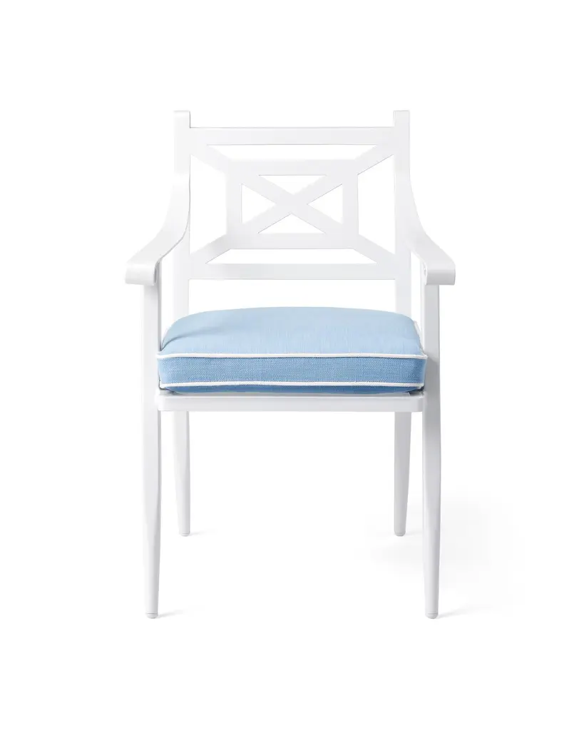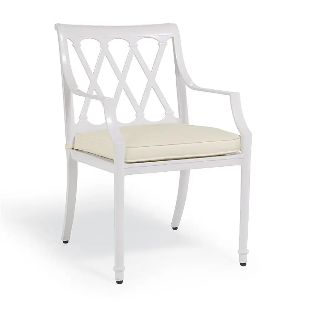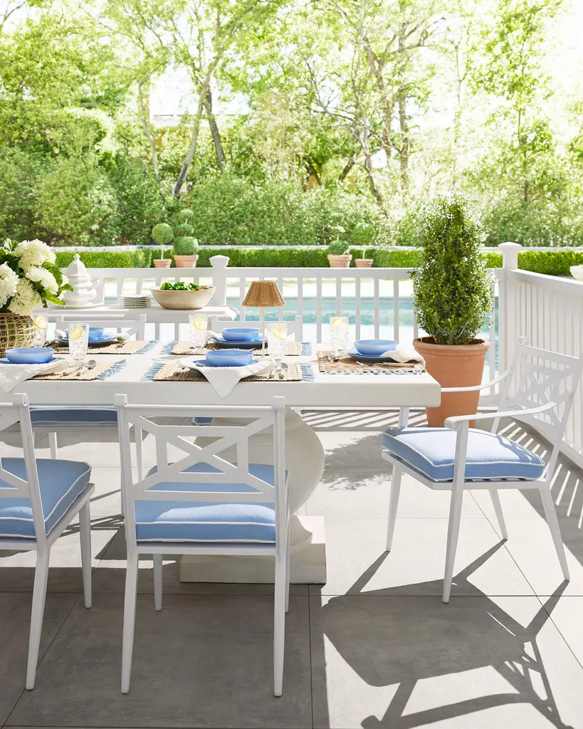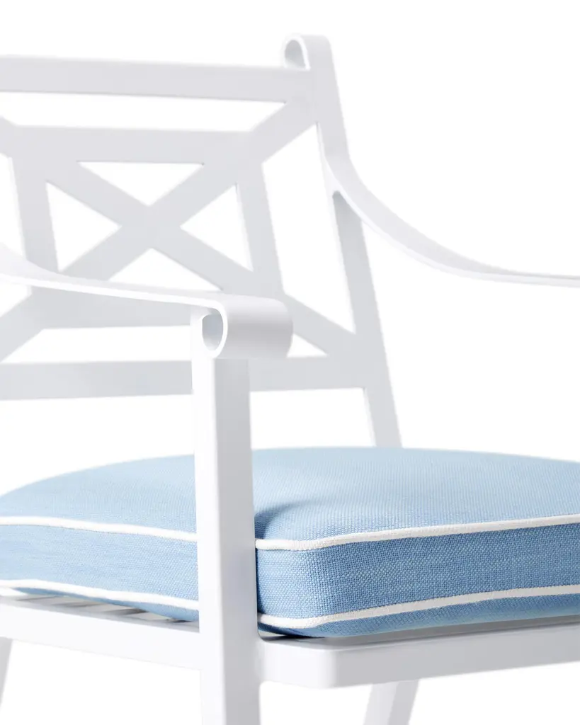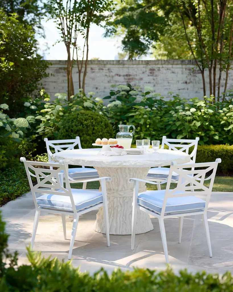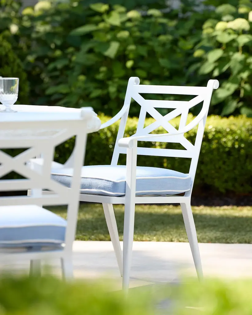 Garden party. A simple silhouette. Retro white comes to life with tailored, plush, and piped cushions.