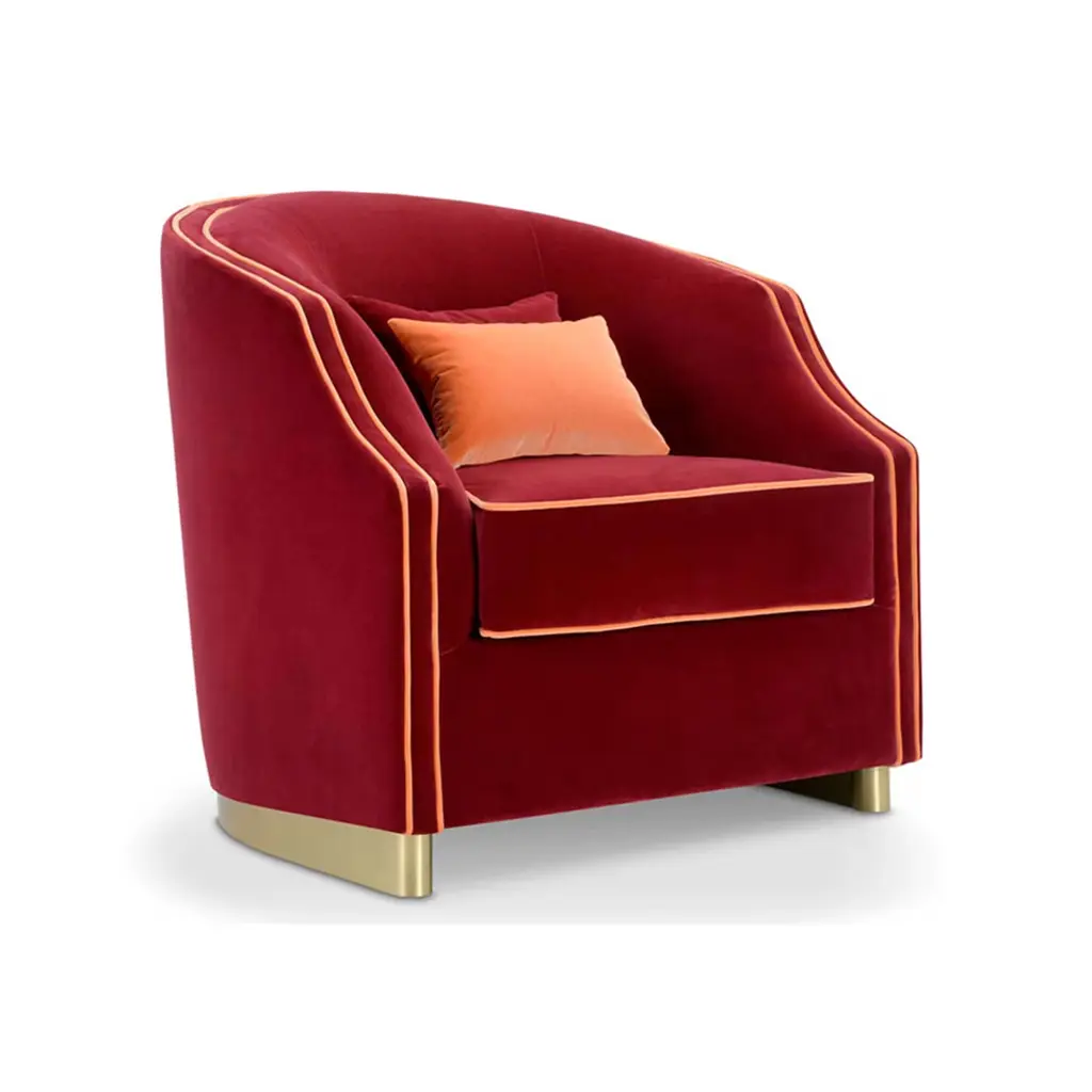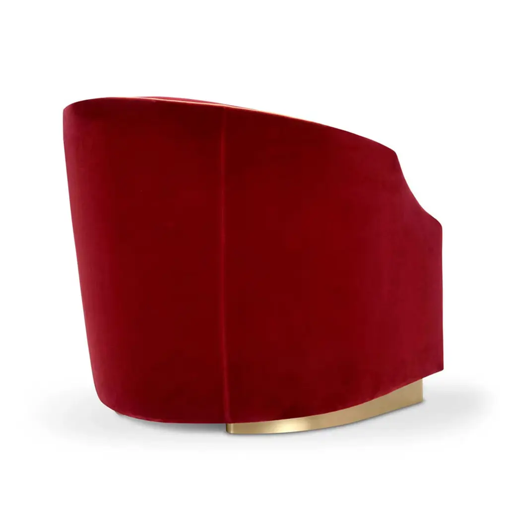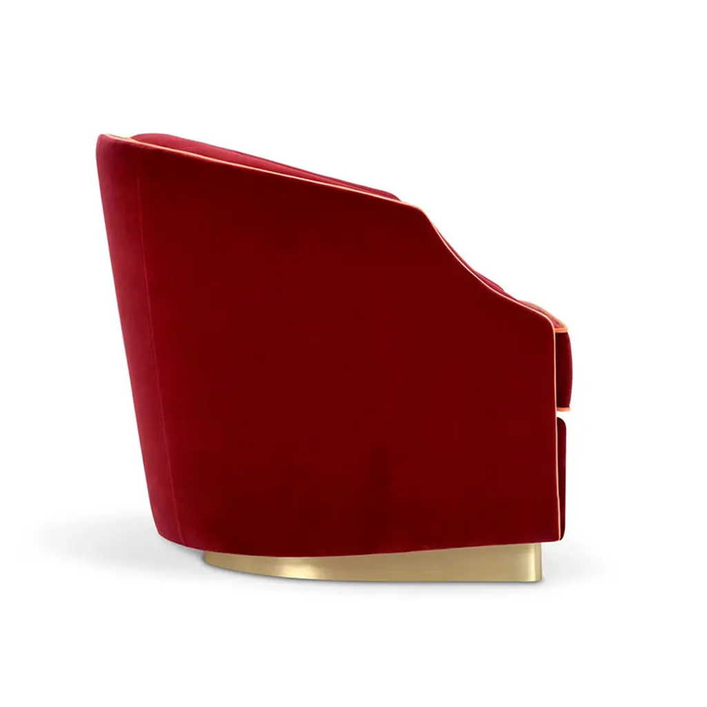 The perfect accent piece complement classic decors, this regal armchair enchants with its burgundy velvet upholstery and contrasting light hems that accent the flowing silhouette. The smooth structure forming the enveloping backrest frames the plush seat, which is raised on a semi-circular metal base with a luminous finish. Entirely handcrafted and incuding a sophisticated decorative cushion, the design is also available in a bed variant upon request.