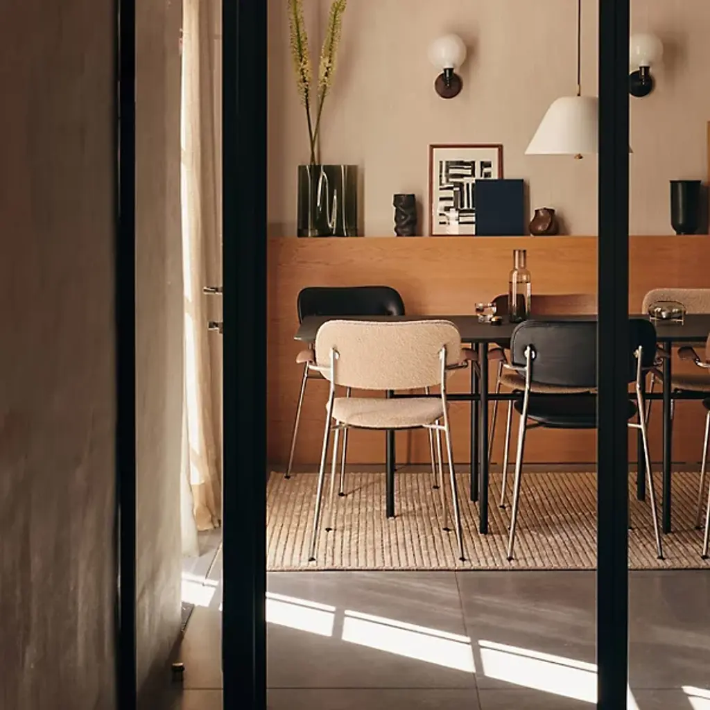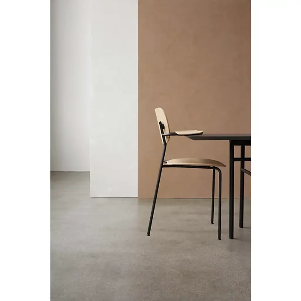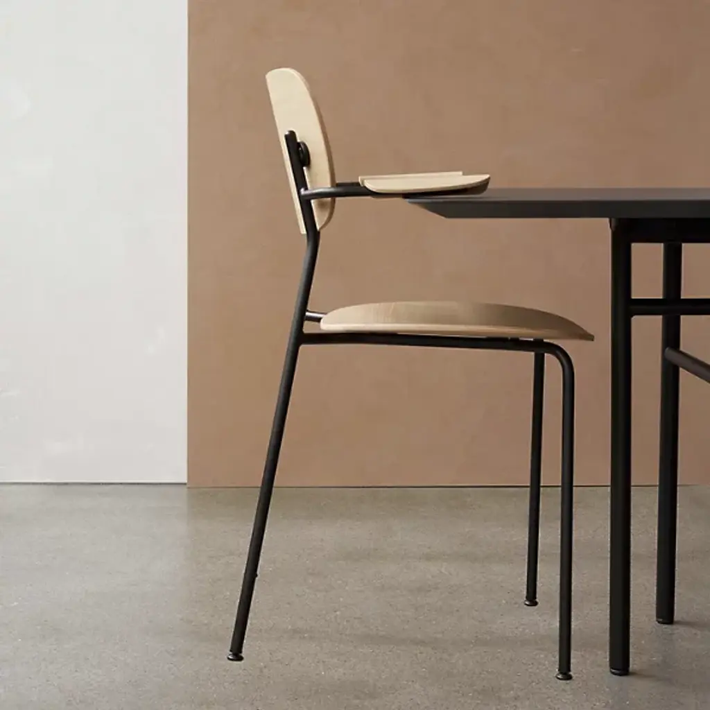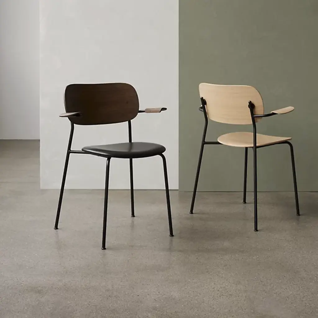 The Co Armchair, Non-Upholstered from Audo Copenhagen provides a smooth accompaniment to surroundings. Designed by Norm Architects and made with sustainably harvested wood elements, its open frame of chromed and welded steel offers strong and sturdy support with a welcome minimalist design language. The armchair is both strong and stackable, with a seat and back that each curve slightly inward, contrasted with outflung armrests, all made of pressed plywood with an engaging wood veneer exterior. The smooth surfaces of the metal contrast with the subtle woodgrain to add a welcome natural element to the otherwise direct design.