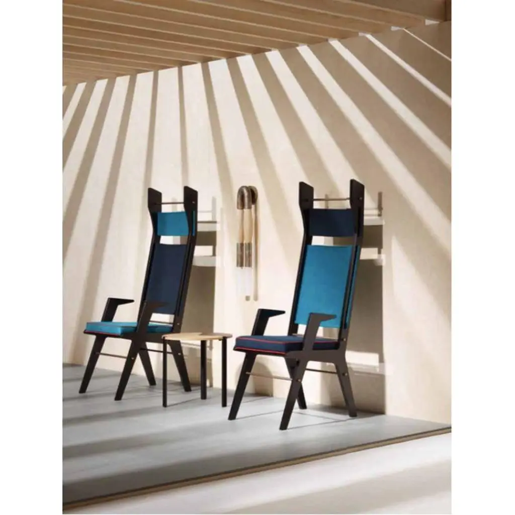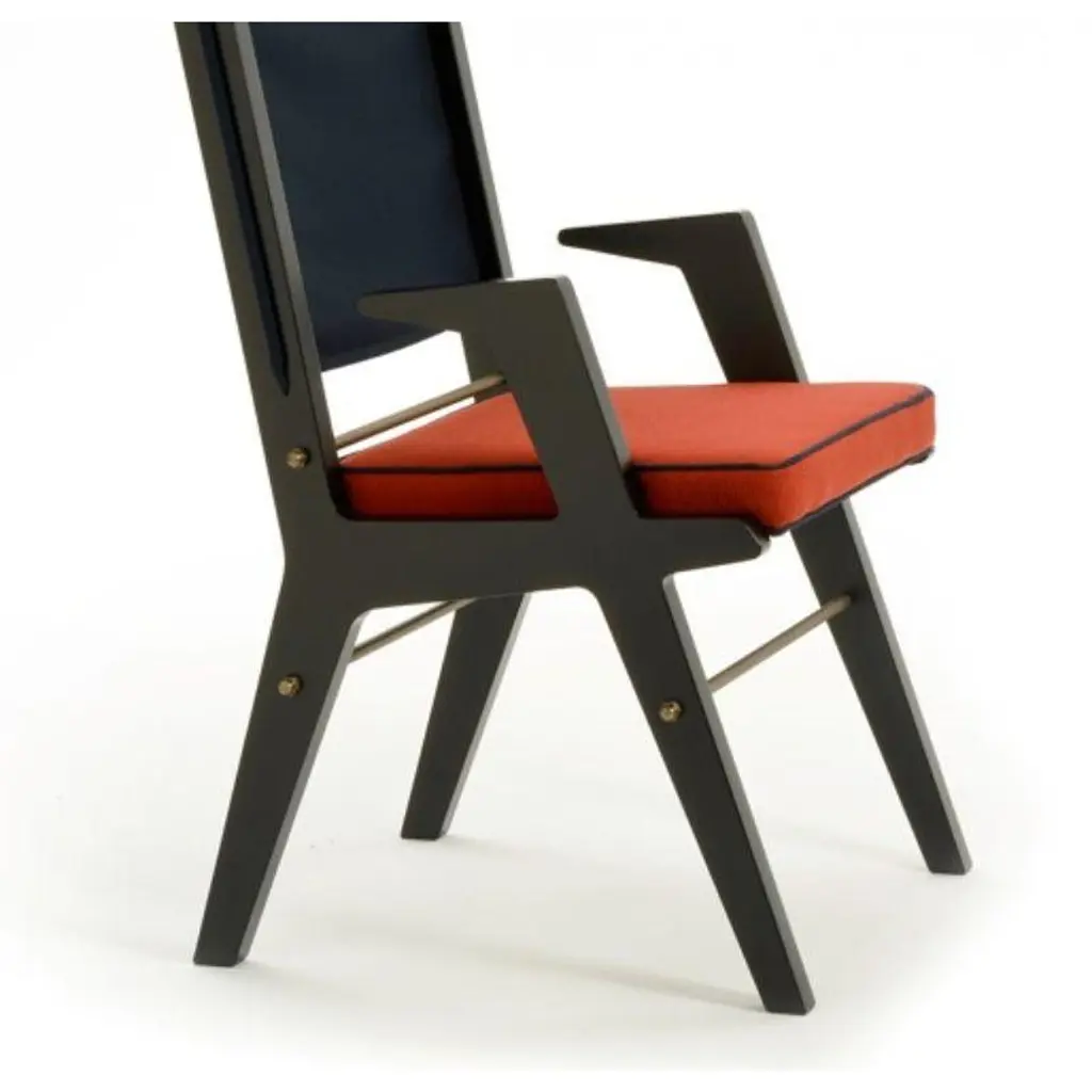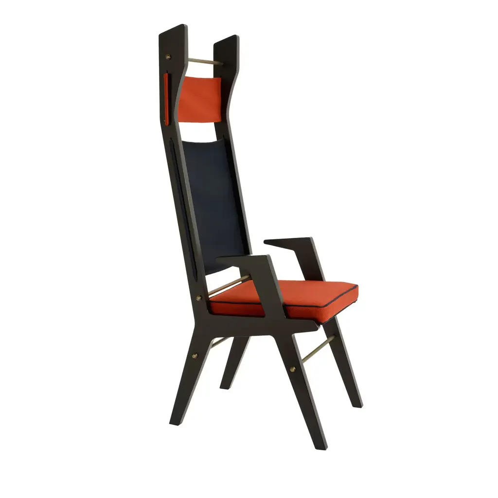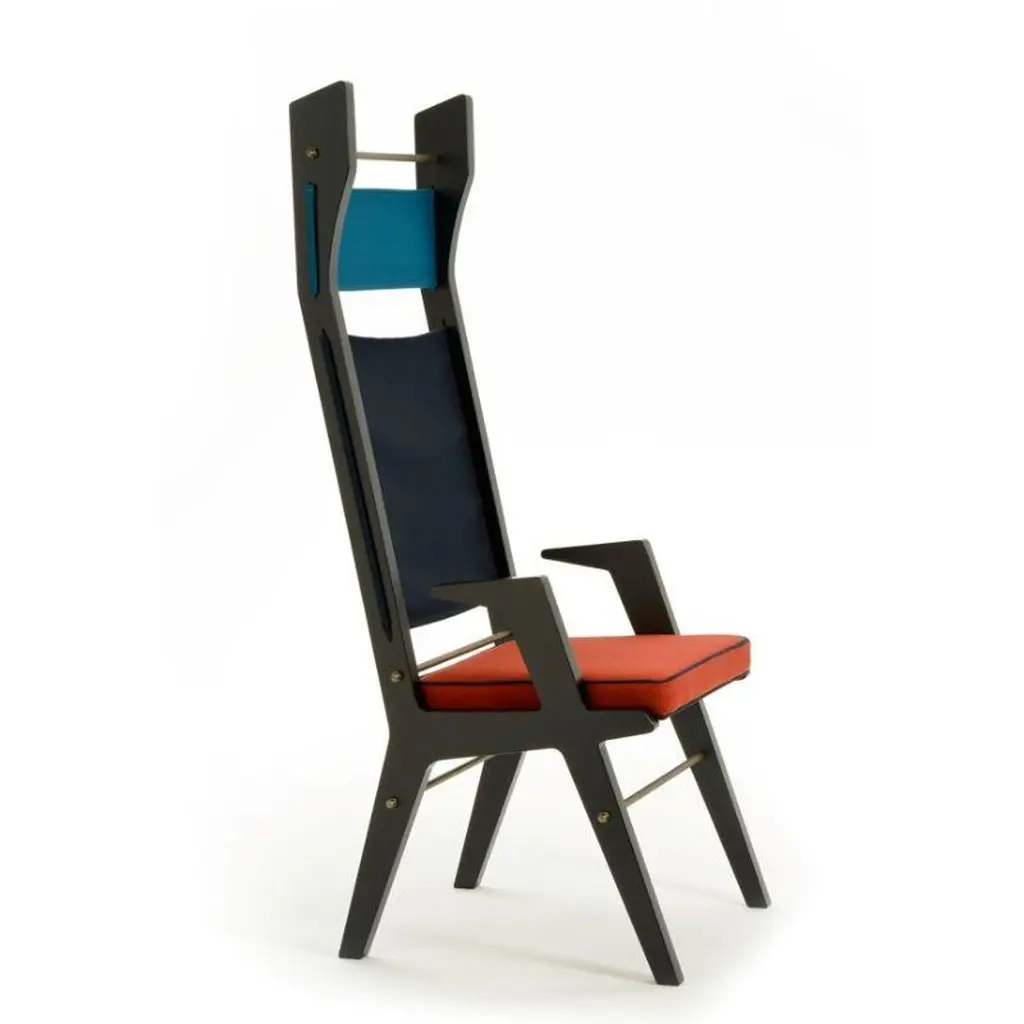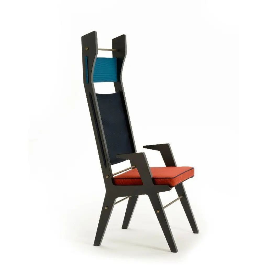 Colette armchair Tourquoise - blue - red by Colé Italia with Lorenza Bozzoli.(custom made product)Dimensions: H.157 D.66,5 W.55 cm.Materials: high back little armchair in MDF black lacquered structure; upholstered seat and back.Also available: different colors and materials.TC: C.O.M. fabric - send us your own materialCA: Cat A - Angel (polypropylene), Ganesha (synt. leather), Nord Wool (felt)CB: Cat B - Tiffany (polyestere), Lana (aquaclean)CC: Cat C - Velvetforthy (Velvet), Topia (wool), Novum (Wool), Opera (felt)CP: Cat P - Milano (full grain leather)A chair that stands out with the expressive power of a majestic contemporary Tudor throne. Armrests outline giant commas that support the grammar of its sign. The high back raises strongly awaiting for The Queen. Structure in black lacquered MDF. Sitting, back and headrest are upholstered and covered with customized wool fabric. In this pictures, a combination of dragon blood red, indigo blue and turquoise tones, with contrasting rat tail cord. Can be coated with C.O.M. fabric. Colé is a young Italian design brand, with a high-end production 100% made in Italy. Born from the experience of Matteo De Ponti, architect, who grew up in one of the most outstanding Milanese design families, and the artistic sensibility of Laura Macagno, degree in Economics and passionate of art and design. Our Mission is to create design icons, beautiful and comfortable pieces that can Stand the test of time, furnishing houses of international and sophisticated clients, and realized with craftsmanship, thus unique. “We love objects which own deep roots, excellent quality, and a strong evocative power. Archetypal forms dressed with new beauty without losing their classical composure”.Our expressive research is inspired by the utopian force of Italian eminences grises architects and designers of the ’50s, the Scandinavian design, the Bauhaus, ethnic handcraft and houses of famous writers of the XX century, all different as a style but united by the intense soul of those who worked and lived there.