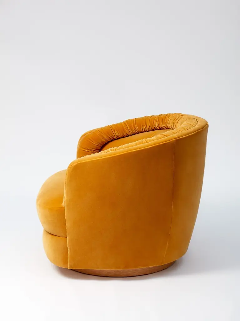 The Colosseo is an enveloping, pivoting armchair made with an oak structure, high-density foam for resiliency and feather topper for optimal comfort. Upholstered in sunburst yellow velvet (LG.FB-09) with a golden oak base.Made In France.