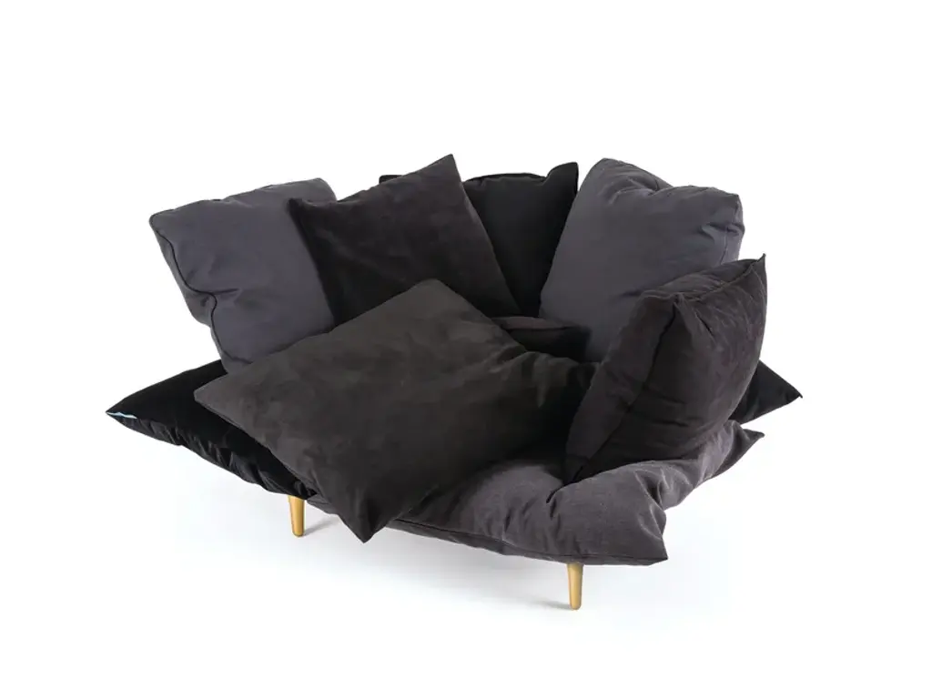 Oversize cushions become the sofa of excellence. A vision of outstanding comfort that becomes an aesthetic statement thanks to fabrics texture and shades of blue, white and black. A chair to sink into.Comfy is an upholstery collection created in collaboration with Marcantonio. An ode to comfort, with a soft nest of cushions nestled in both the sofa and armchair versions. "I tried to create the ideal piece. I remember playing as a child by building a hiding place on the couch using the seat and backrest cushions. I think we all share the same wish of wanting to be enveloped in a soft nest where the cushions can be placed however we want" states the designer. The brass metal feet add value to the products, and are available in threecolorways, in a turquoise, white, and anthracite color range. The cushions that make up Comfy are made of different fabrics, whose motifs give rise to an interesting surface color contrast.