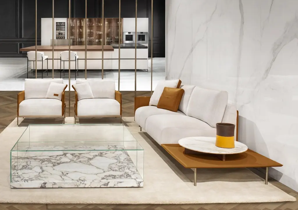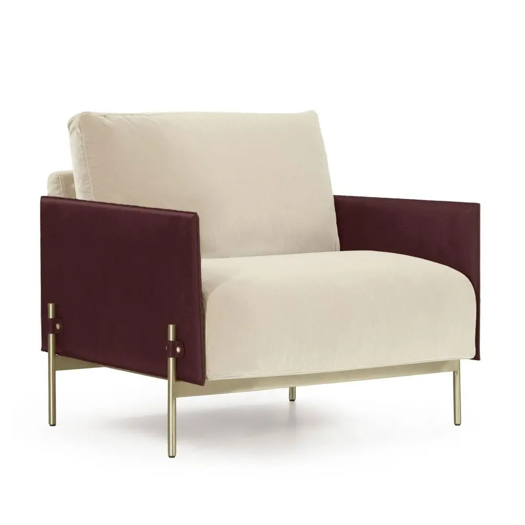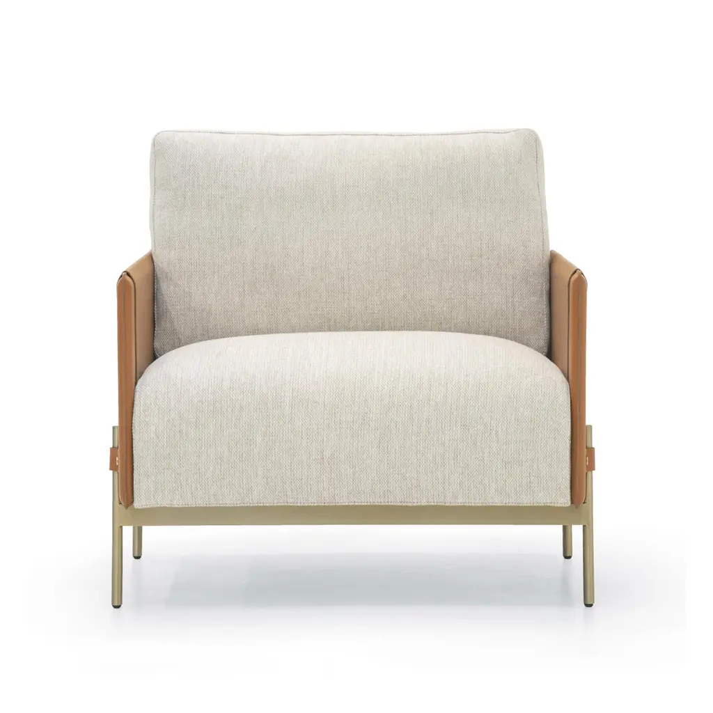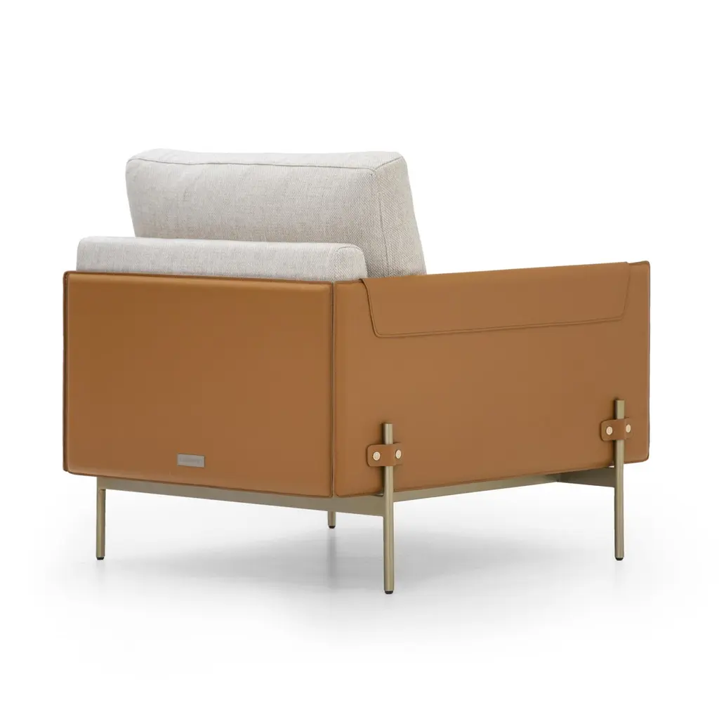 Iconic armchair V215 in saddle leather art. Cuoio col. Kestral Tan with fabric art. Brera col. 02 upholstery. and elegant metal structure in Light Gold finish, with ASTON MARTIN buttons.Clean design with extreme care for iconic details, premium natural materials,completely handmade, emphasize the uniqueness of this armchair.