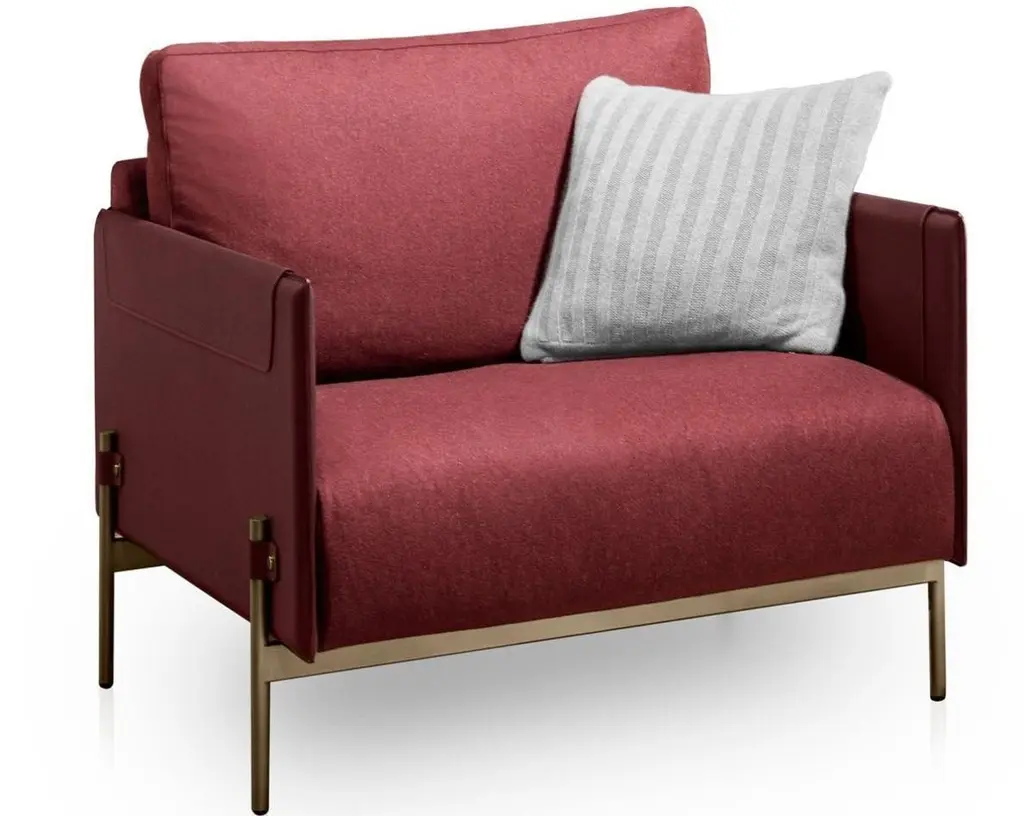 Iconic armchair V215 in saddle leather art. Cuoio col. Kestral Tan with fabric art. Brera col. 02 upholstery. and elegant metal structure in Light Gold finish, with ASTON MARTIN bottons.Clean design with extreme care for iconic details, premium natural materials,completely handmade, emphasize the uniqueness of this armchair.