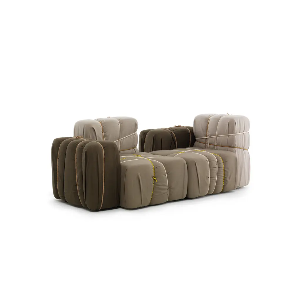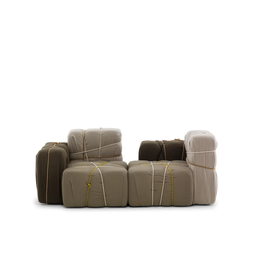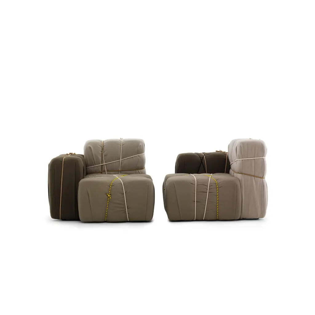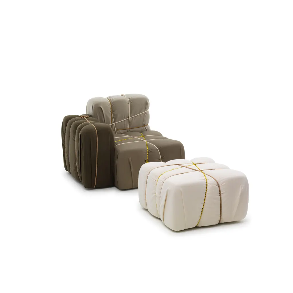 Contropakko is an upholstered armchair designed by Marcantonio Raimondi Malerba and inspired by the classic composition of paper boxes tied with ribbons and ropes, comfortable and playful it will suit in any environment. The armrest is only on the right.