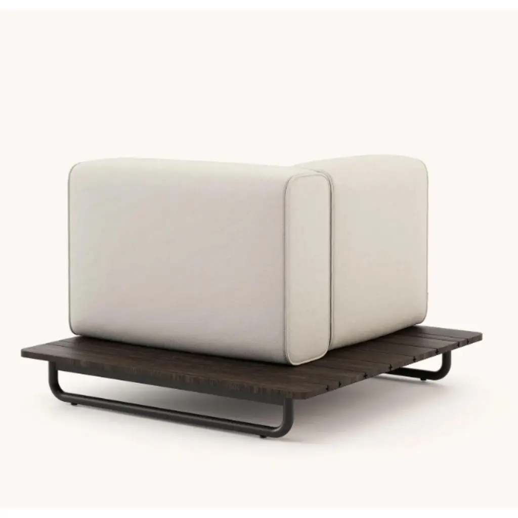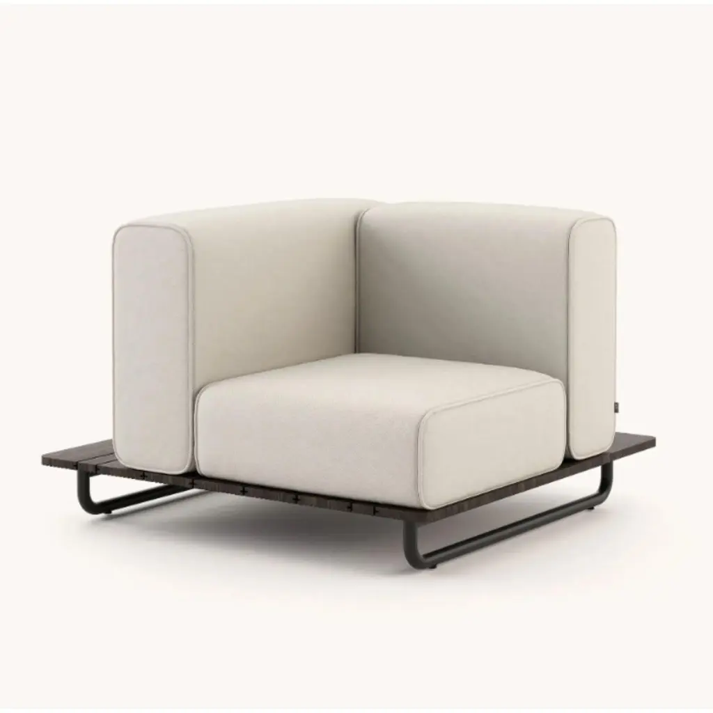 Copacabana armchair left by DomkapaMaterials: black texturized steel, bamboo wood, fabric (Rhine Ice).Dimensions: W 105 x D 105 x H 75 cm.Also available in different materials. The steel structure won’t oxidize, colors are treated to withstand the sun and the aesthetic is as strong as creativity allows. These are the characteristics of Copacabana Armchair: a piece that seduces for its personality.Domkapa holds a tremendous passion for detailed stitching, presenting several similarities to the haute-couture philosophy focused on the value of a “made by hand”. Based in Portugal, Domkapa was founded in 2009 as a Private Label. The long and fruitful path, full of experience and achievements inspired the brand’s new identity and independence, in 2017.Domkapa challenges its team to create the perfect daily meeting between design and comfort in each piece of the brand’s collections. Our design team works side by side with the production, and this organic synergy allows the creation of innovative designs.