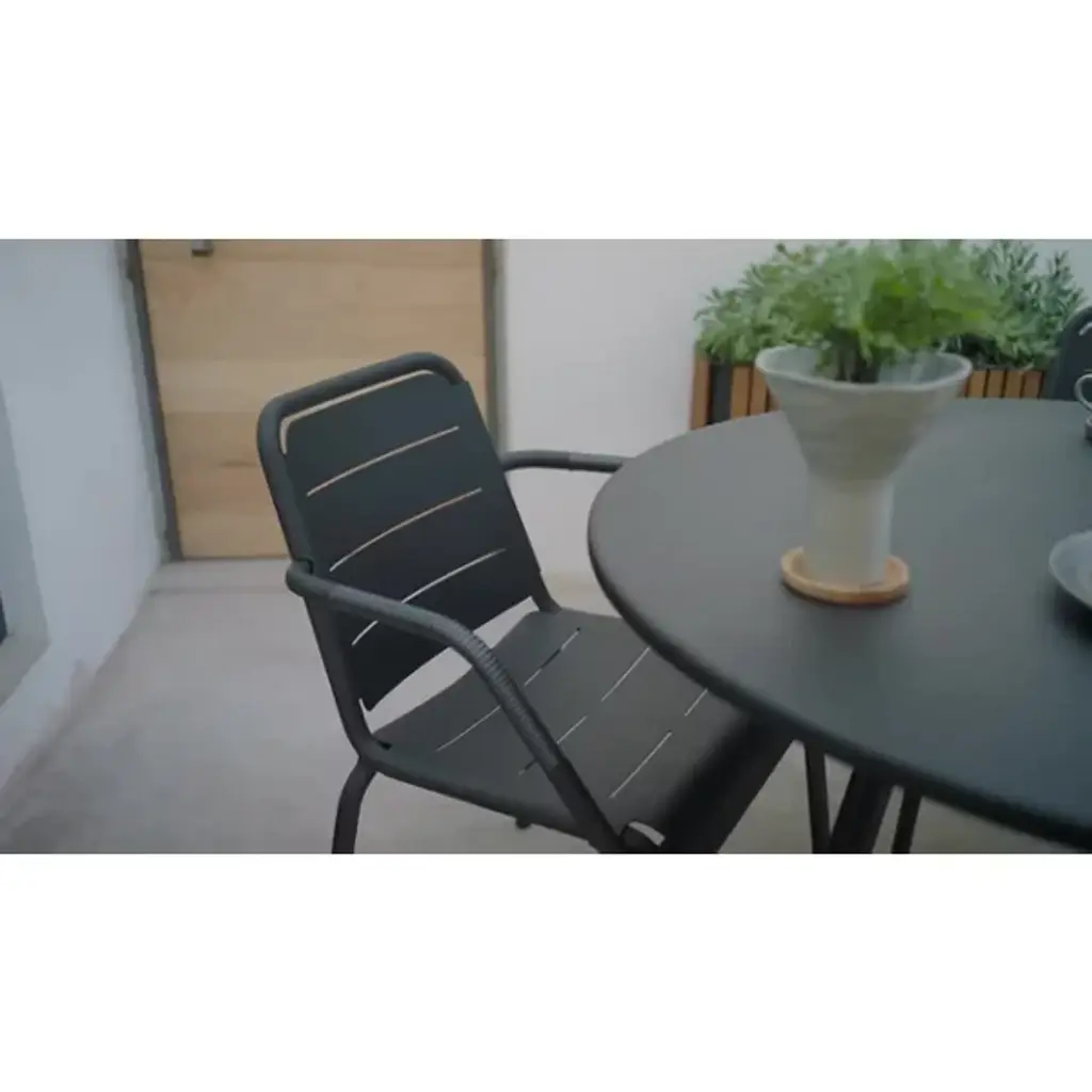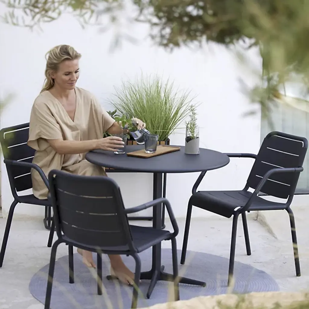 Give your outdoor seating arrangement a contemporary look with the Copenhagen Outdoor Stackable Armchair by Cane-line. This chair’s seat extends slightly over the edge of its durable aluminum frame. With contouring arms, you can stay in a relaxed position while seated. The Copenhagen Outdoor Stackable Armchair is made to withstand changes in outdoor weather conditions with ease. Meticulously designed for stacking, you can place this chair atop additional Copenhagen Outdoor Stackable Armchairs for quick storage.