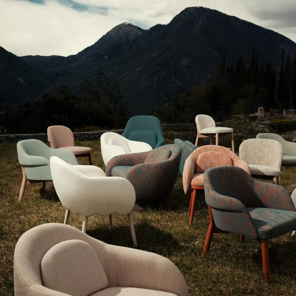 The delicate shape of flower corollas inspired this splendid armchair from the Corolla series, stunning in its scalloped lower profile, which seals the contours of the enveloping seat also incorporating the sloping armrests. The slanted legs in solid, whitened-finished beech also echo naturalistic elements with their silhouette bulging at the feet and reminding of flower stems. A bold mustard upholstery extensively adorned with an intricate green pattern seals the piece. Seat height is 44 cm.