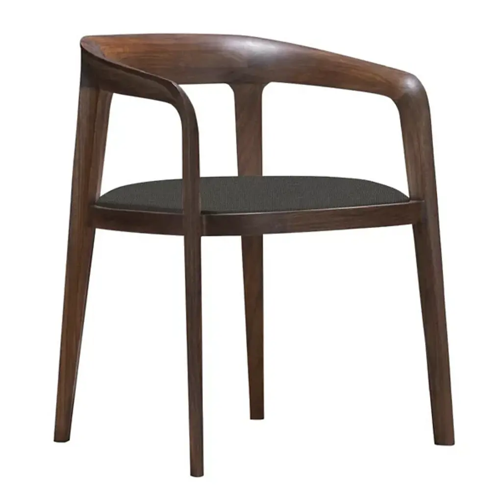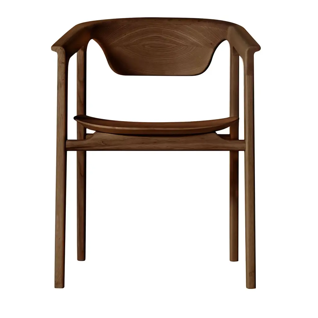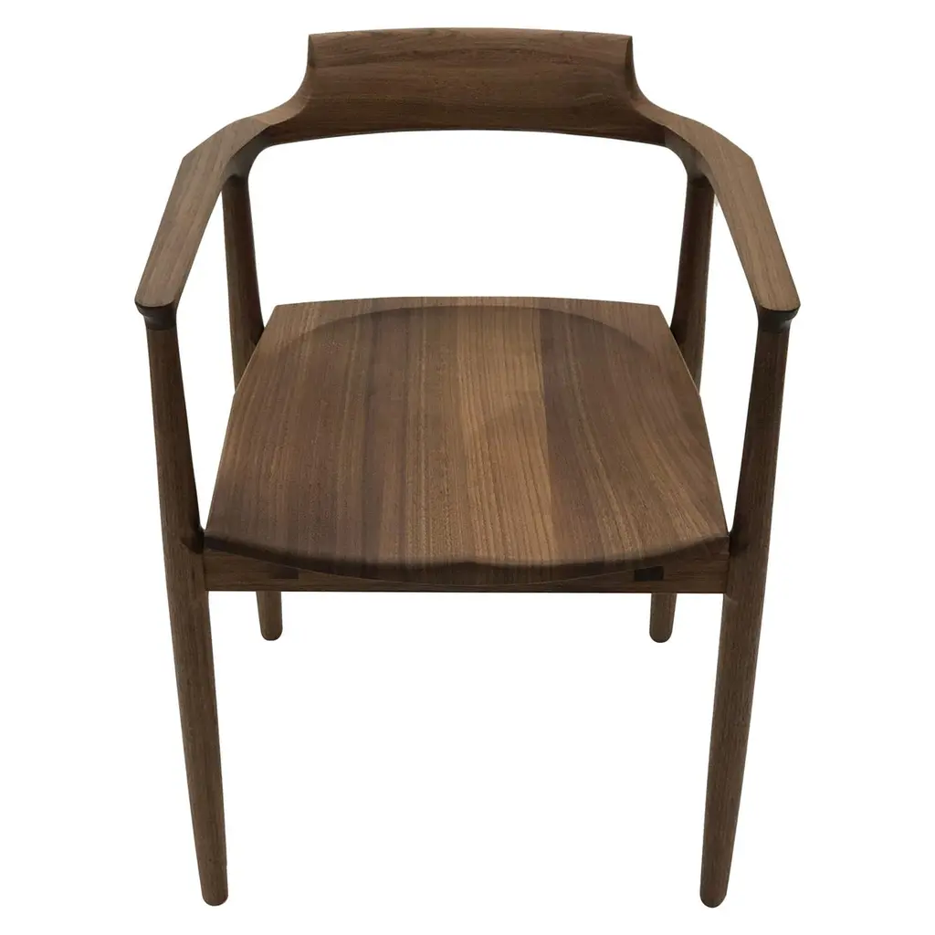 The Corvo Armchair from Bernhardt Design presents a study in contrasts, where inner curves nestle within an external angular framework. This dual geometry creates depth and visual complexity as each viewing angle reveals different relationships between the chair's curved and straight elements. Handcrafted from American walnut, the piece demonstrates how Noé Duchaufour-Lawrance's traditional craftsmanship can produce modern results. The interplay between the wooden structure and the upholstered seat establishes a material dialogue, with natural oil finishes highlighting the wood's grain, while soft cushioning provides functional comfort within the geometric composition.