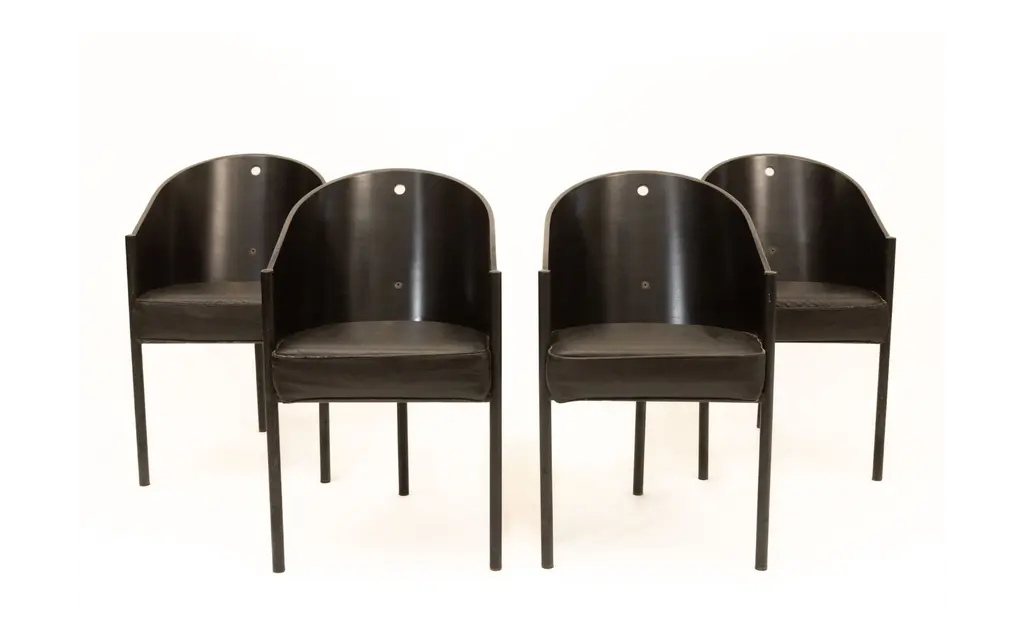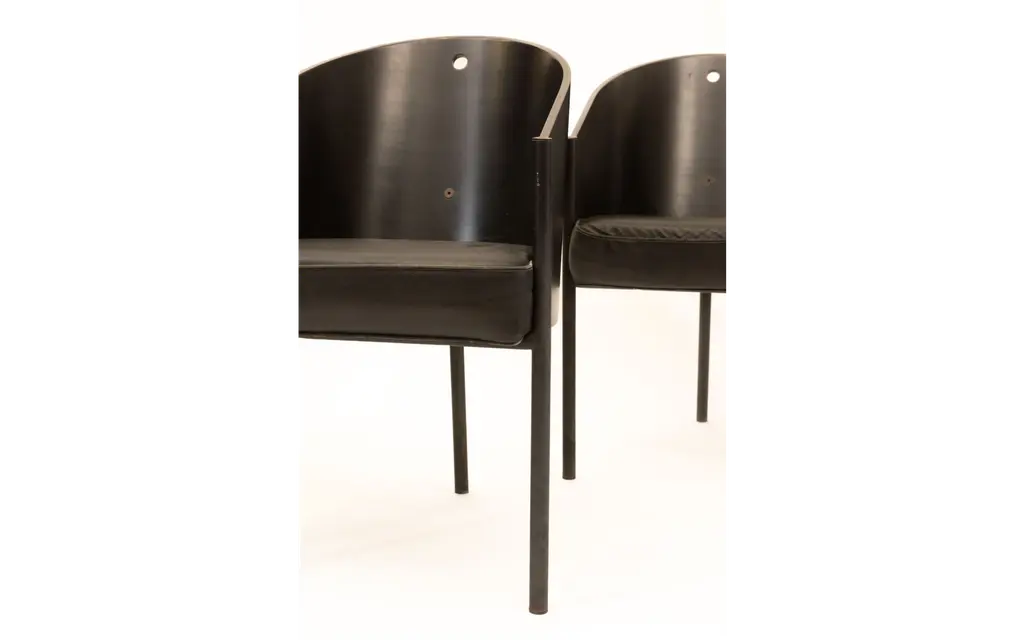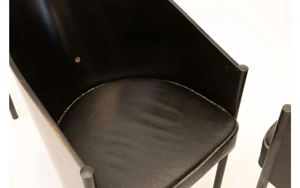 A set of Costes chairs designed by the renowned French designer Philippe Starck (1949-). The "Costes" chair was used by Starck in 1981 to furnish the famous Café Costes, located on Place des Innocents in the first arrondissement of Paris, and was characterized by the use of highly functional, durable models and simple materials. Starck designed it with a tripod base to prevent it from becoming too bulky and hindering the movement of waiters. The wider armchair, based on the tripod design of the Costes chair, was created the following year for French President Mitterrand's office at the Élysée Palace, a project to which Starck owes much of his popularity. This piece is attributed to the mentioned designer/maker. It has no attribution mark and no official proof of authenticity, however it is well documented in design history. I take full responsibility for any authenticity issues arising from misattribution