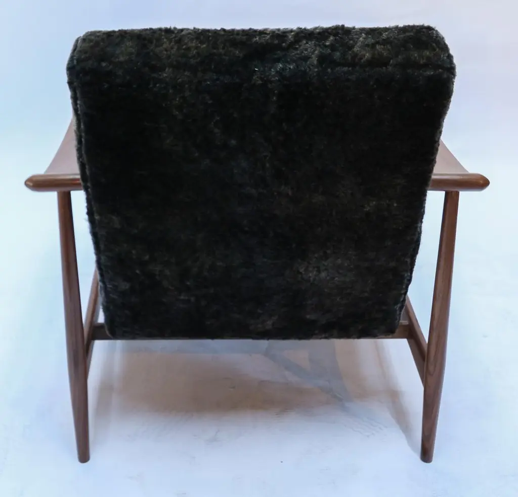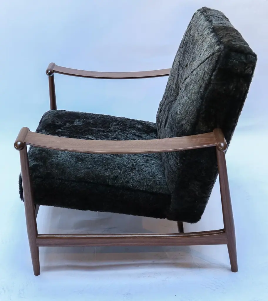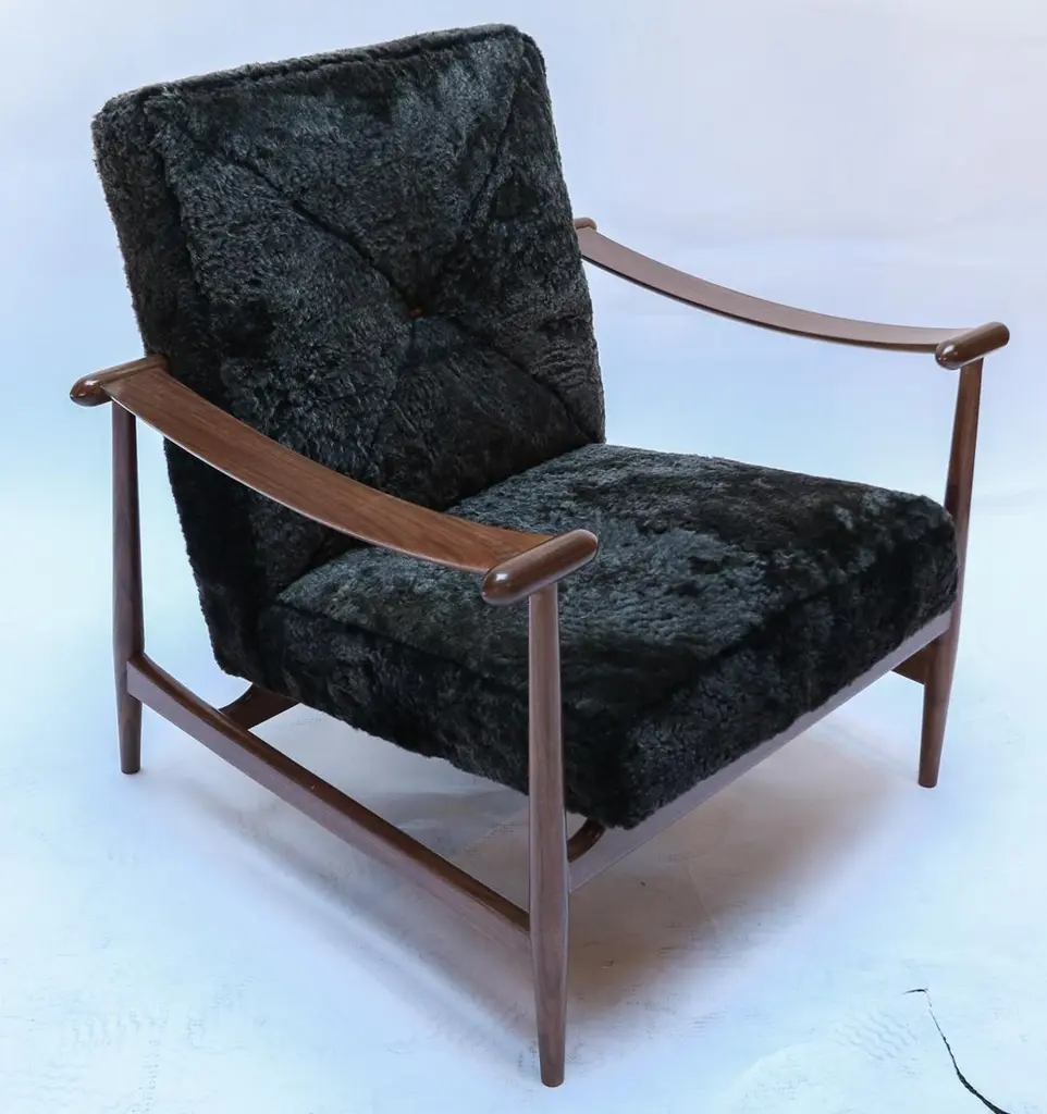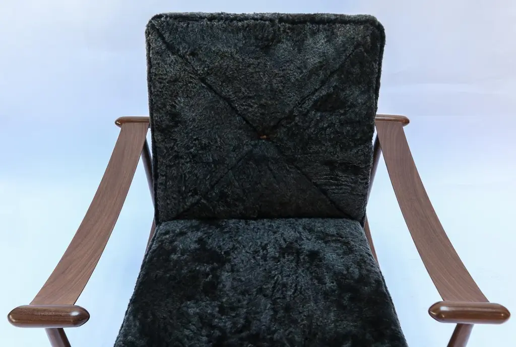 Custom Walnut Midcentury Style Armchairs In Black Sheepskin By Adesso Imports