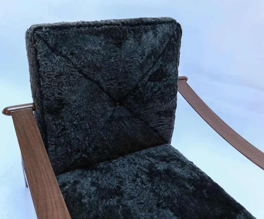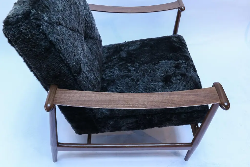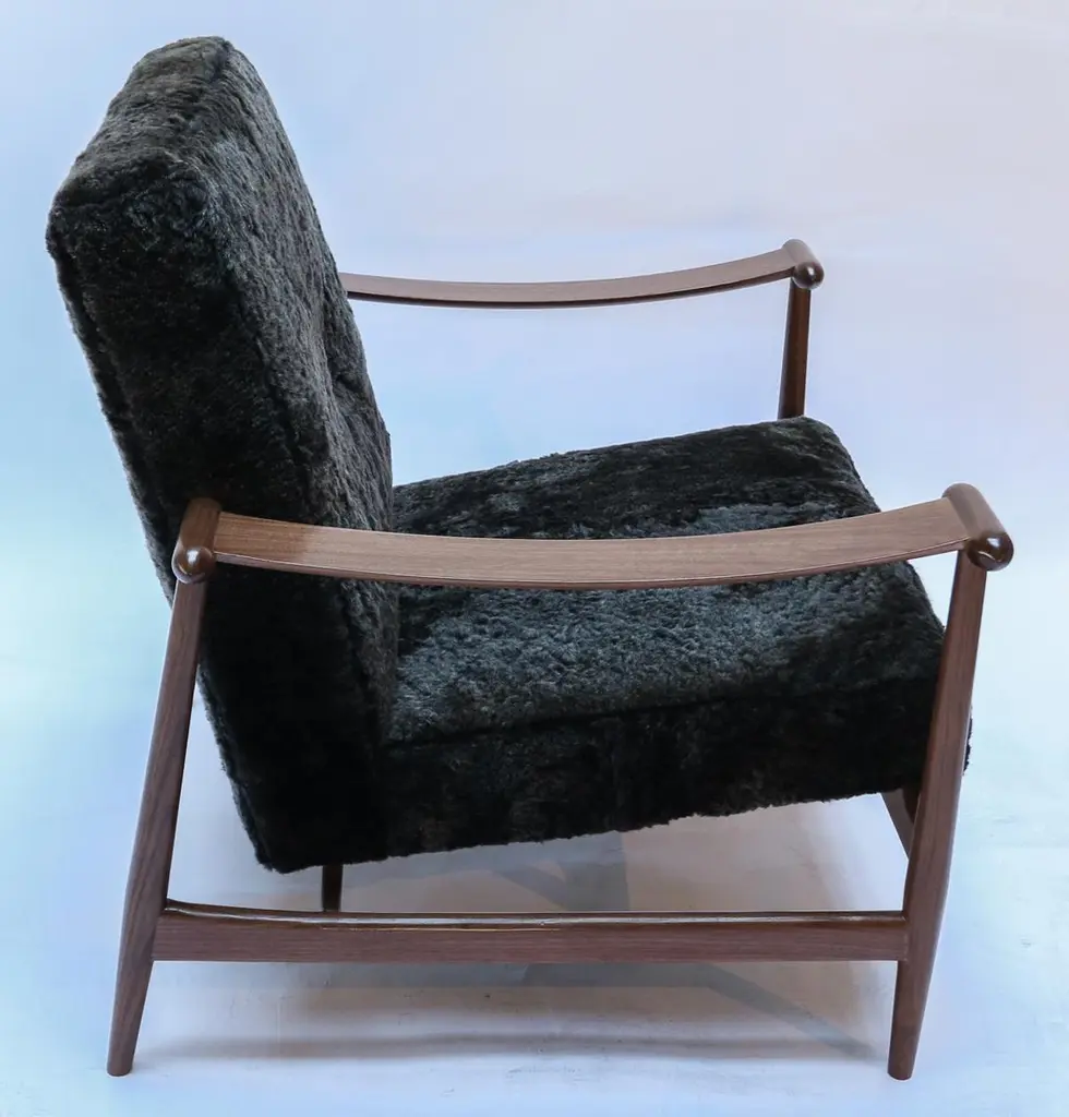 Pair of custom midcentury style armchairs in American Walnut with black snow top sheepskin upholstery and decorative toggle. Made in Los Angeles by Adesso Imports. Can be done in different colors and woods.